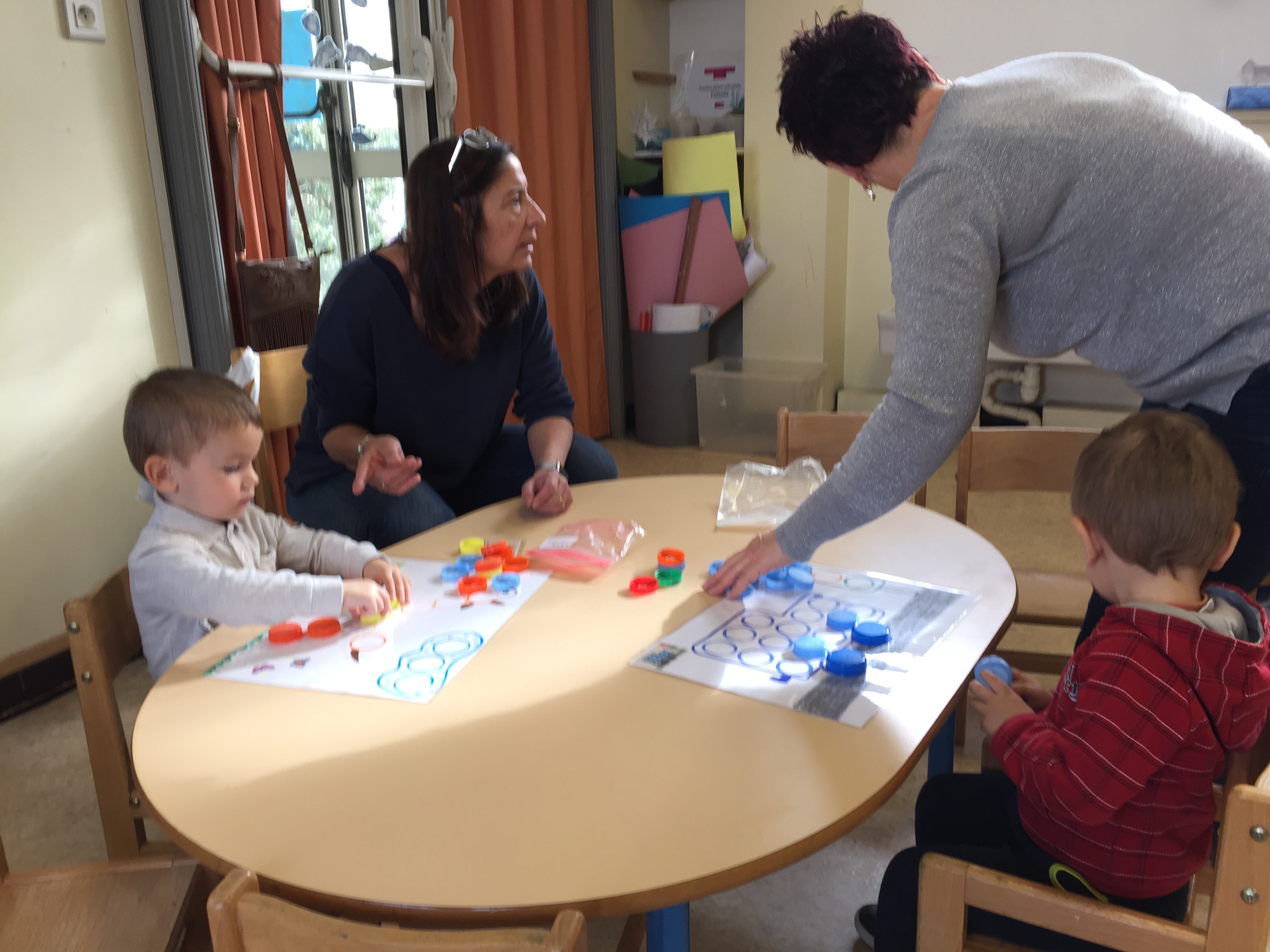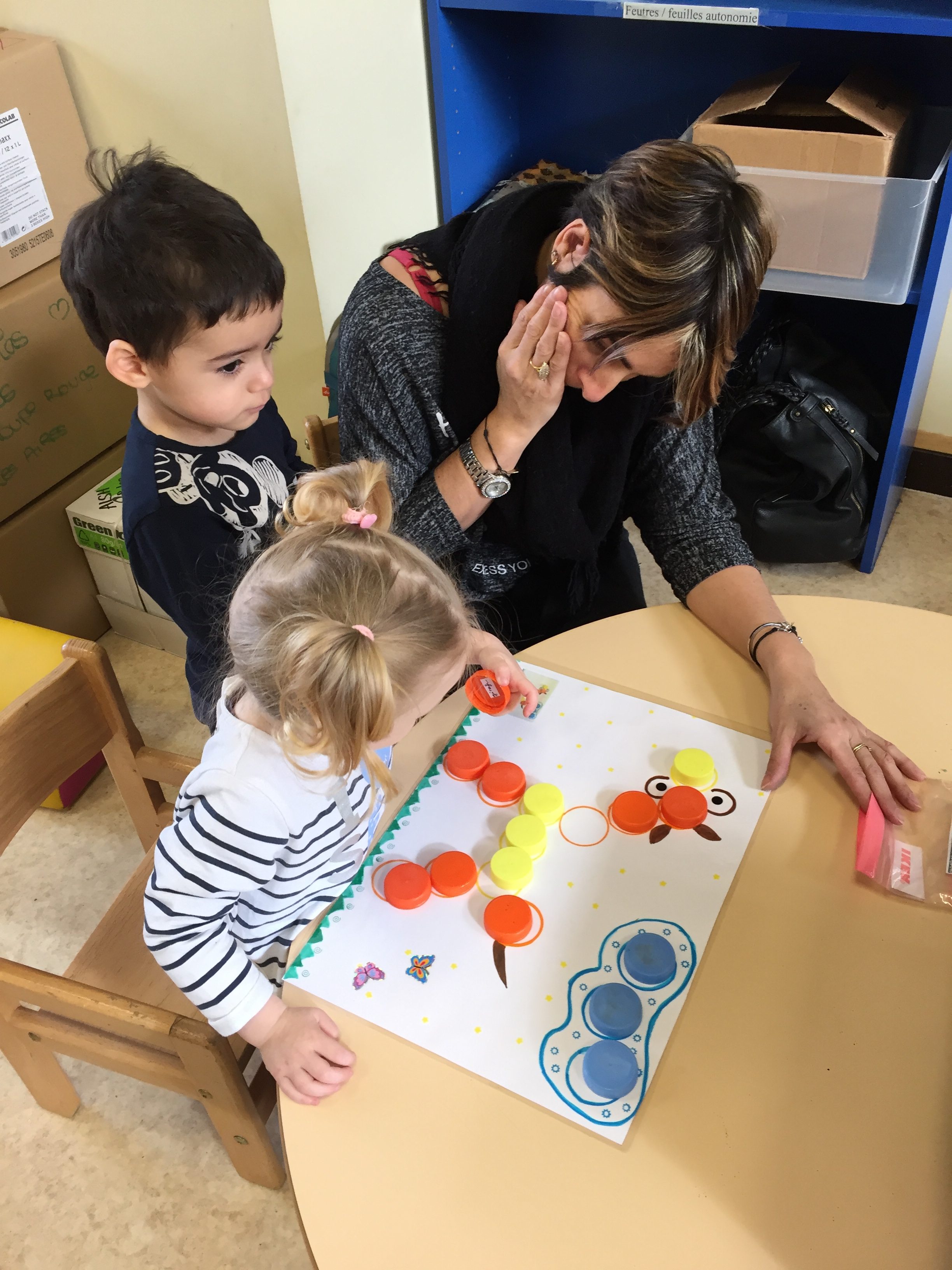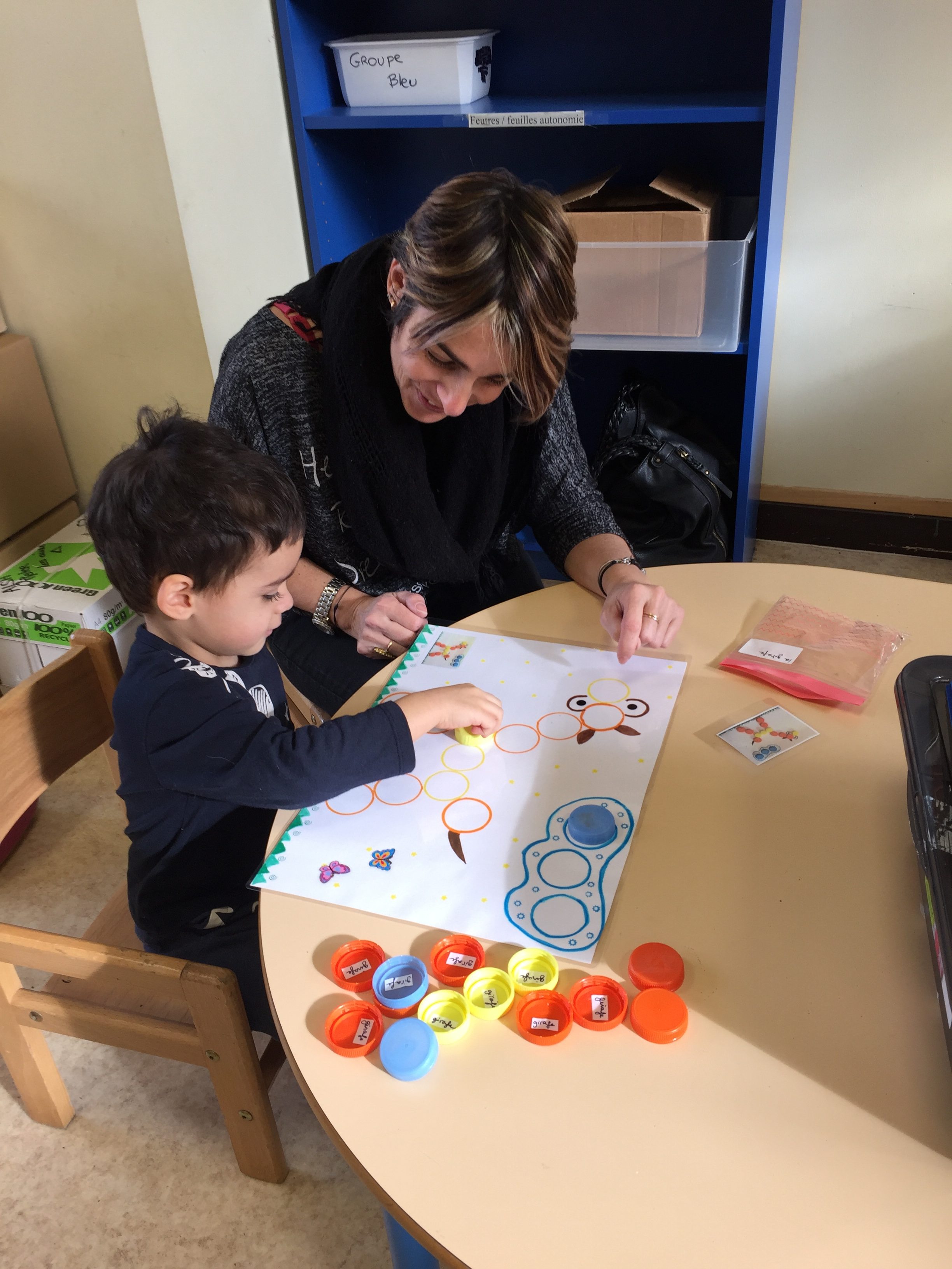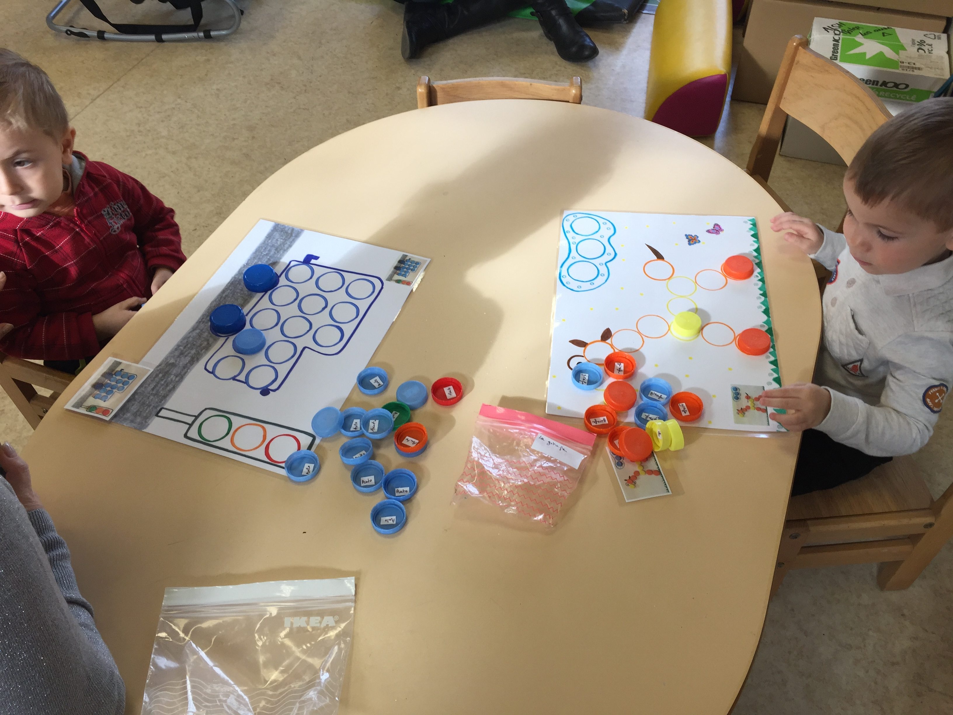 ensuite nous avons joué au memory réalisé avec des bouchons toujours, on y colle 2 pastilles de même couleur, le but du jeu est d’arriver à trouver les 2 bouchons de la même couleur, pas simple, toujours dans l’esprit de jouer en apprenant les couleurs.