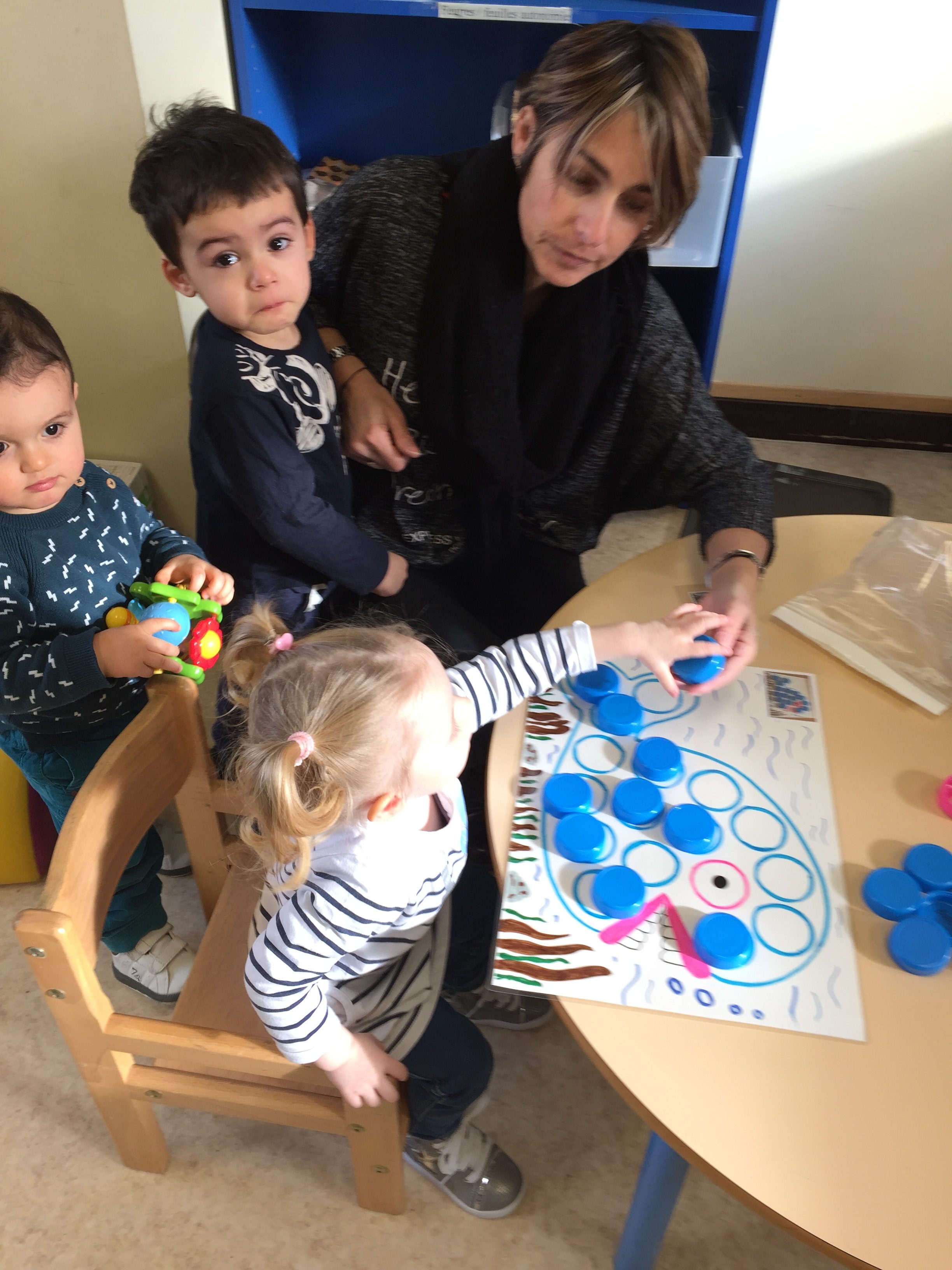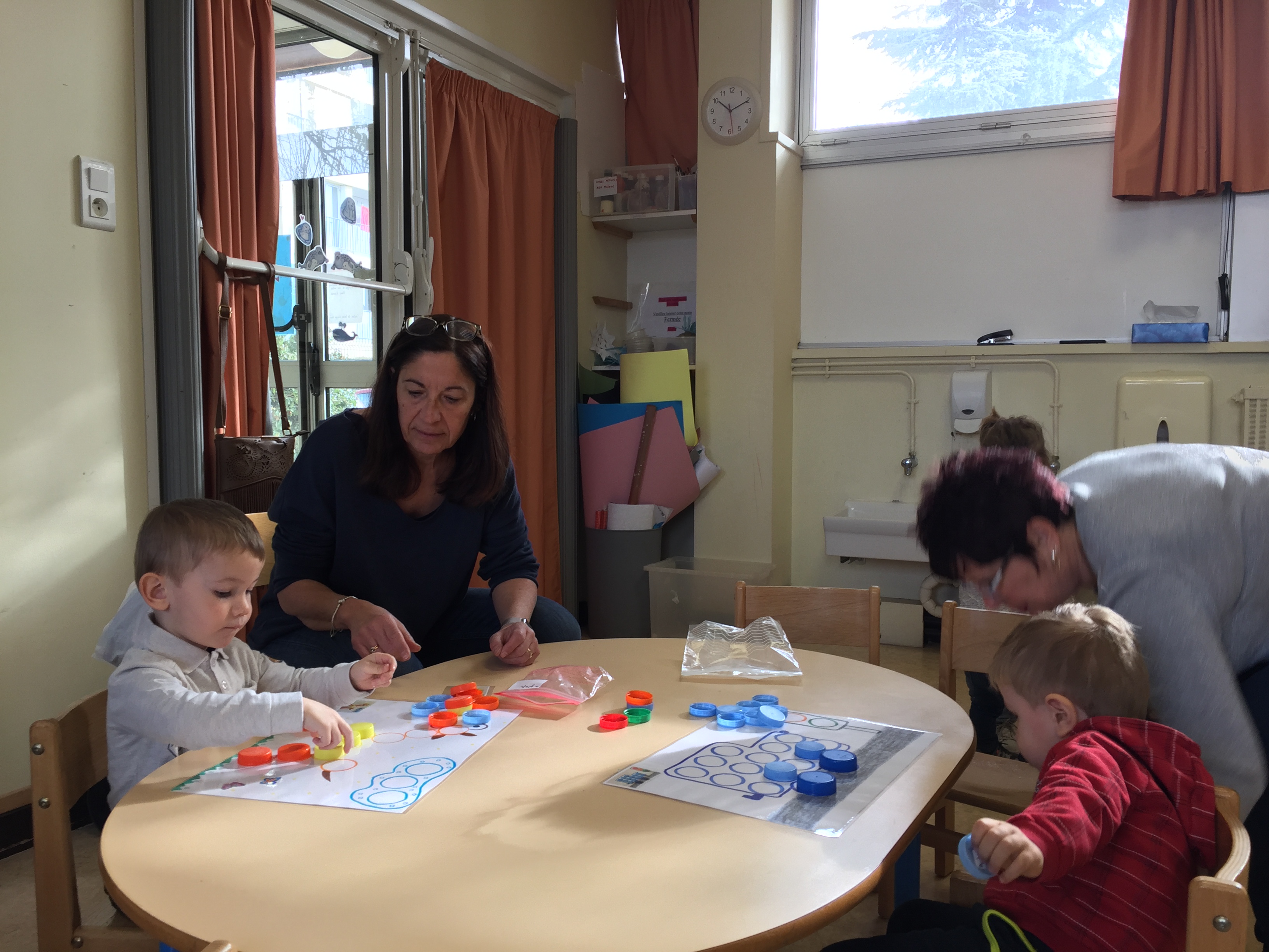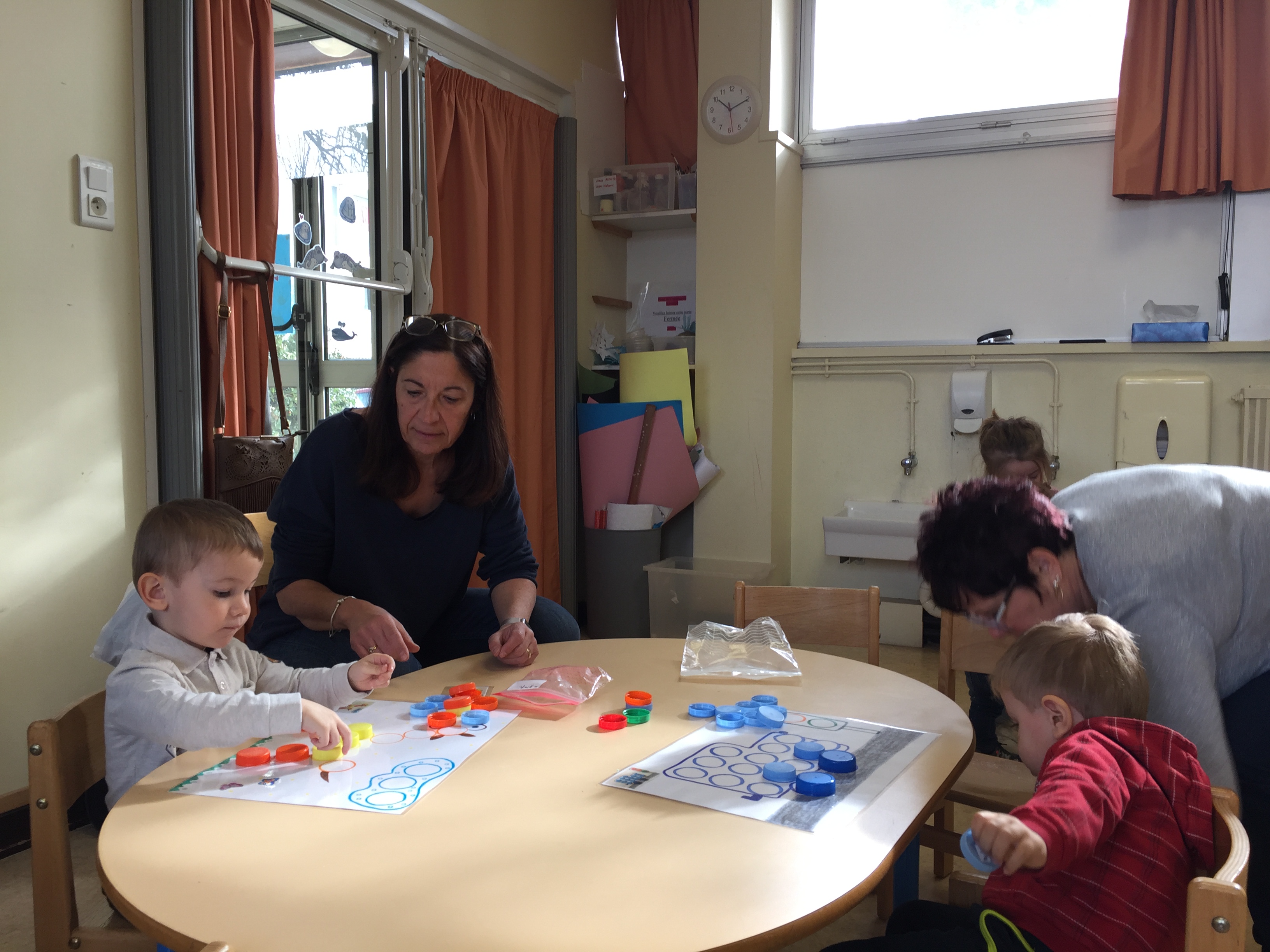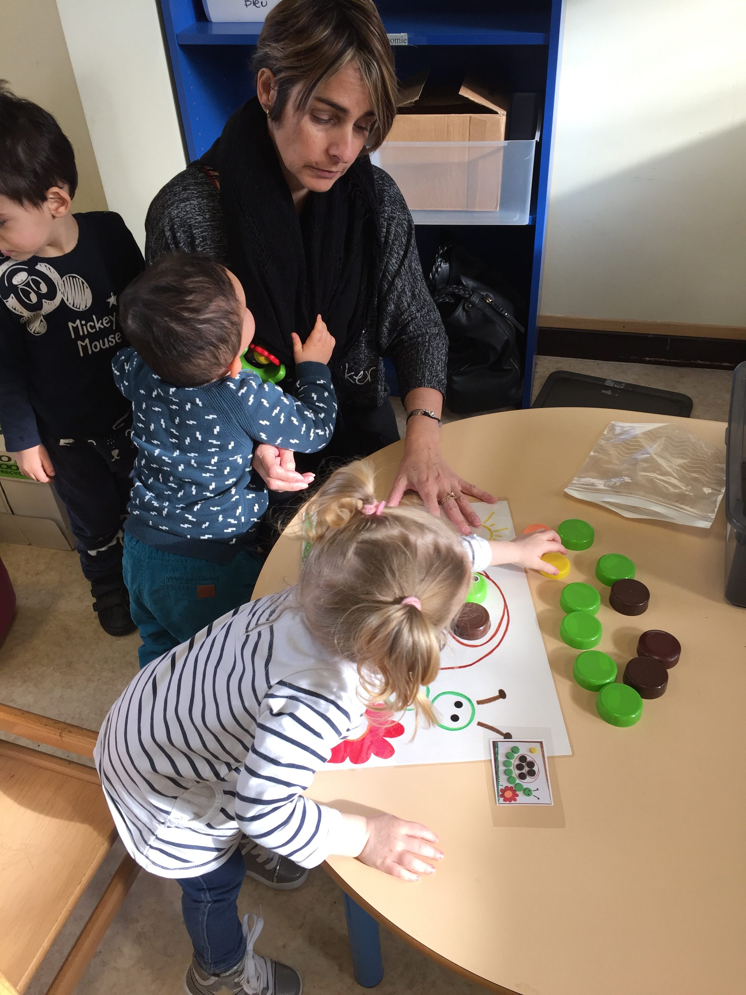 ensuite nous avons joué au memory réalisé avec des bouchons toujours, on y colle 2 pastilles de même couleur, le but du jeu est d’arriver à trouver les 2 bouchons de la même couleur, pas simple, toujours dans l’esprit de jouer en apprenant les couleurs.