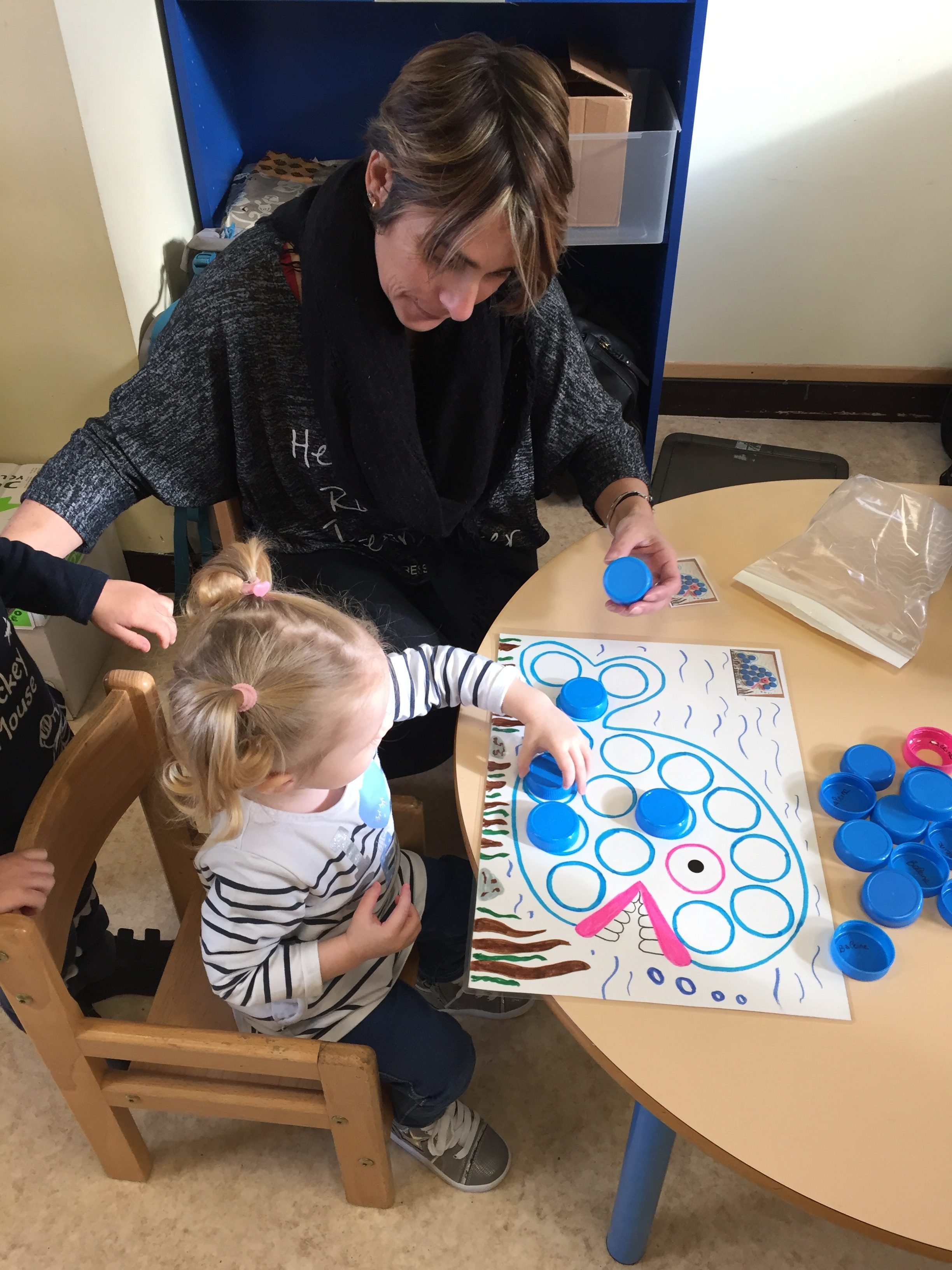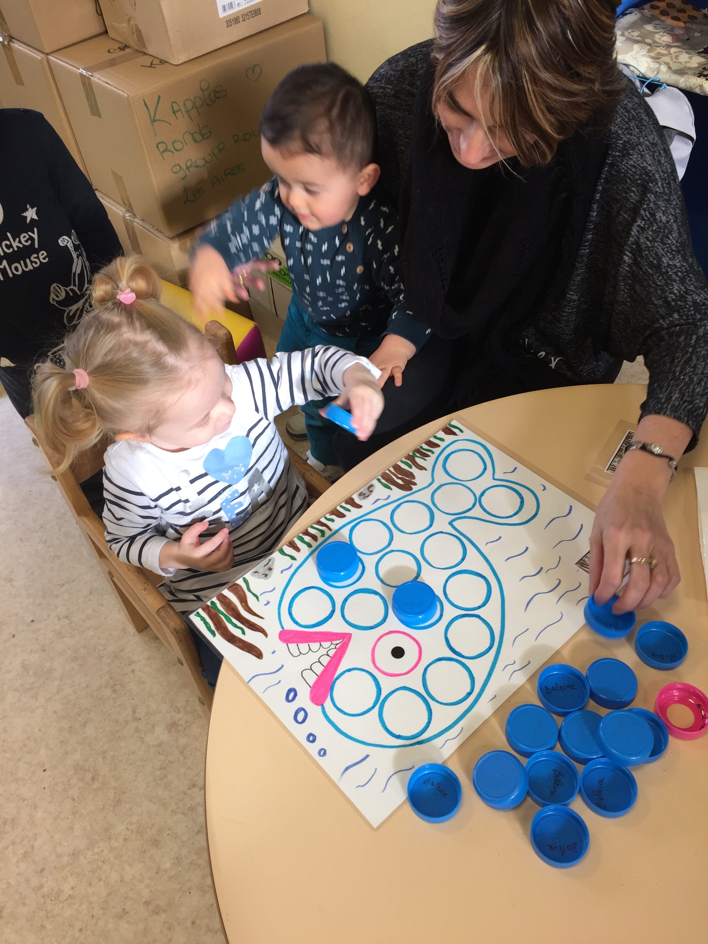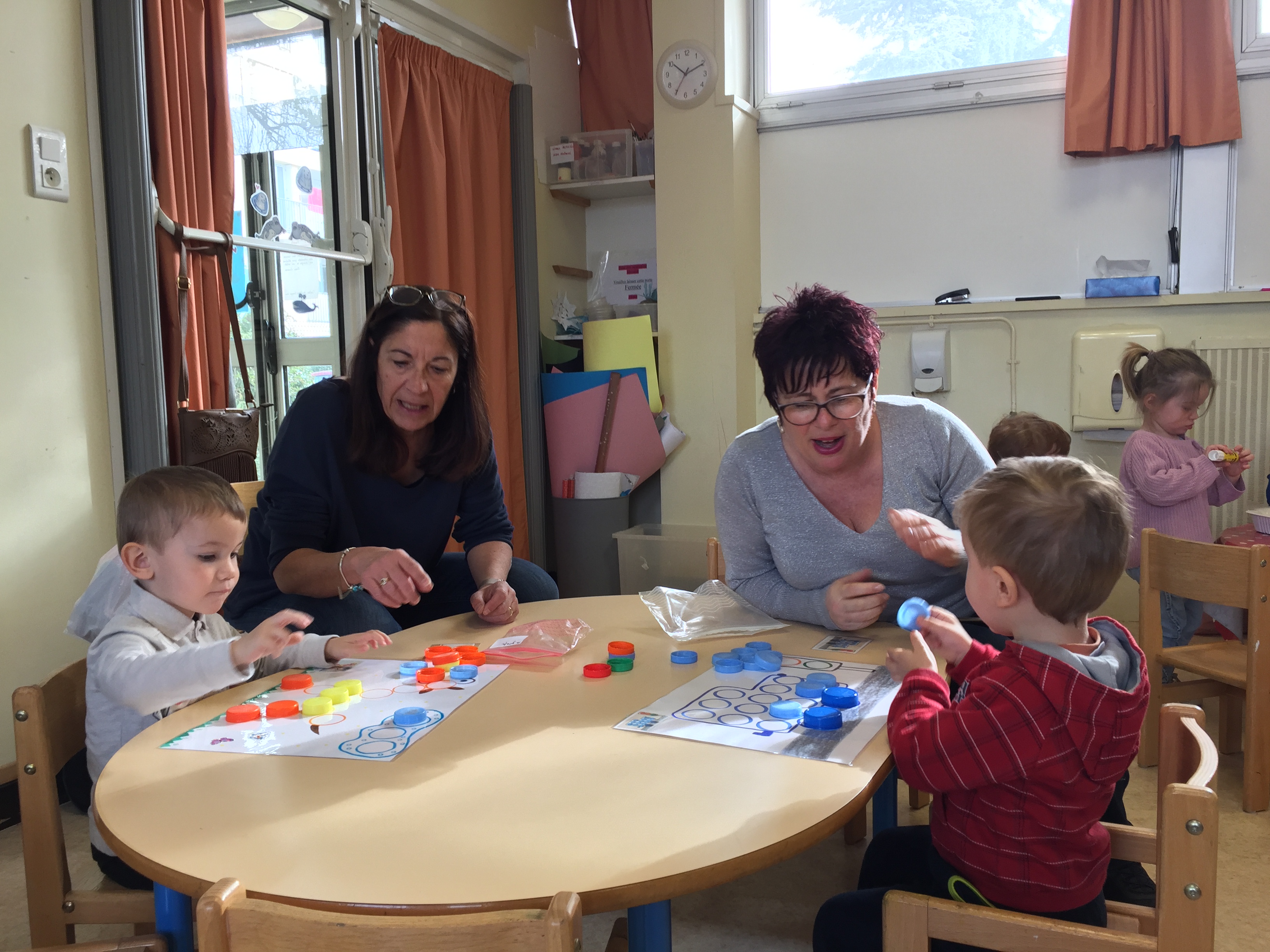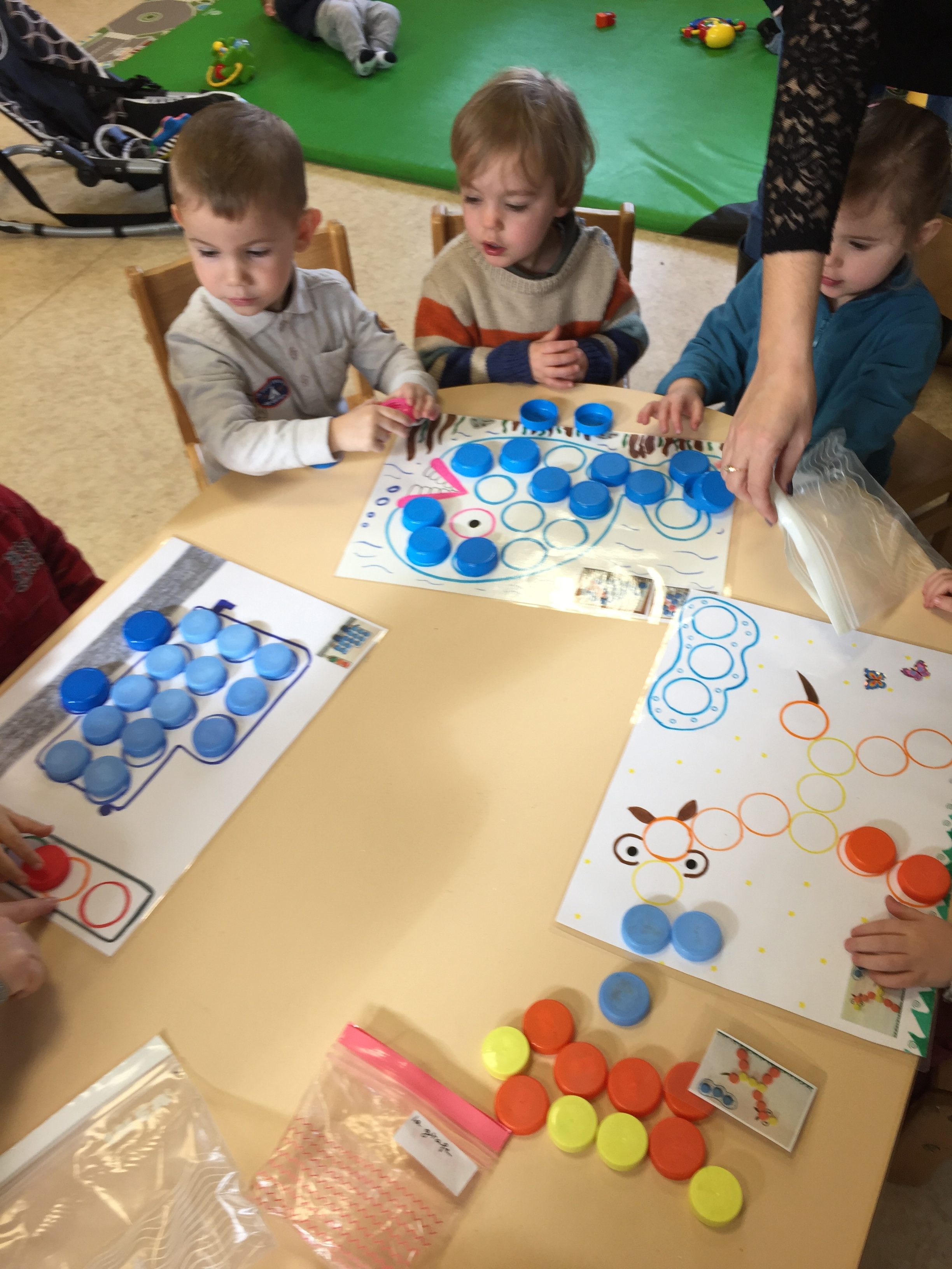 ensuite nous avons joué au memory réalisé avec des bouchons toujours, on y colle 2 pastilles de même couleur, le but du jeu est d’arriver à trouver les 2 bouchons de la même couleur, pas simple, toujours dans l’esprit de jouer en apprenant les couleurs.