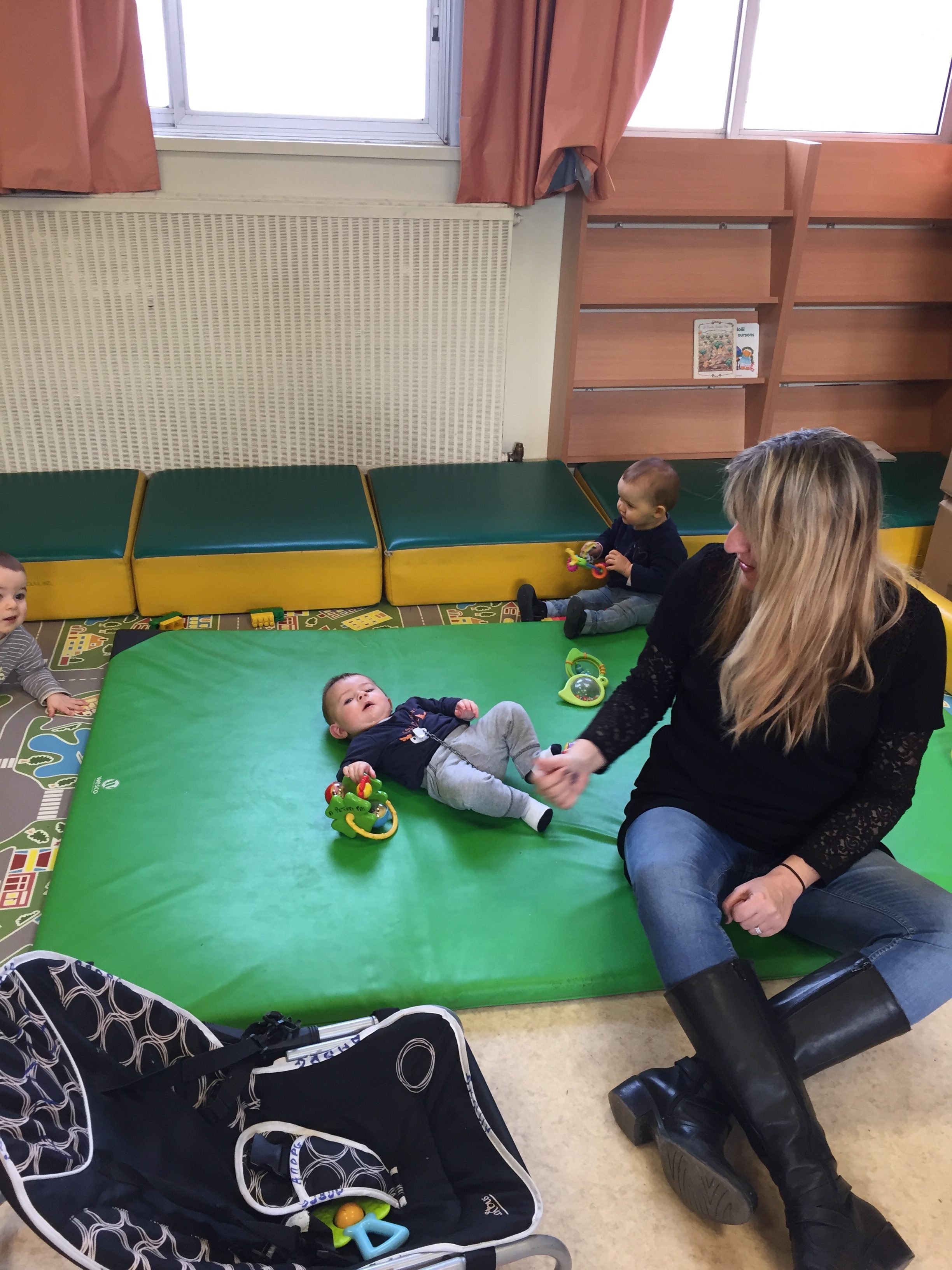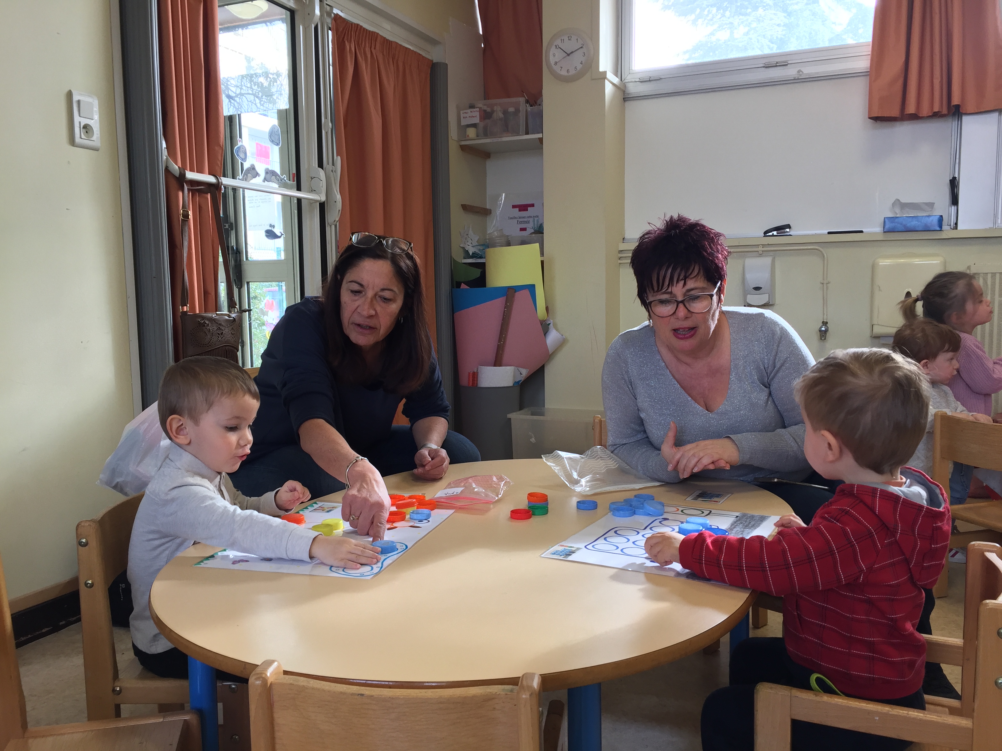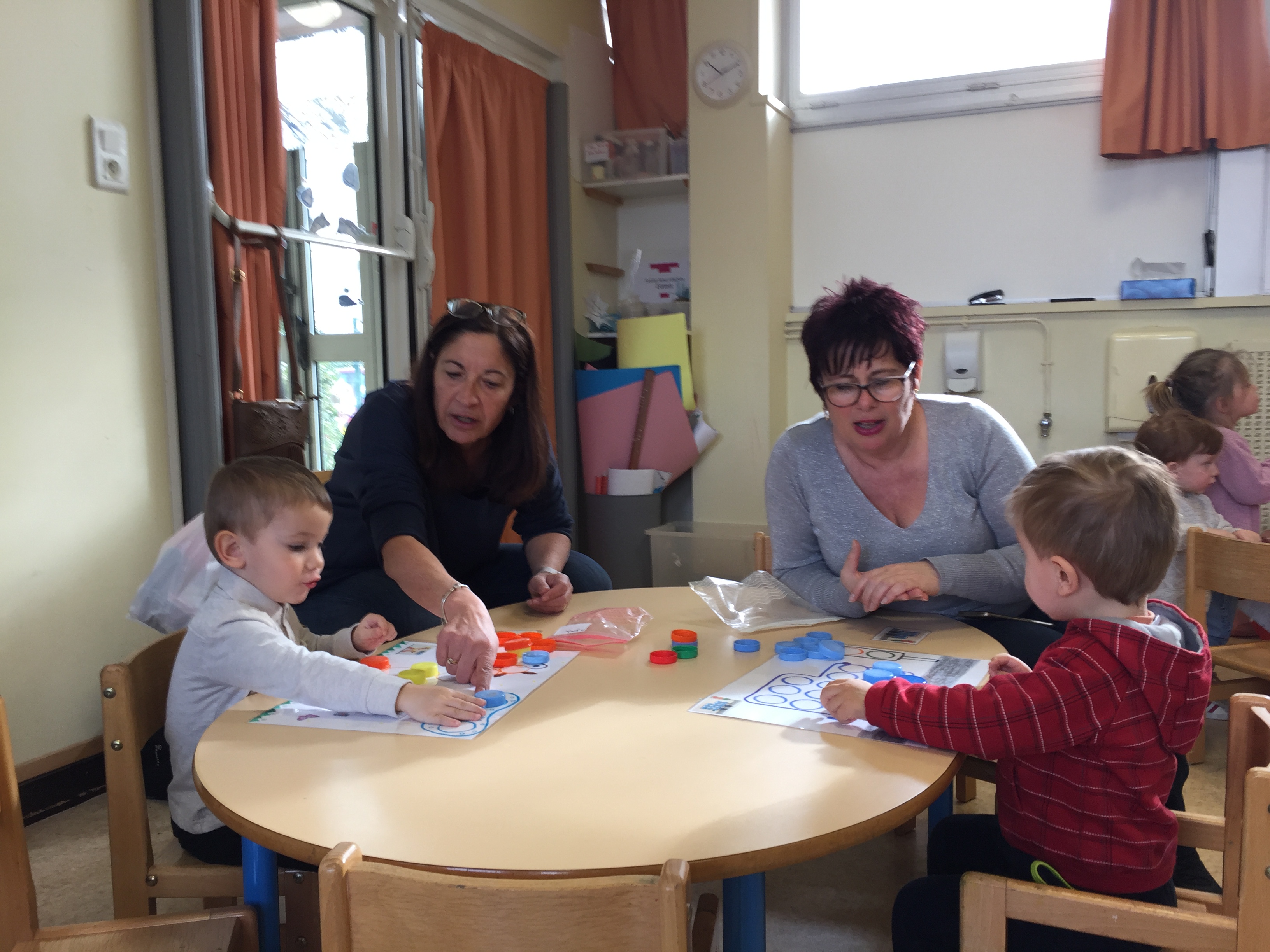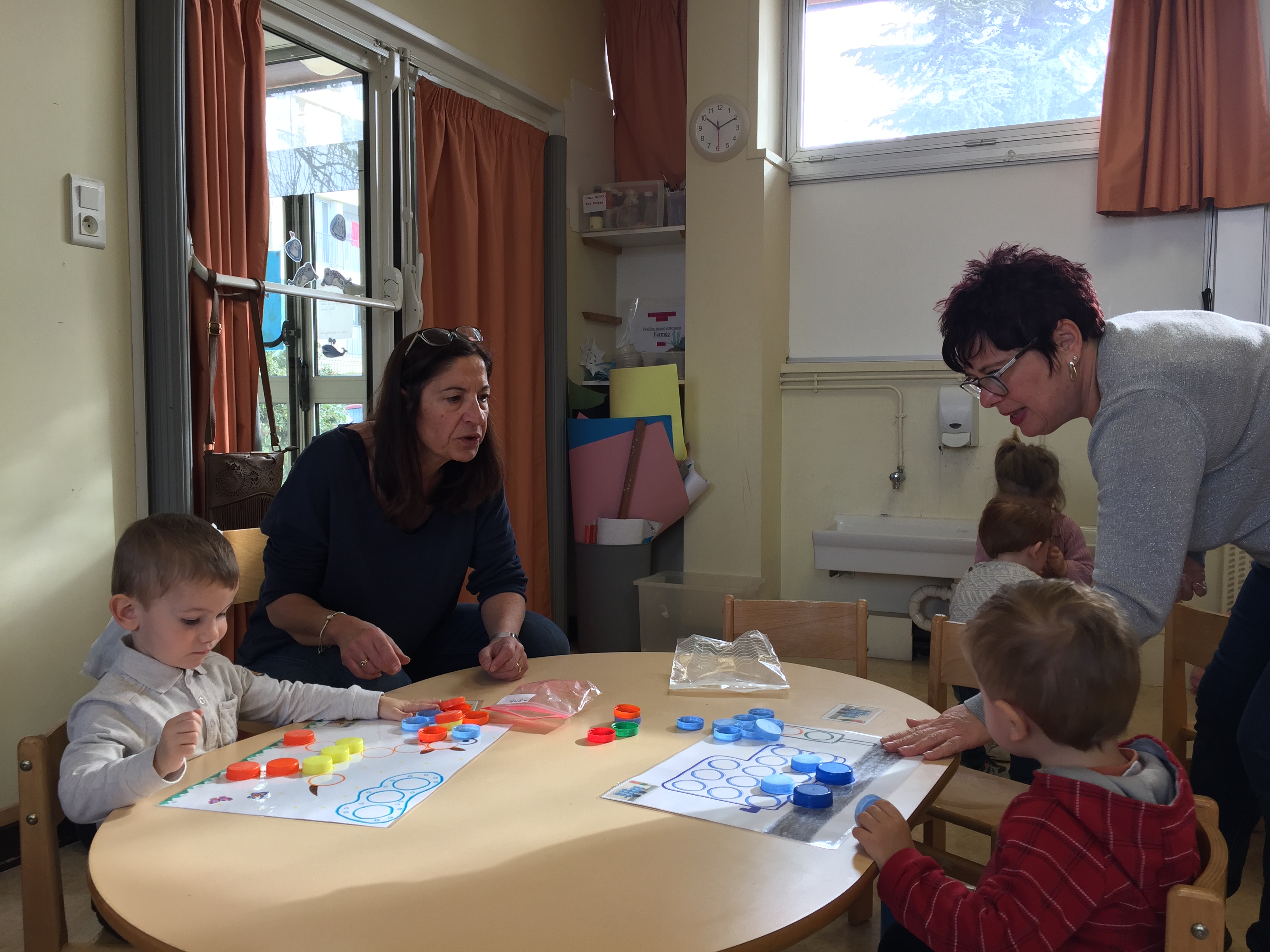 ensuite nous avons joué au memory réalisé avec des bouchons toujours, on y colle 2 pastilles de même couleur, le but du jeu est d’arriver à trouver les 2 bouchons de la même couleur, pas simple, toujours dans l’esprit de jouer en apprenant les couleurs.