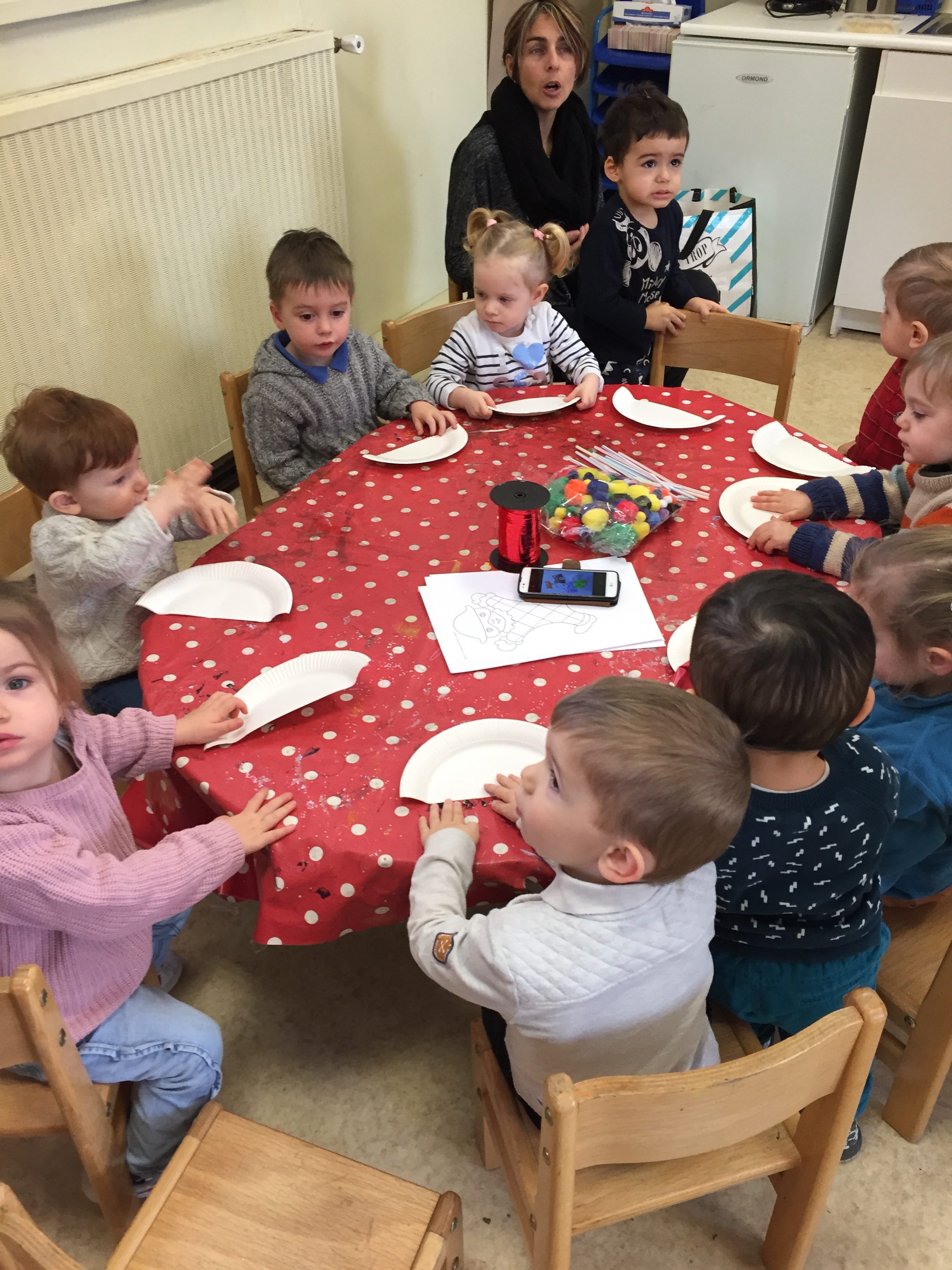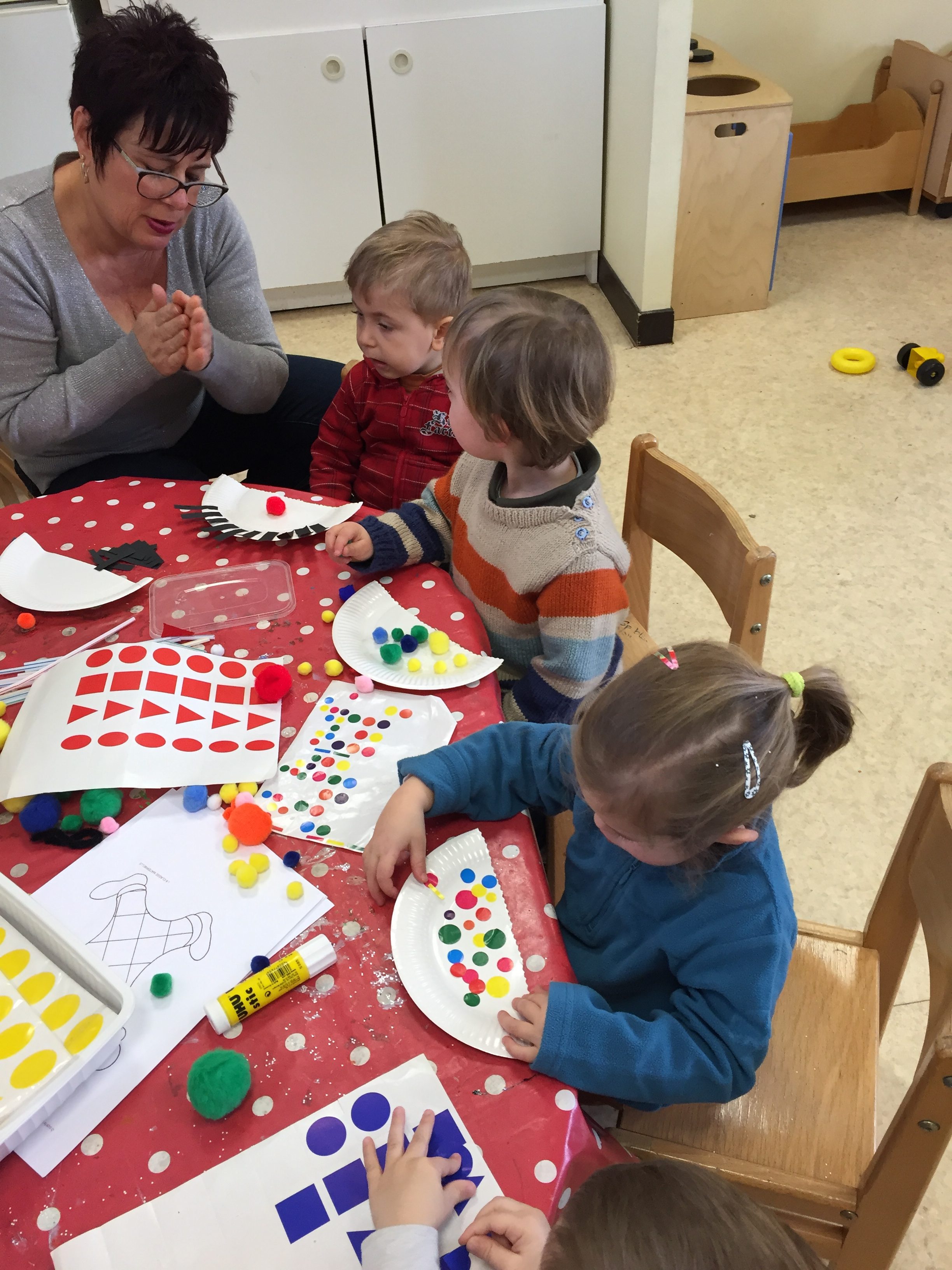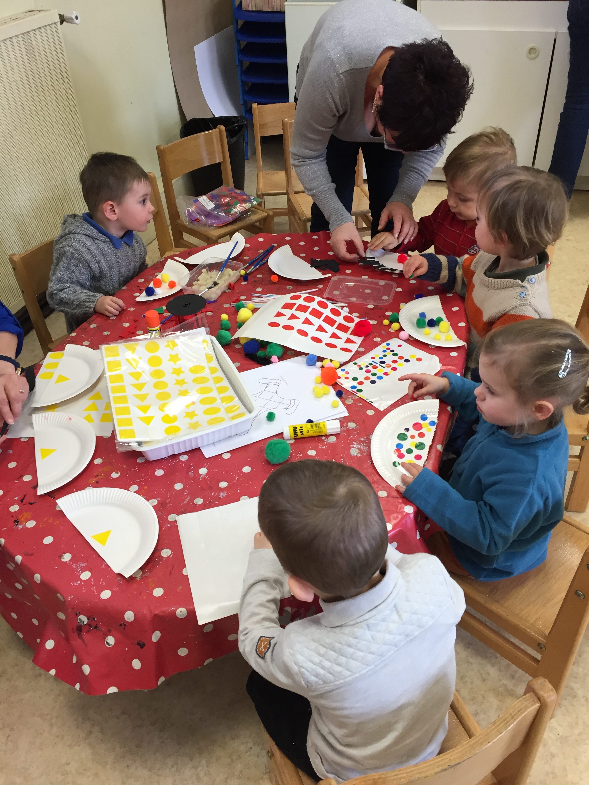 Le masque réalisé avec une demi assiette en carton, après l’enfant étaient libre artistiquement d’y mettre des gommettes, collage de pompons avec de la colle faites maison par Ouassila