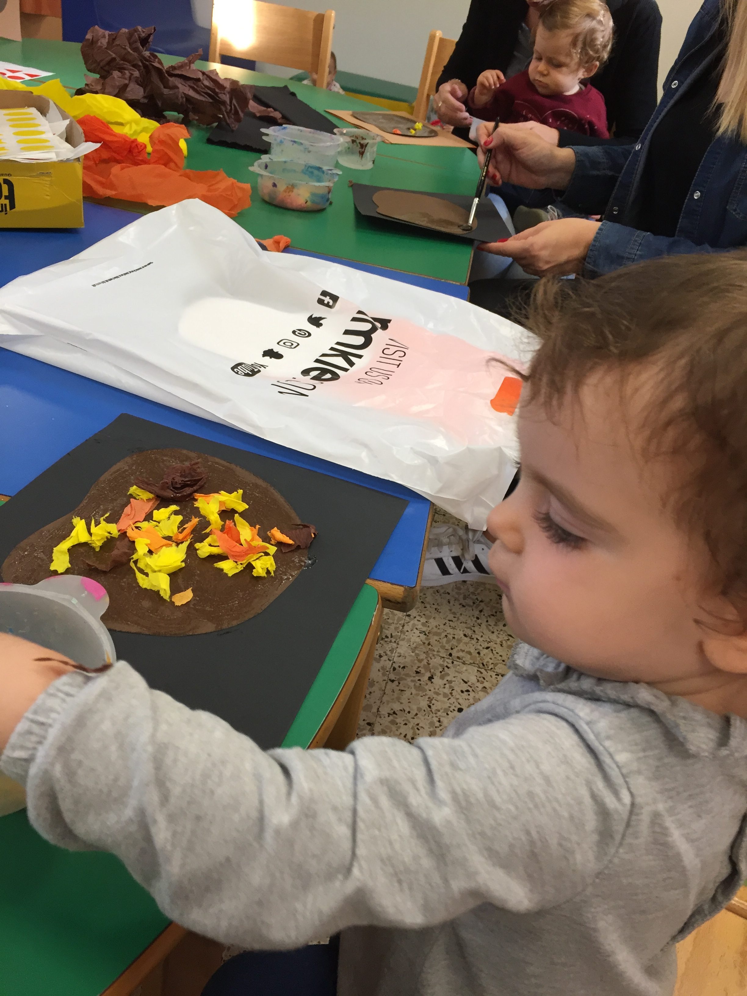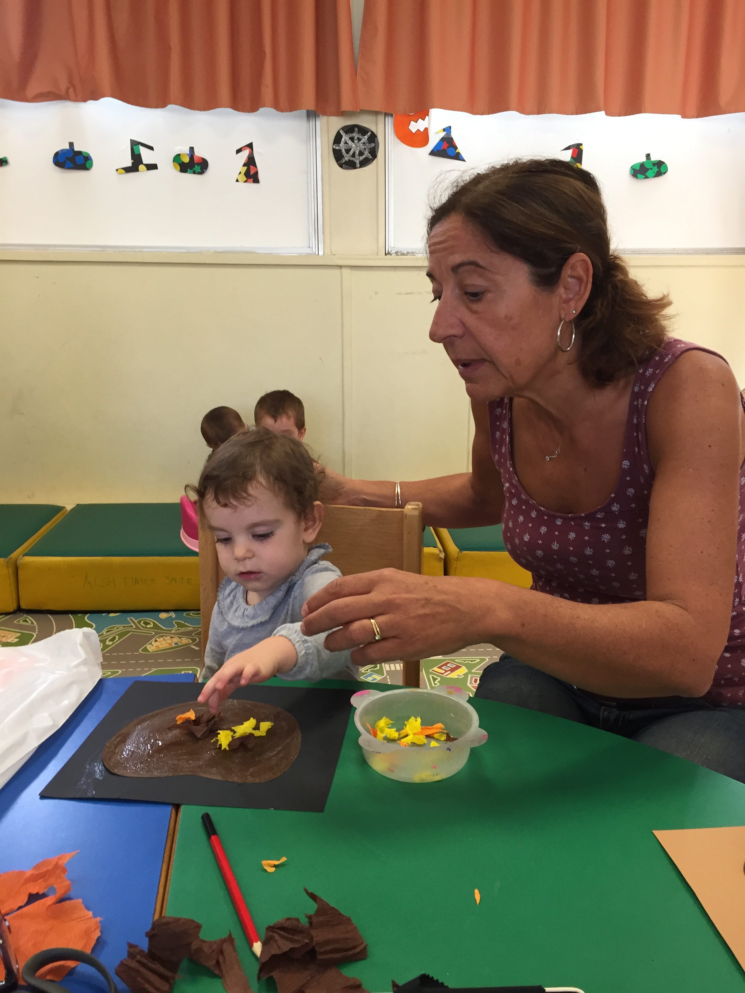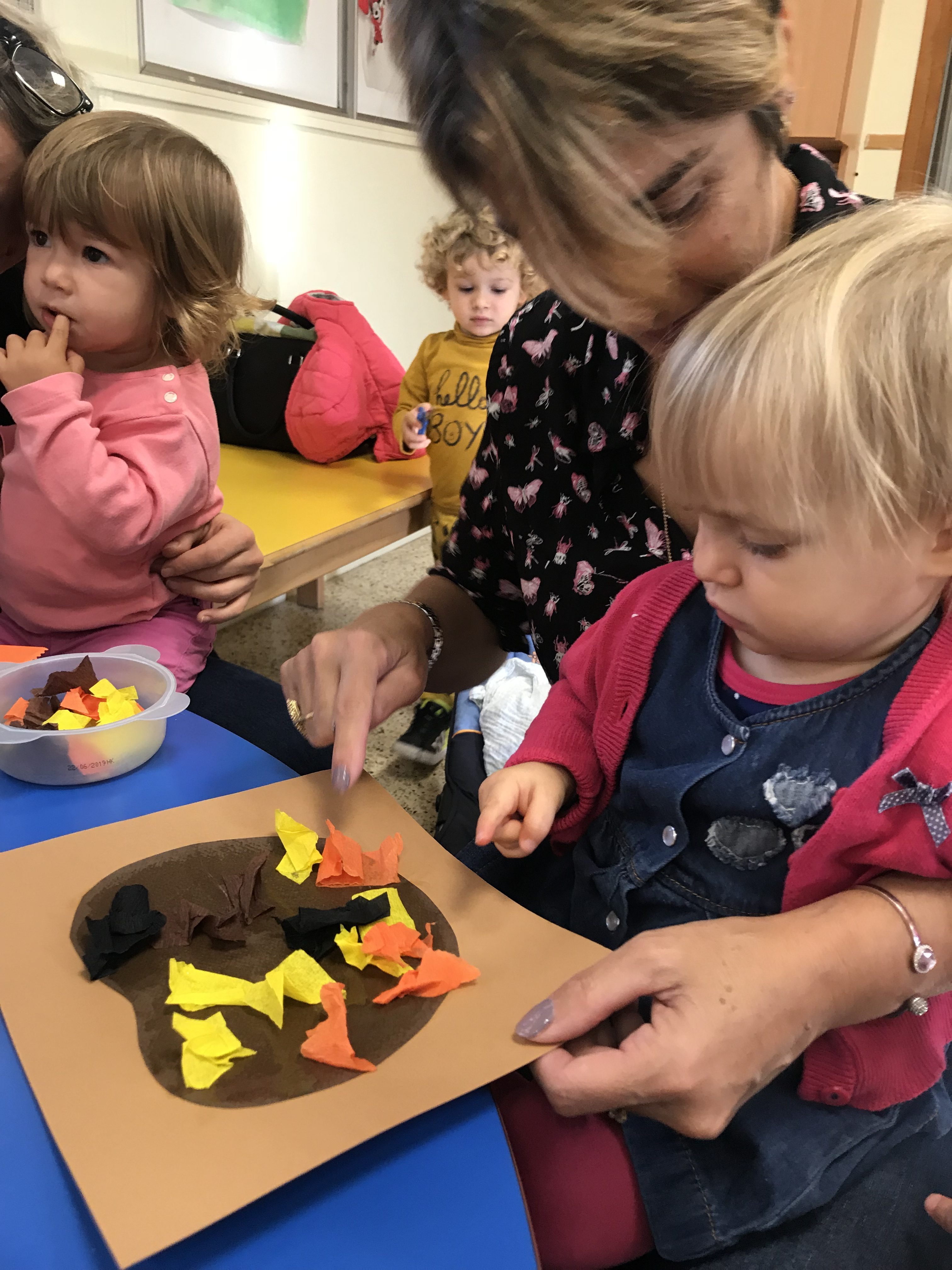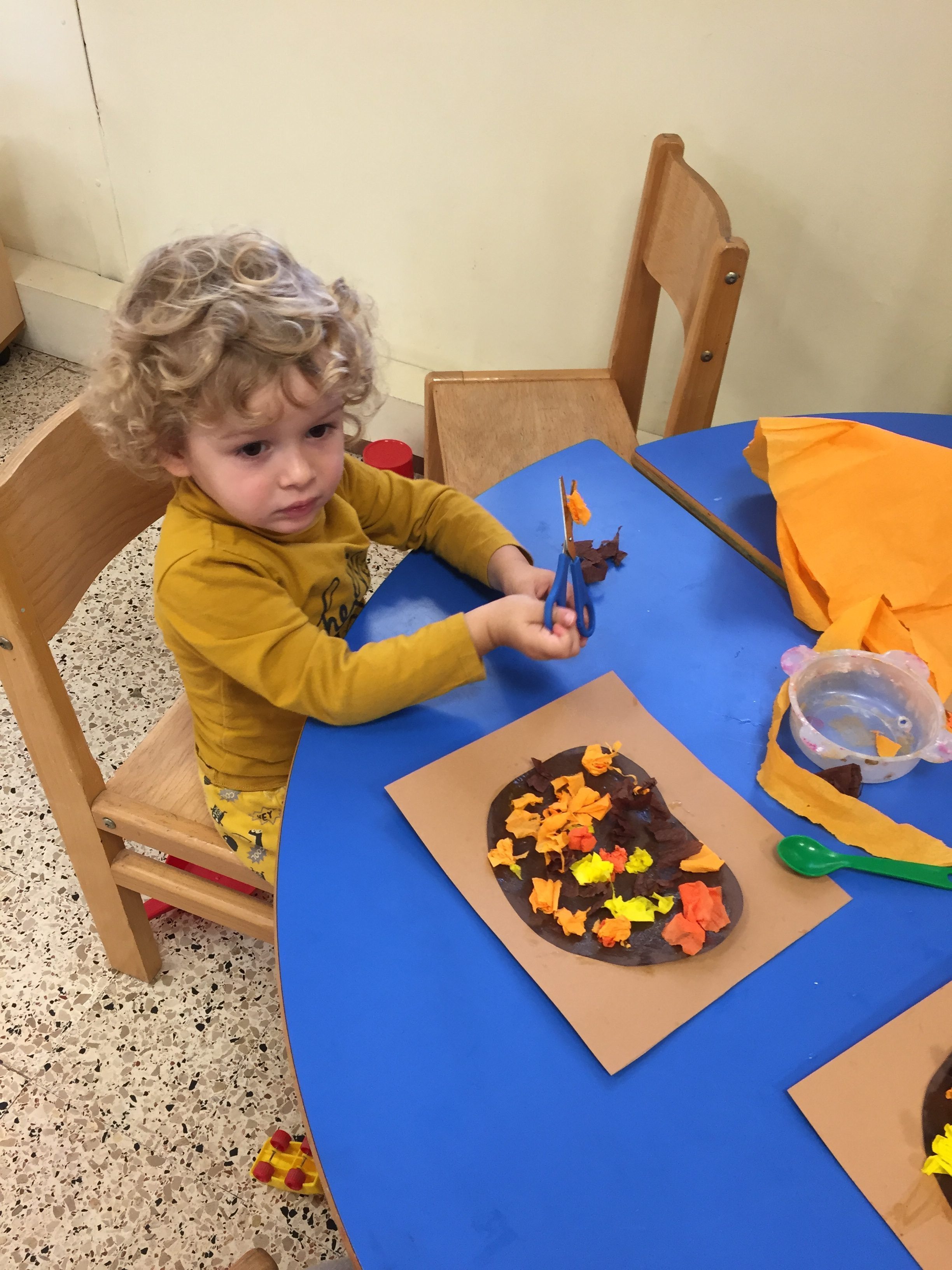 Aujourd’hui nous étions à la salle du jardin de la petite enfance pour proposer aux enfants du collage de papier crépon pour fabriquer une citrouille d’automne en faisons aussi référence à halloween