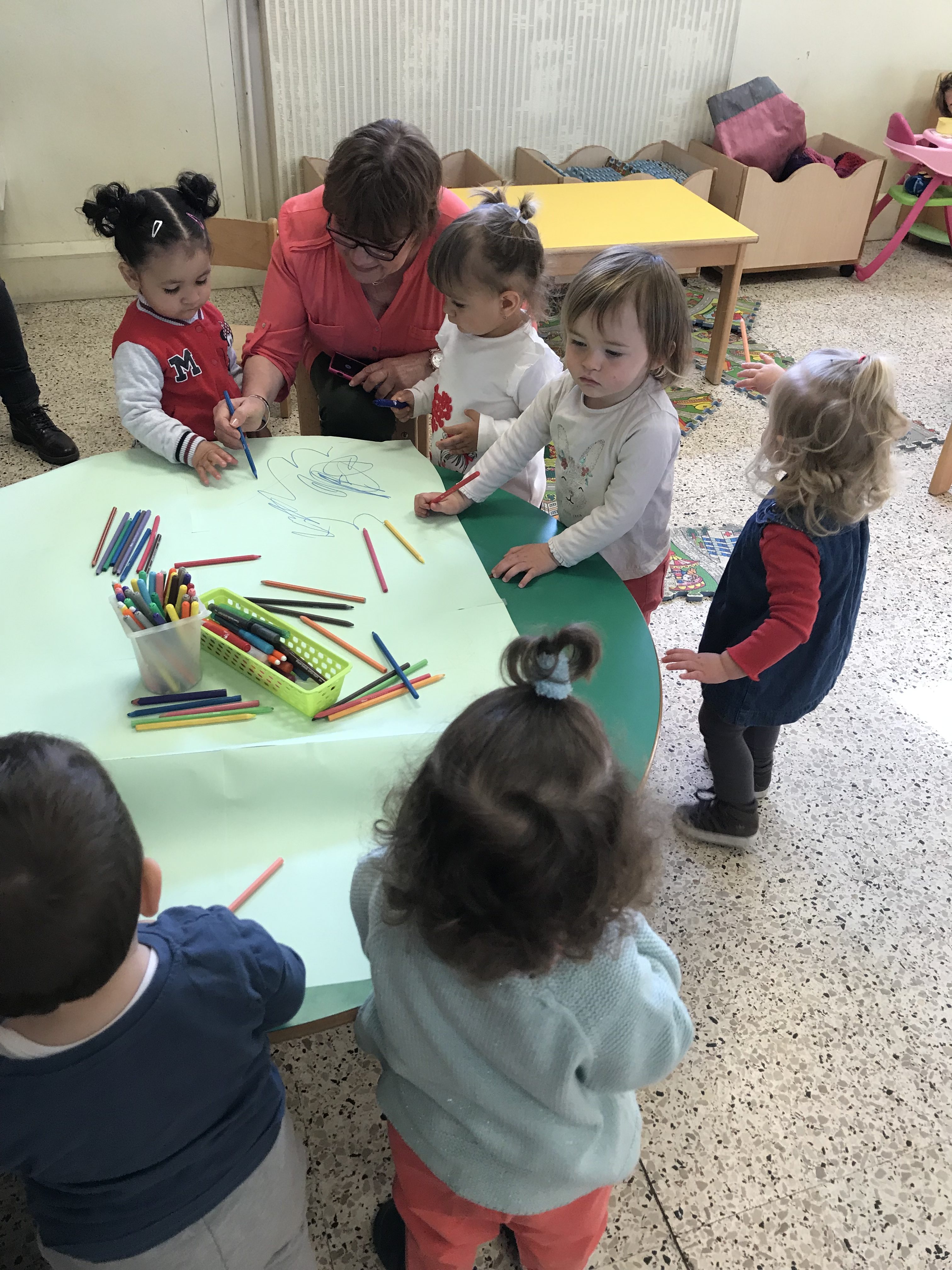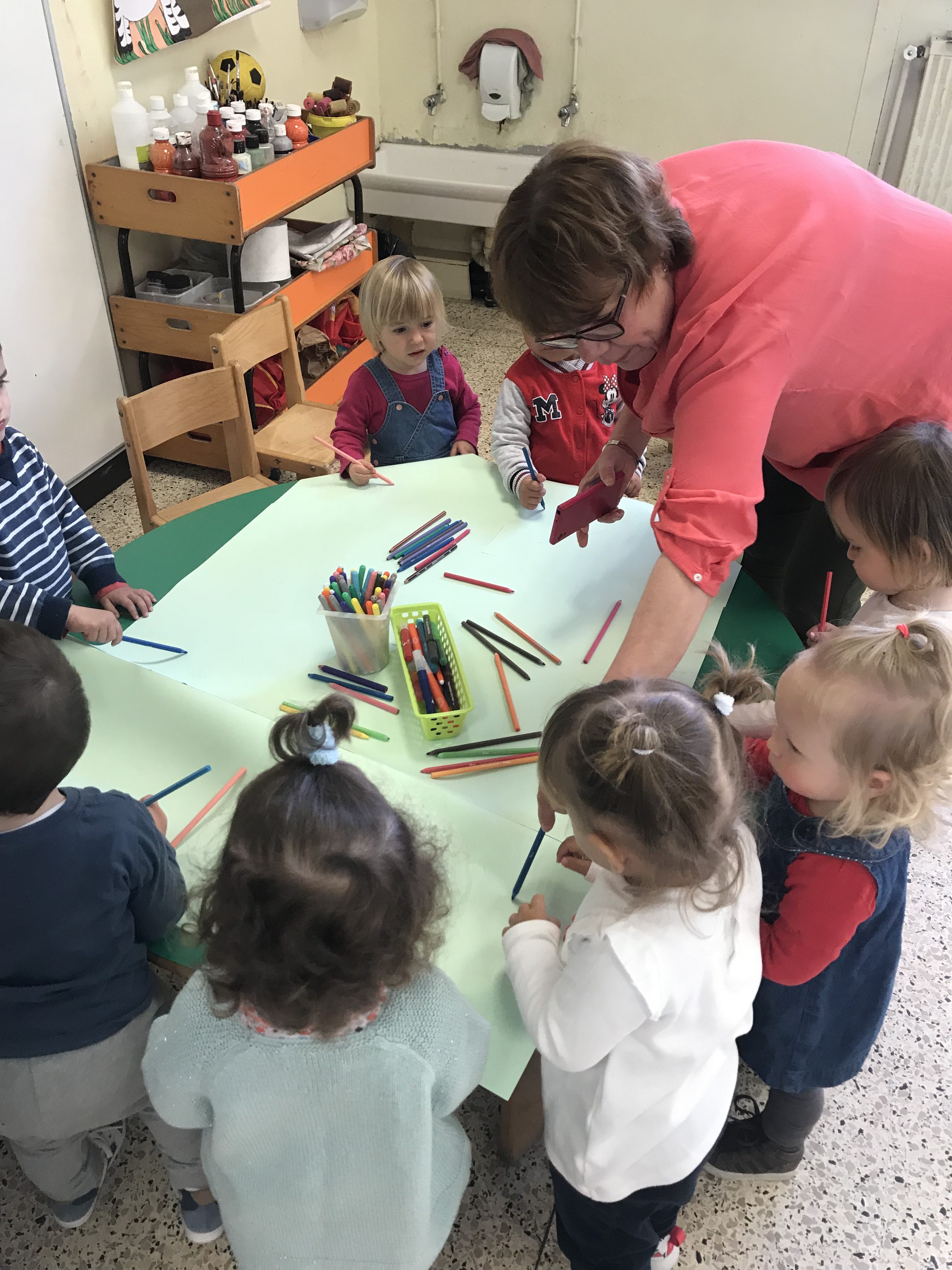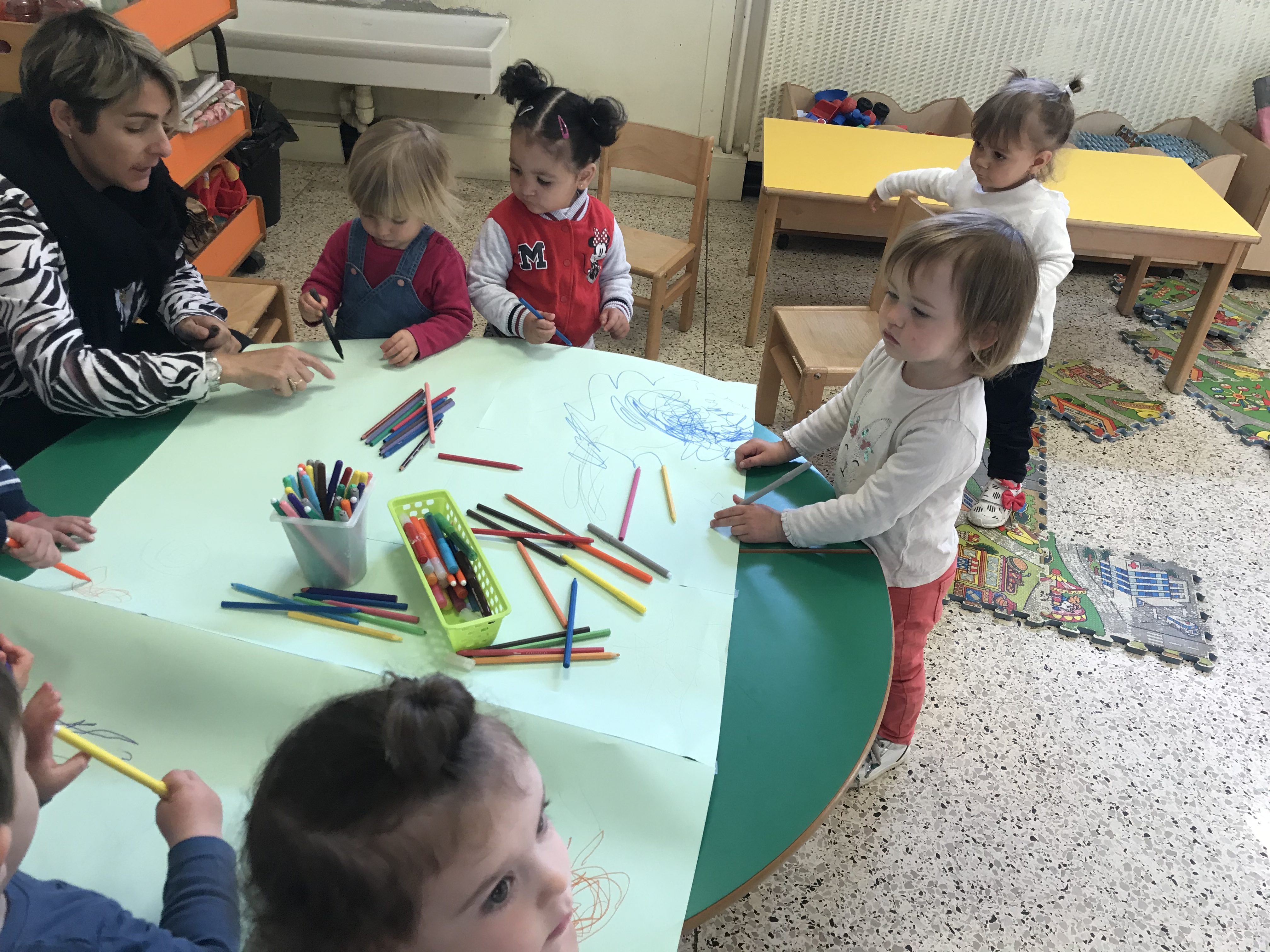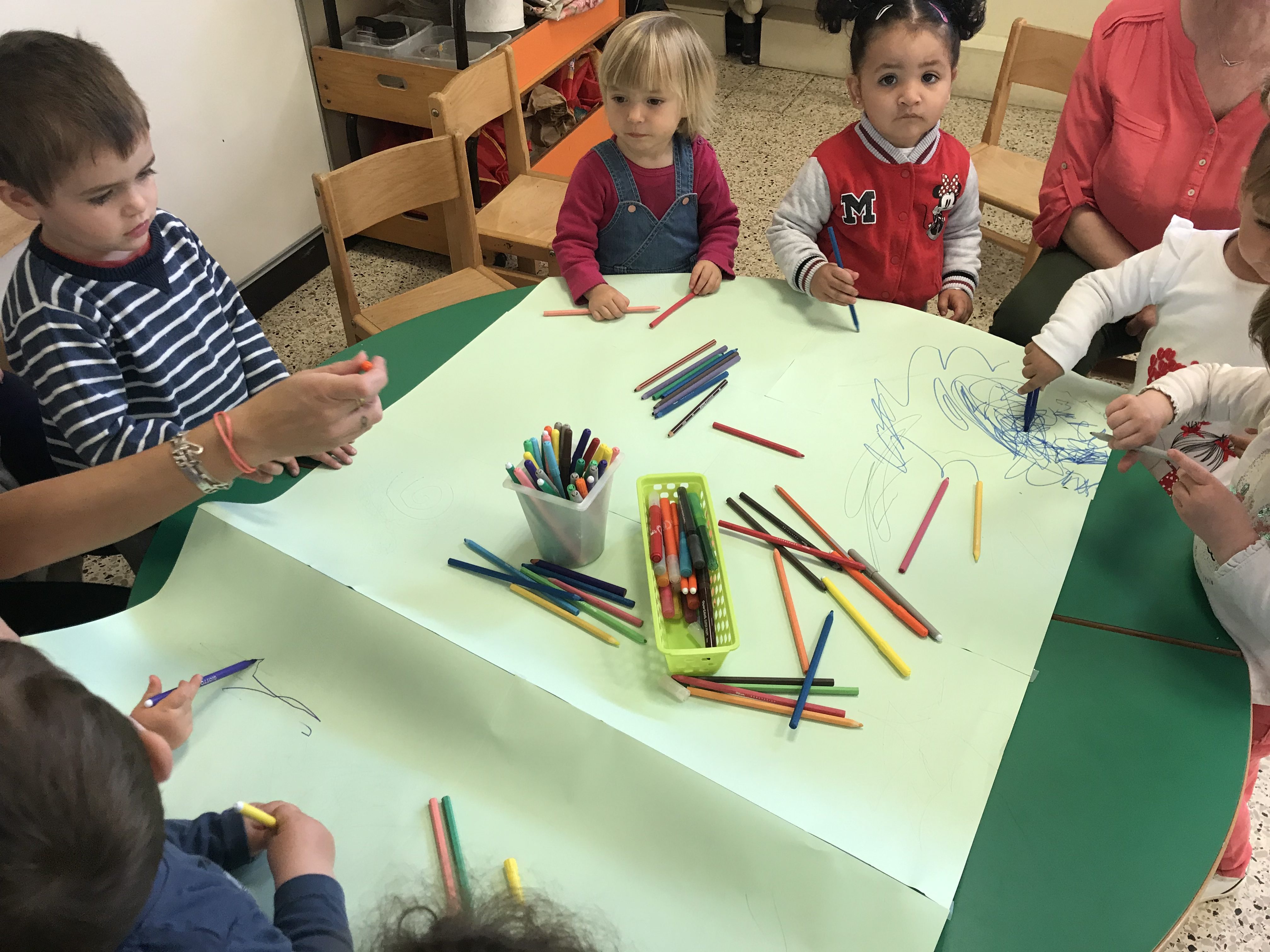 Nos poussins sont des artistes et réalisent aujourd’hui un dessin ensemble sur feuille super grand format.