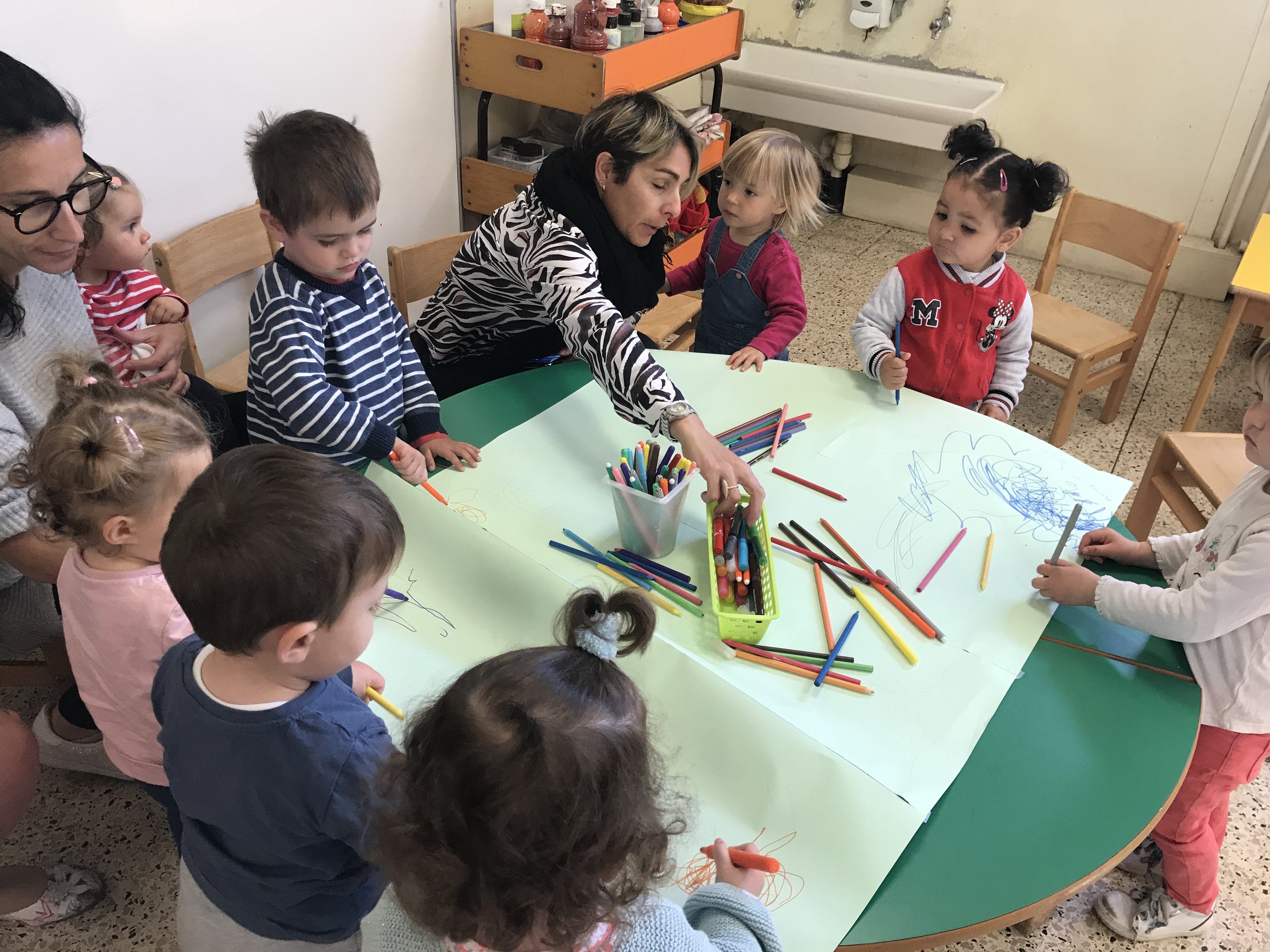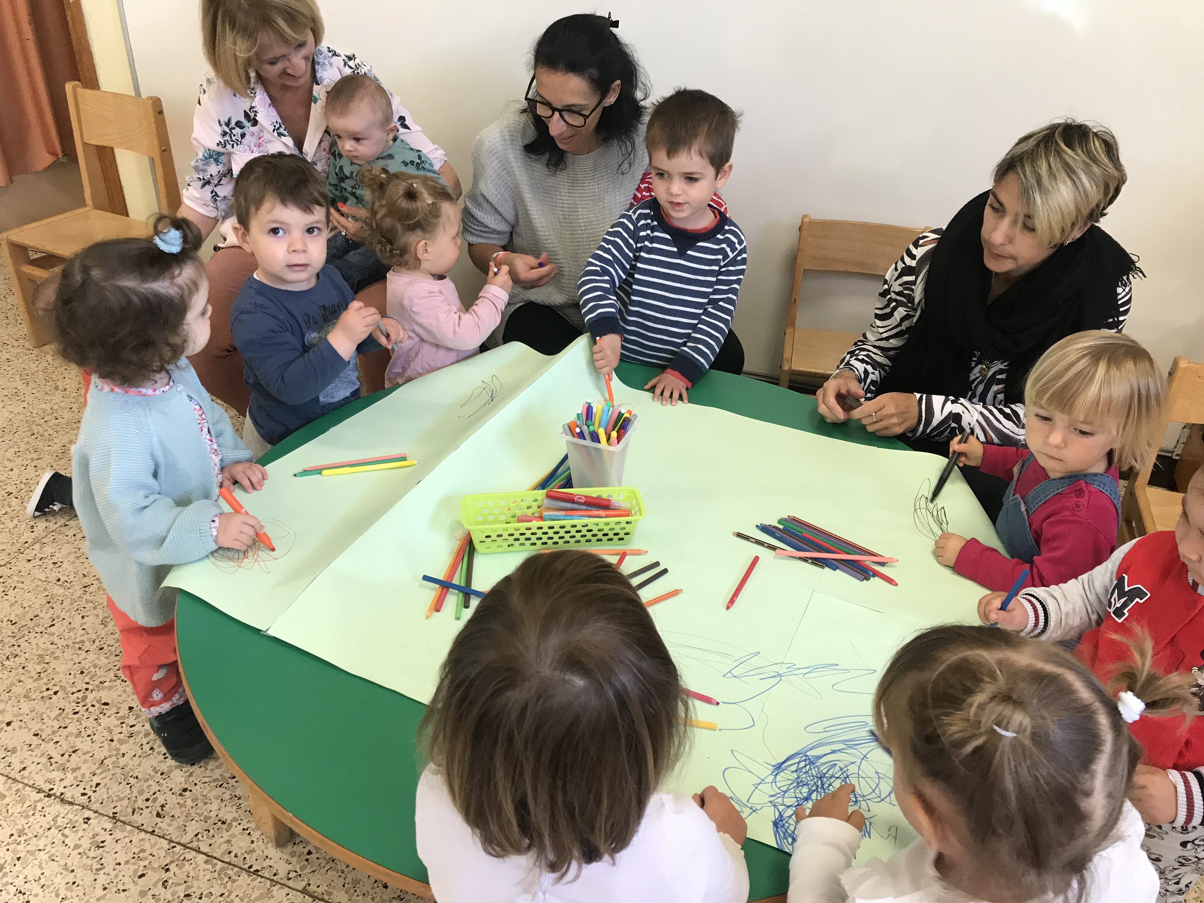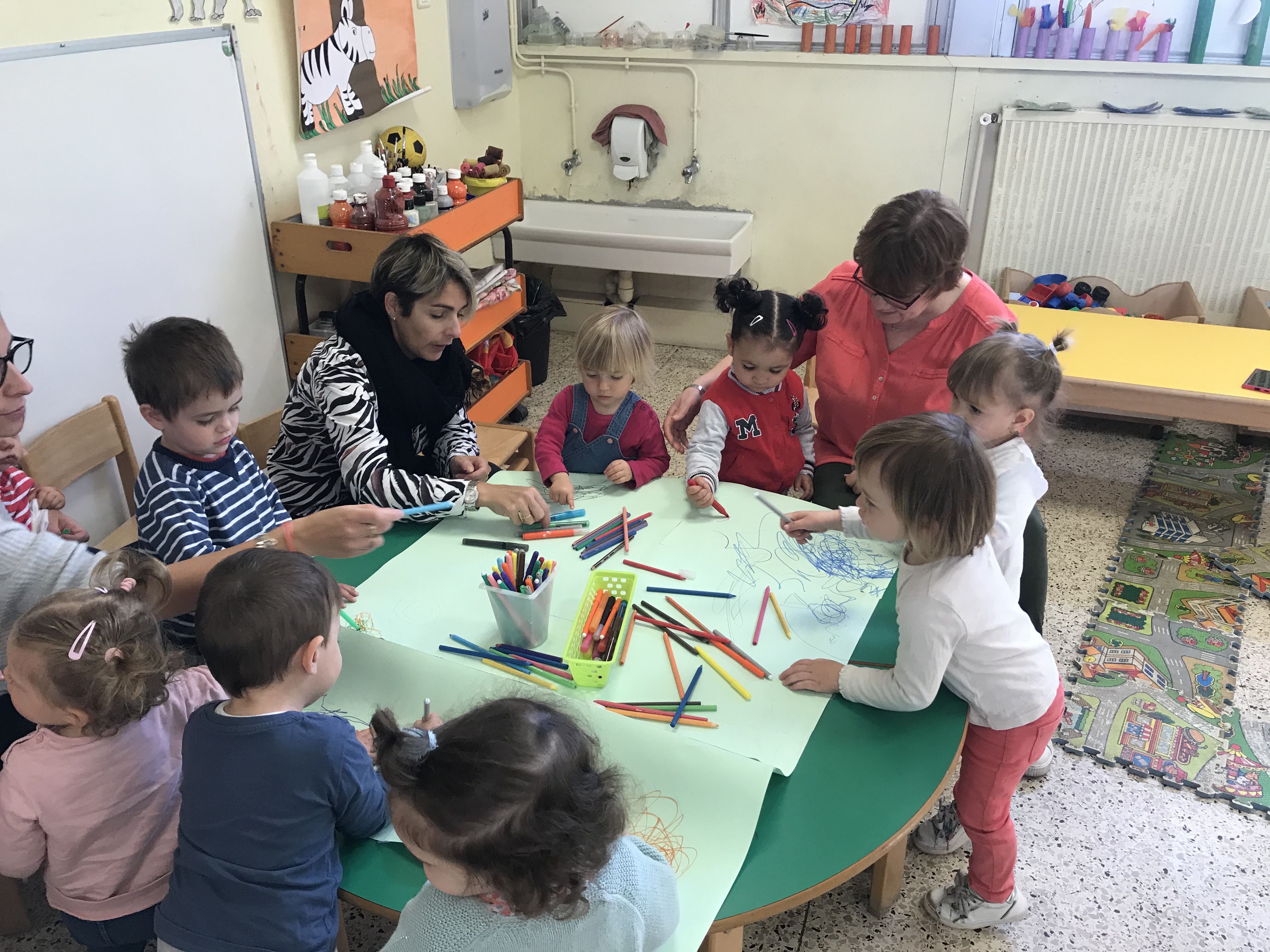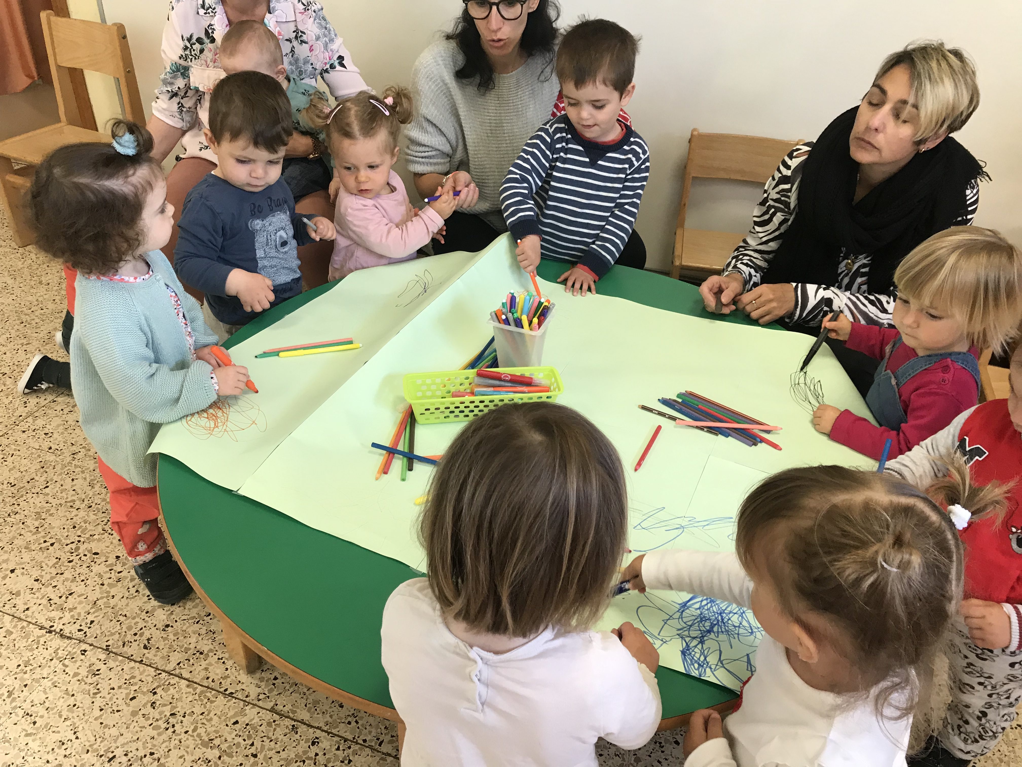 Nos poussins sont des artistes et réalisent aujourd’hui un dessin ensemble sur feuille super grand format.