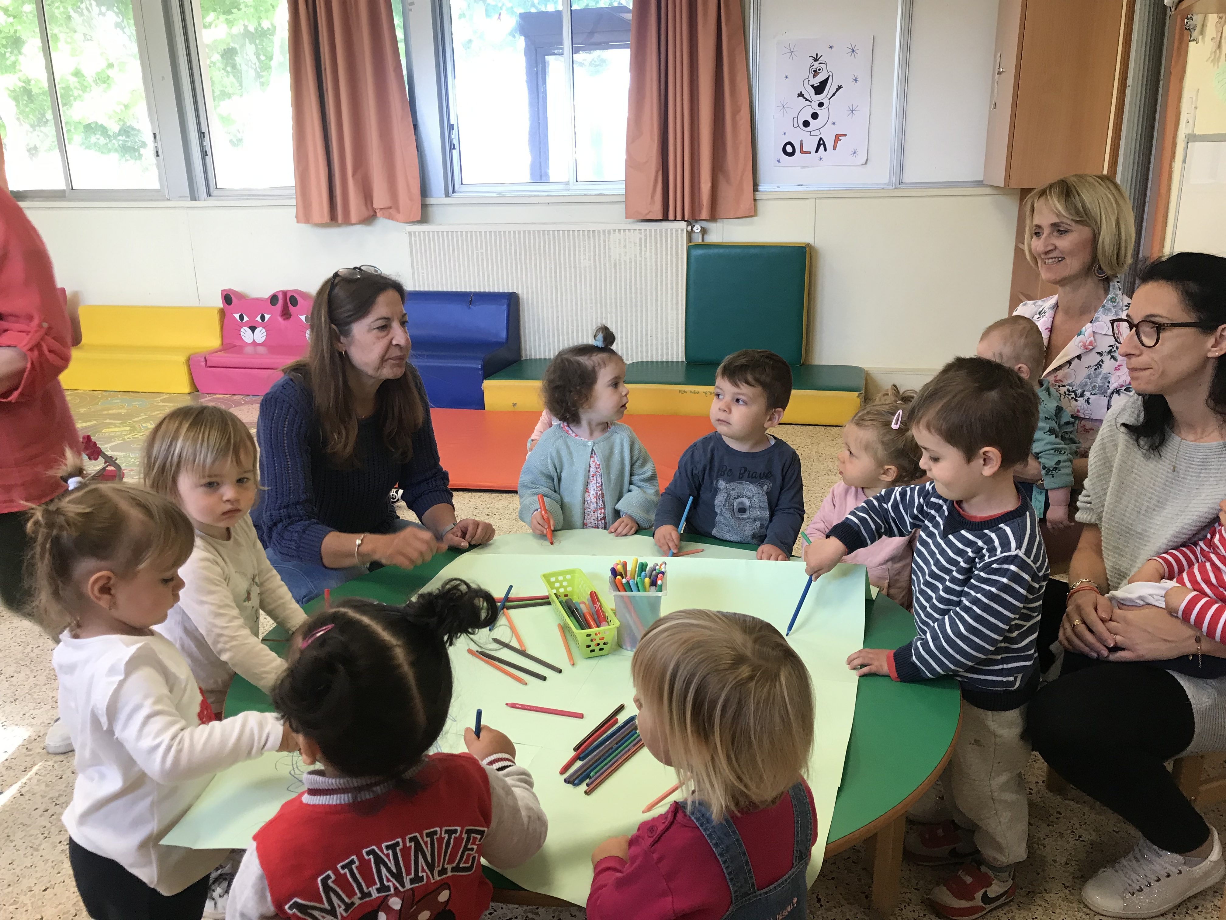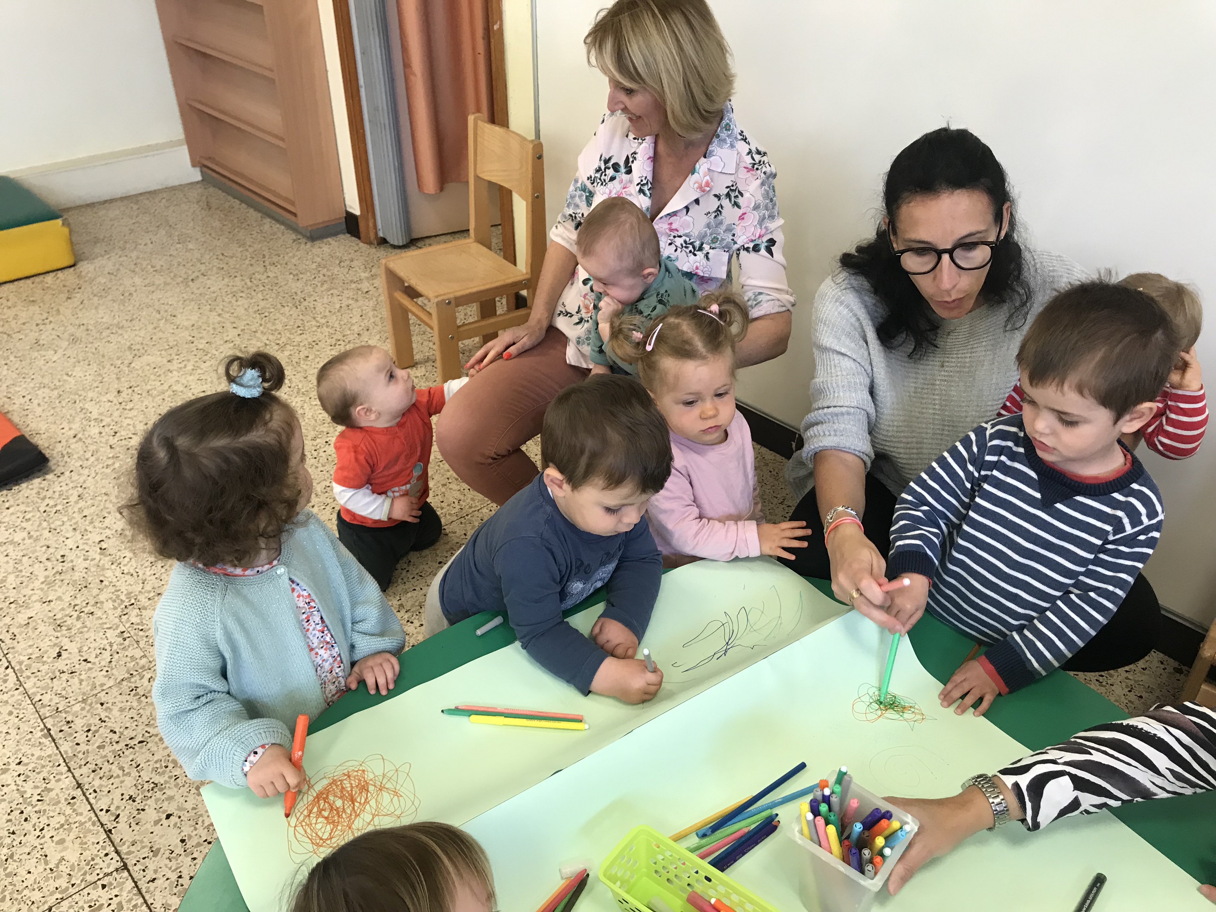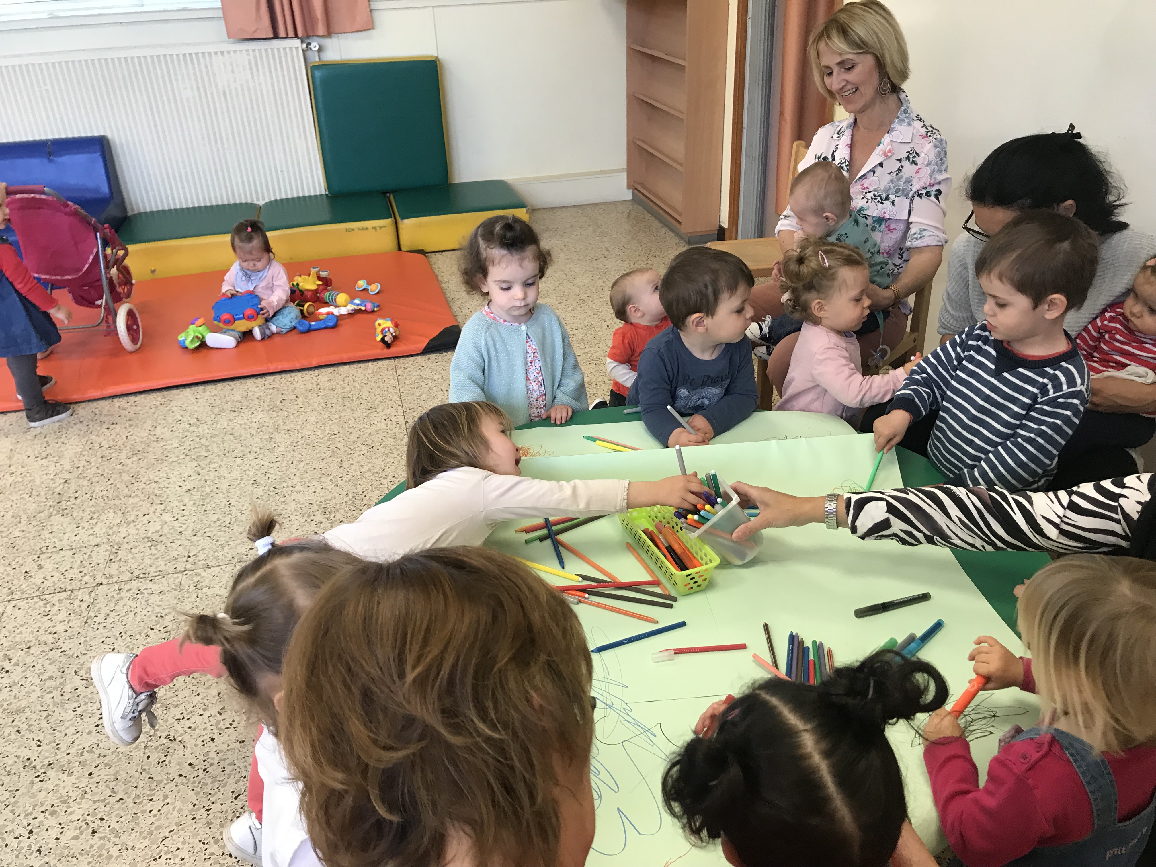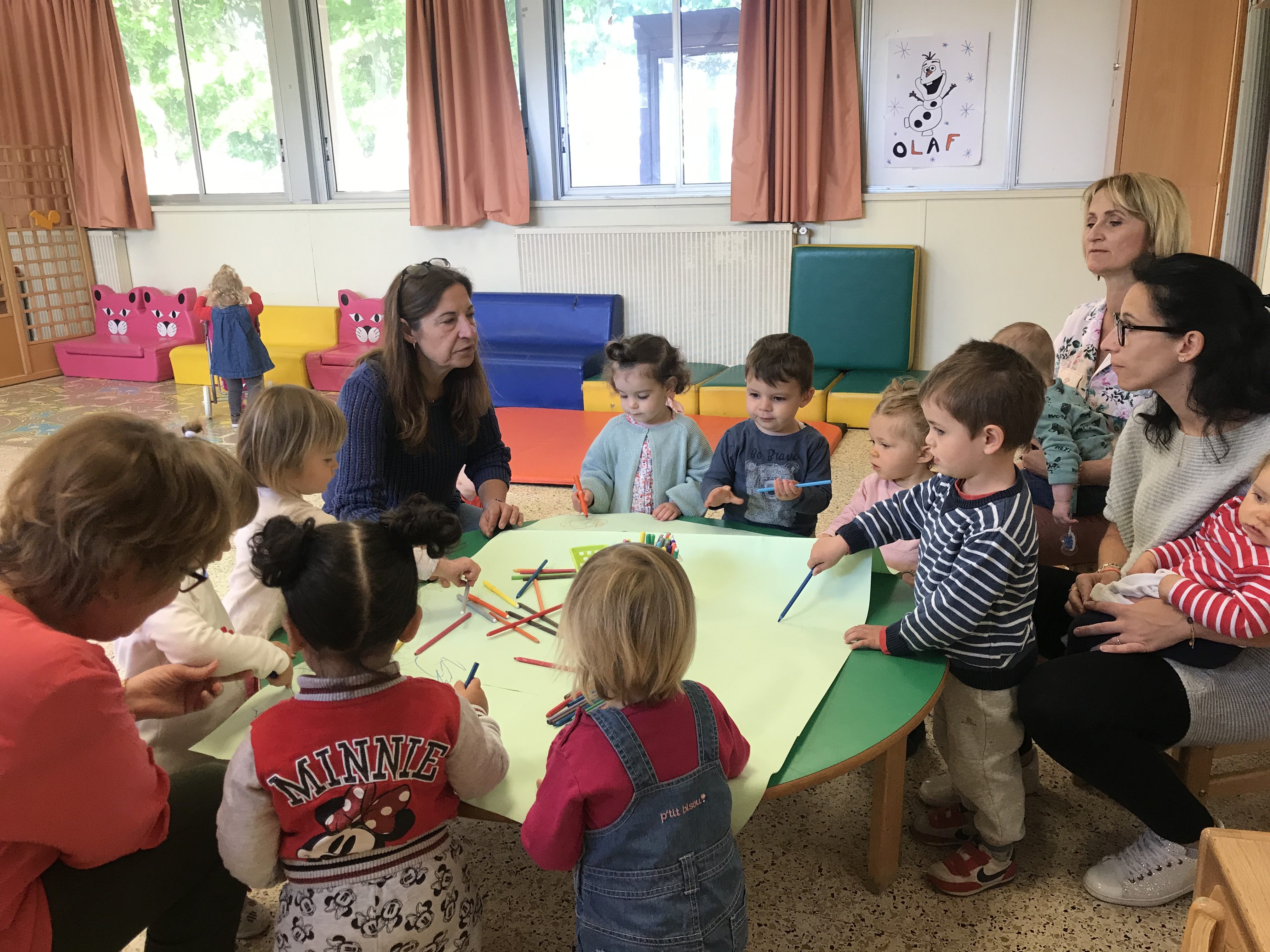 Nos poussins sont des artistes et réalisent aujourd’hui un dessin ensemble sur feuille super grand format.