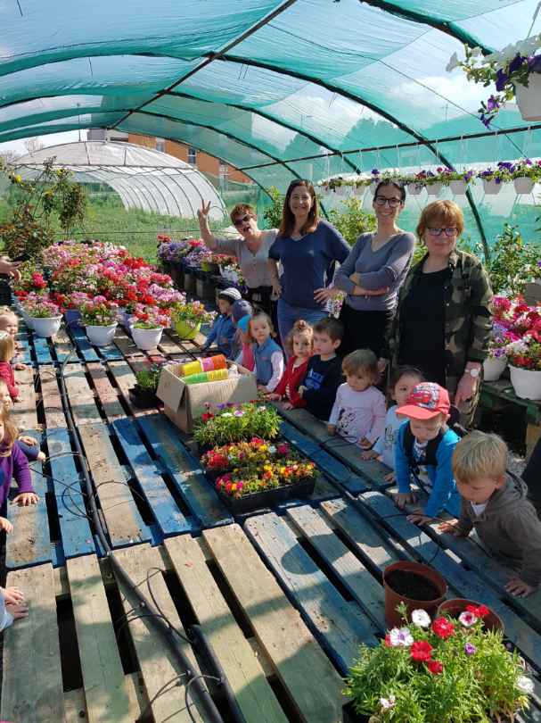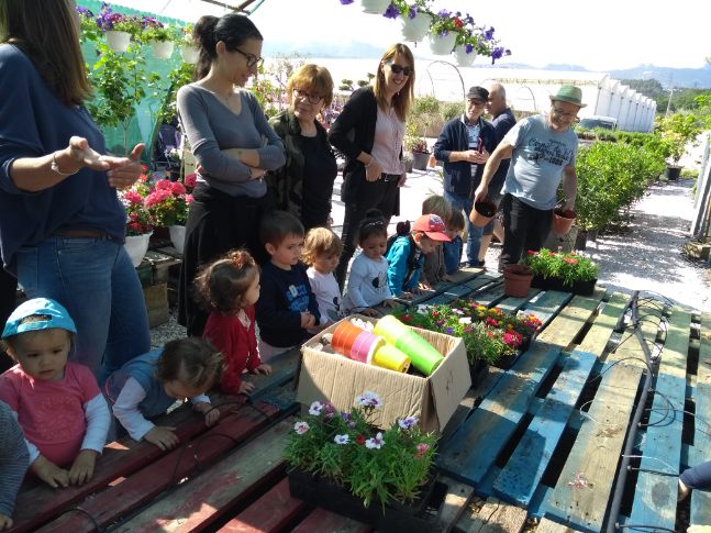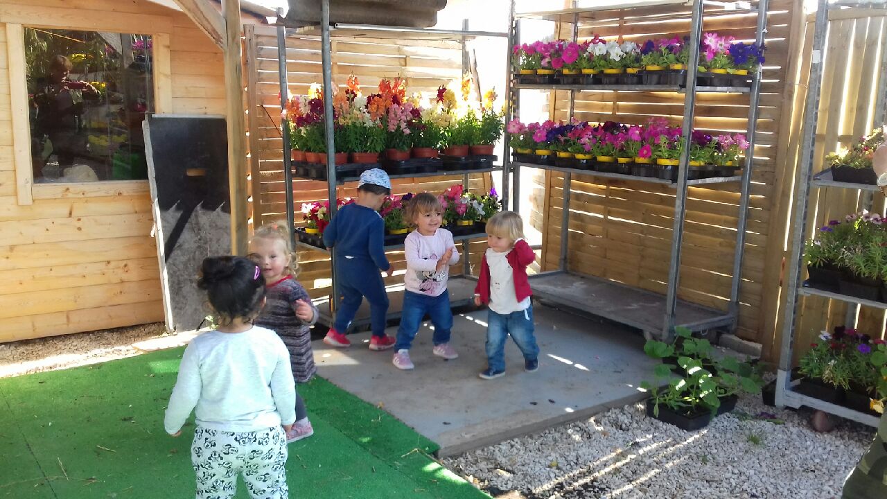 Ensuite sur un socle à hauteur des enfants, des pots, de la terre, des fleurs sont mis à la disposition des enfants.