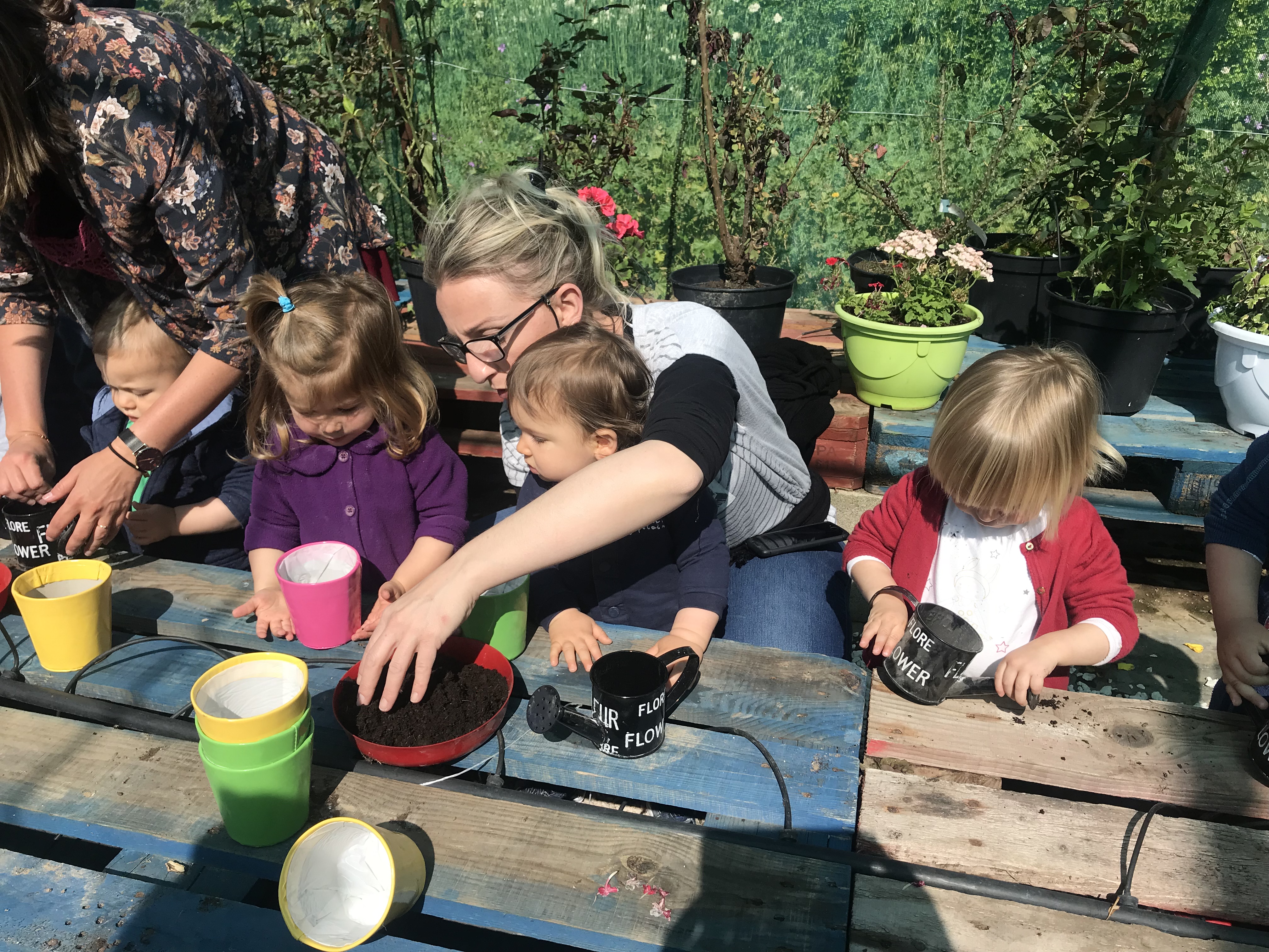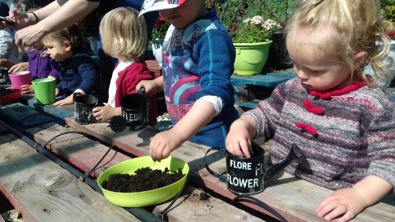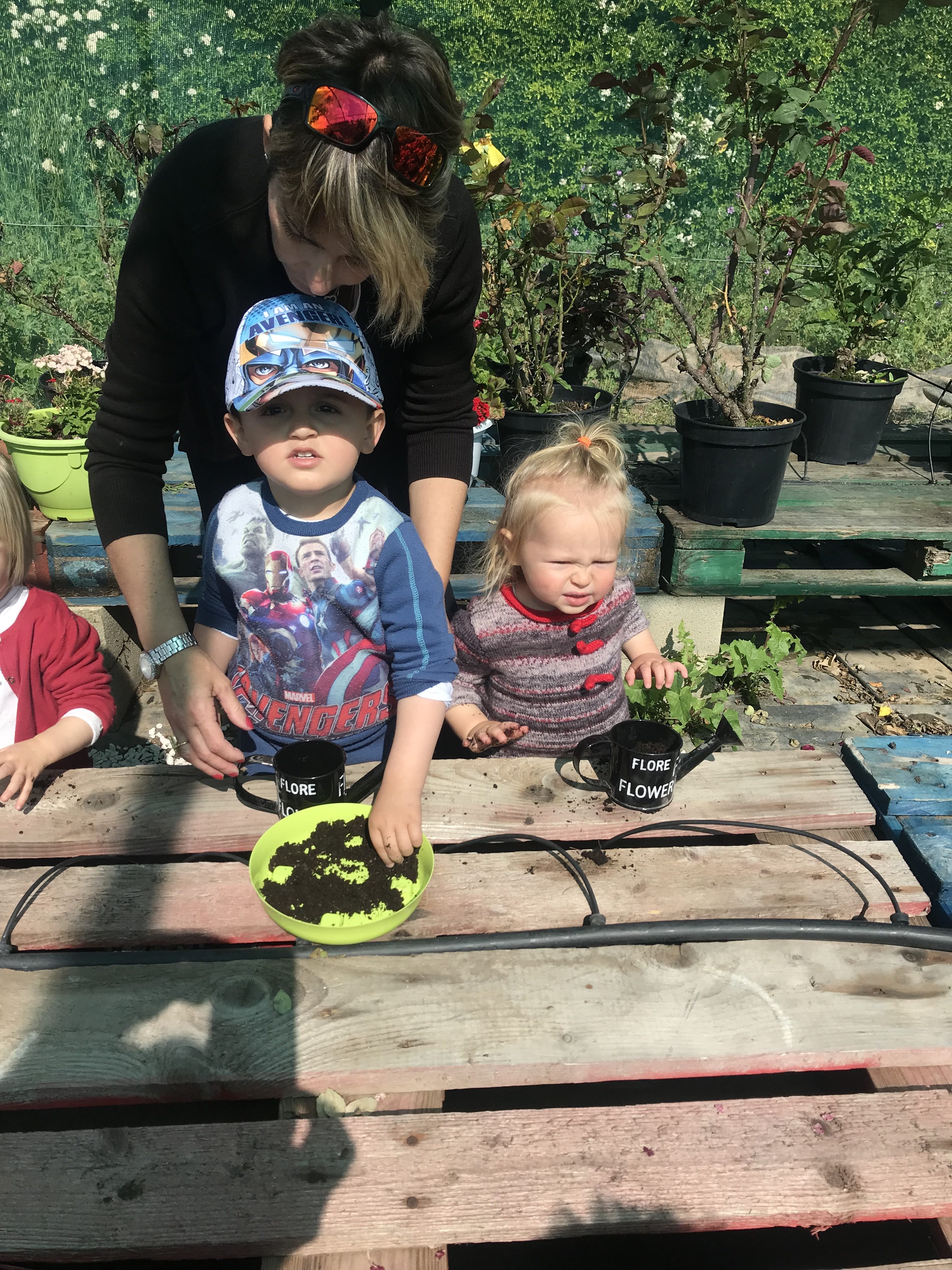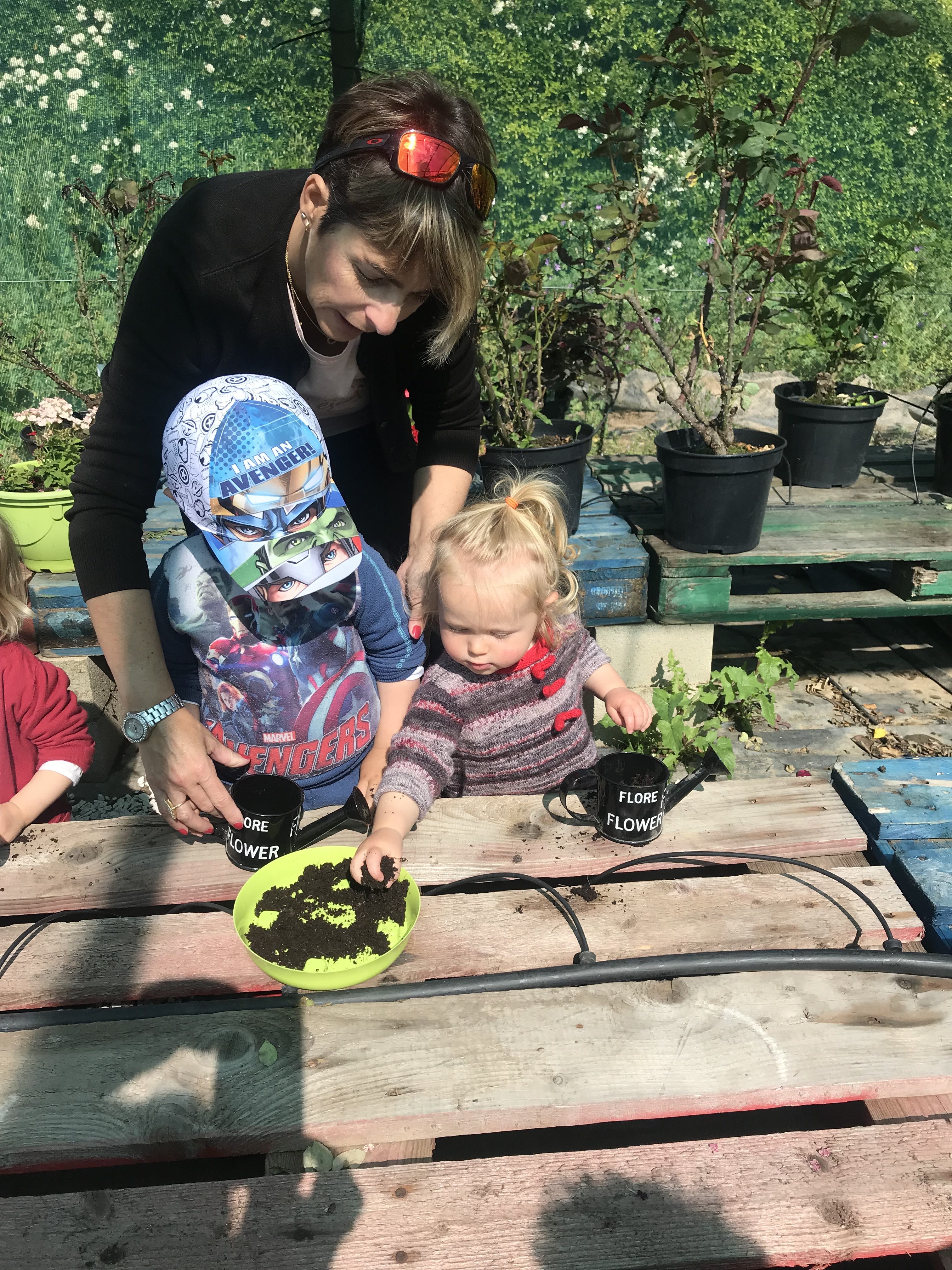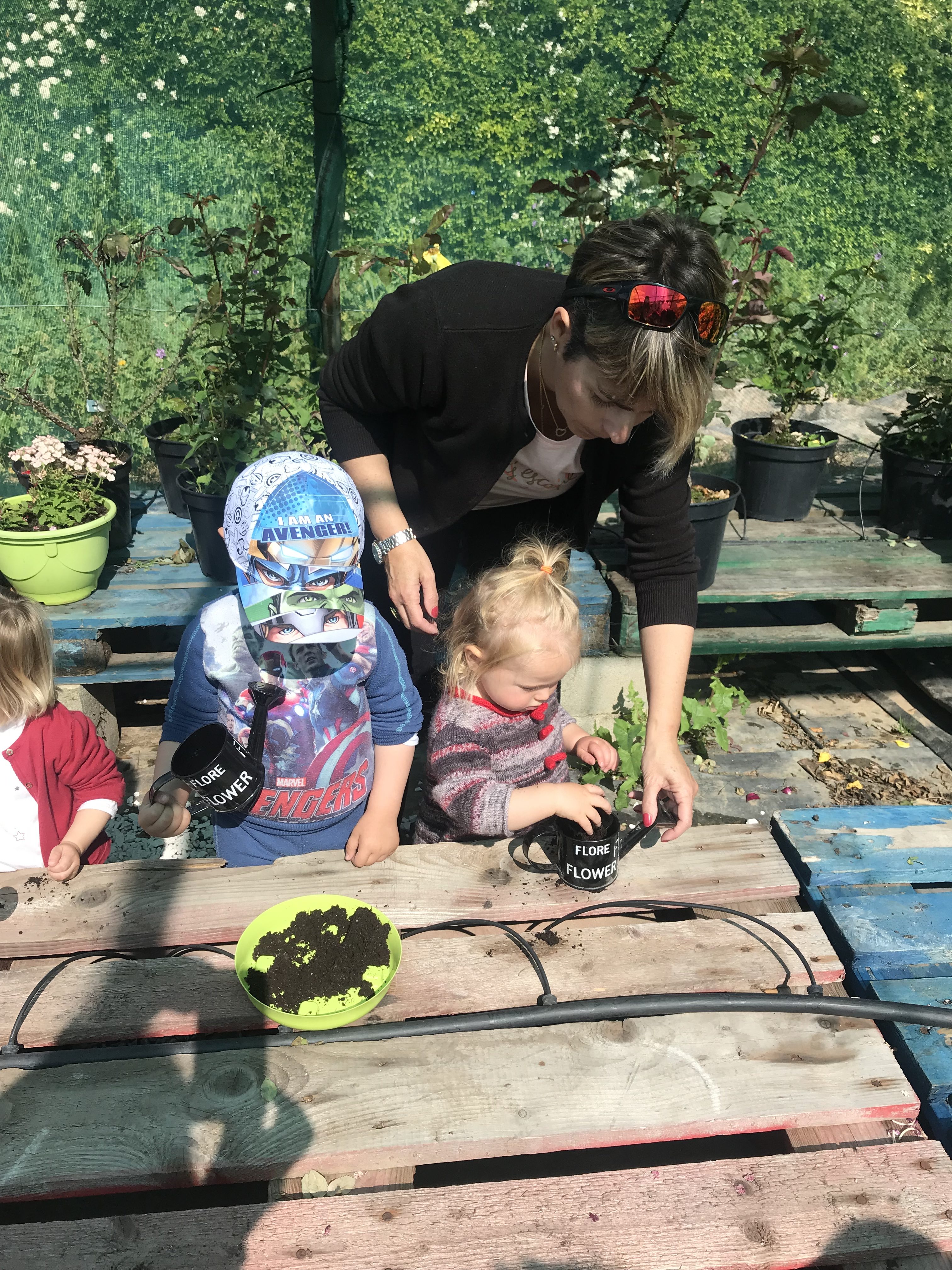 Les enfants pour les plus grands ont mis de la terre au fond du pot, ensuite mis les fleurs avec l’aide de nounou.
