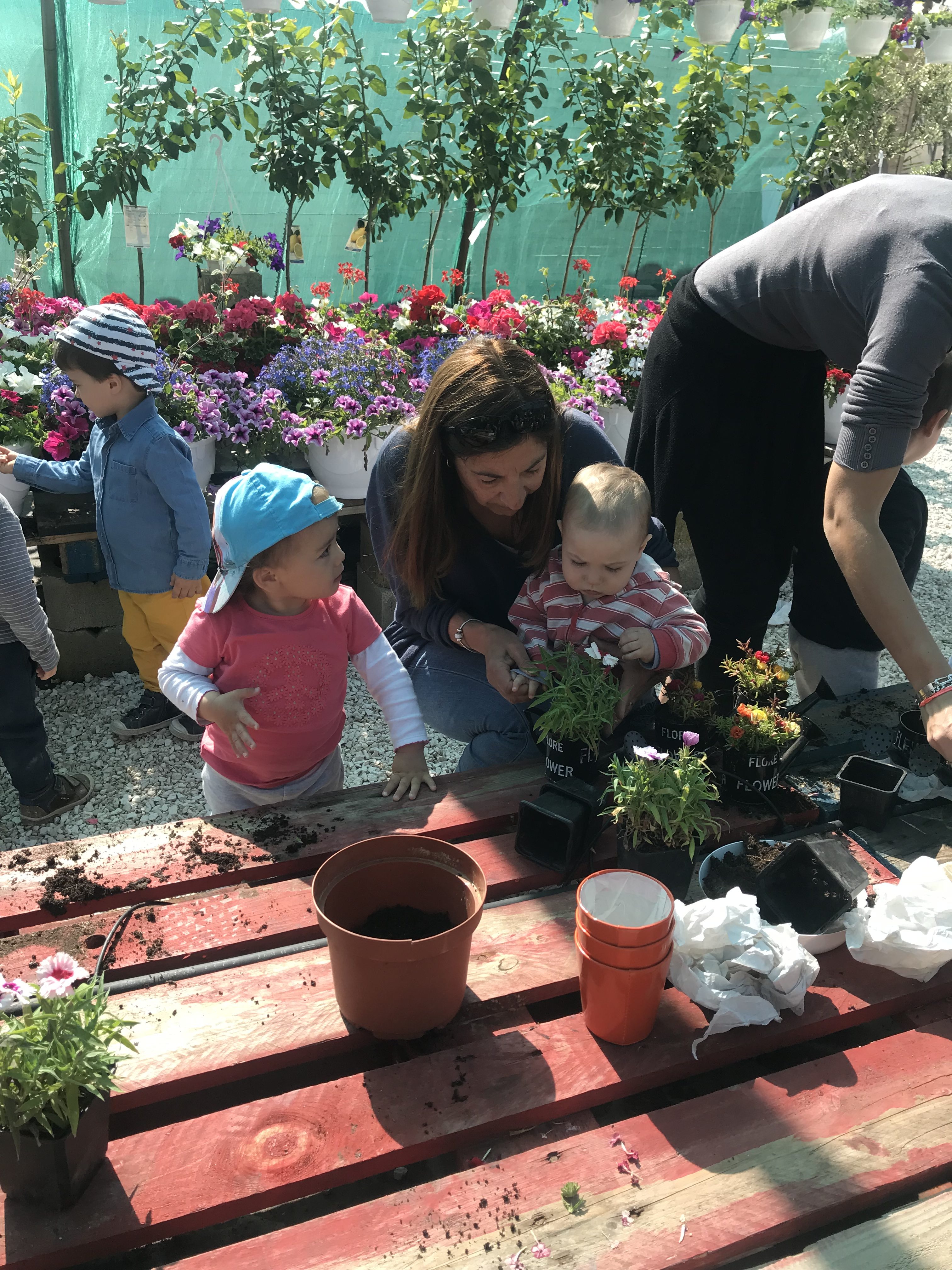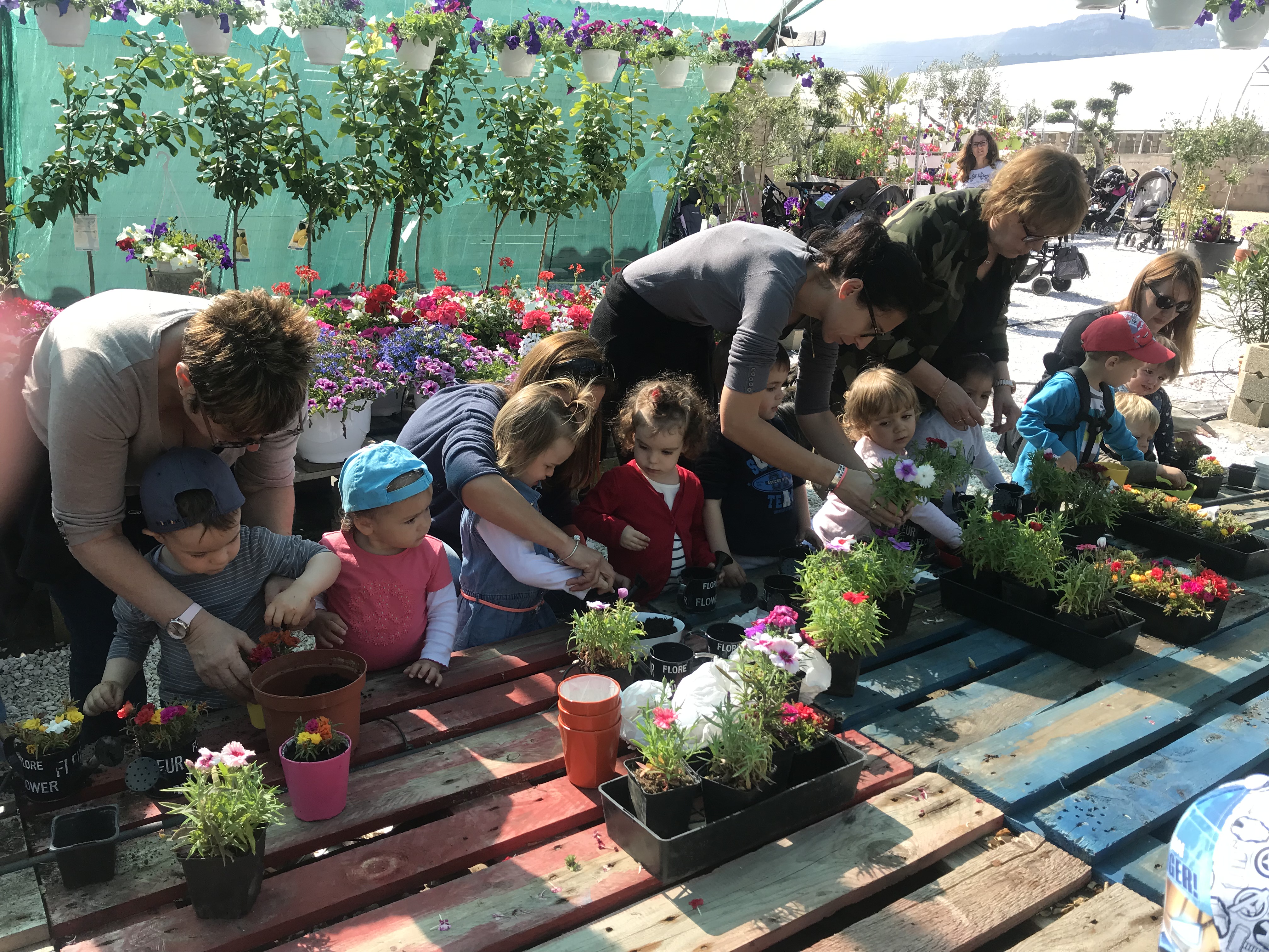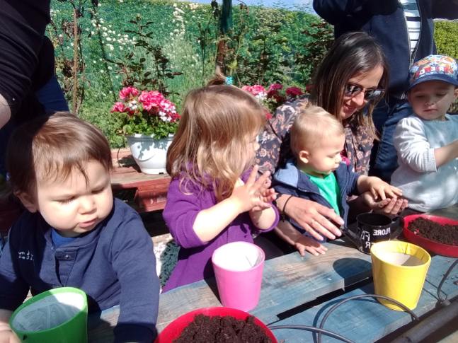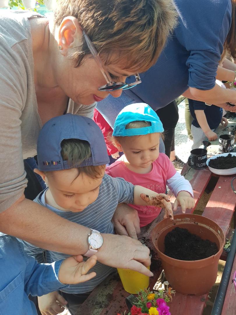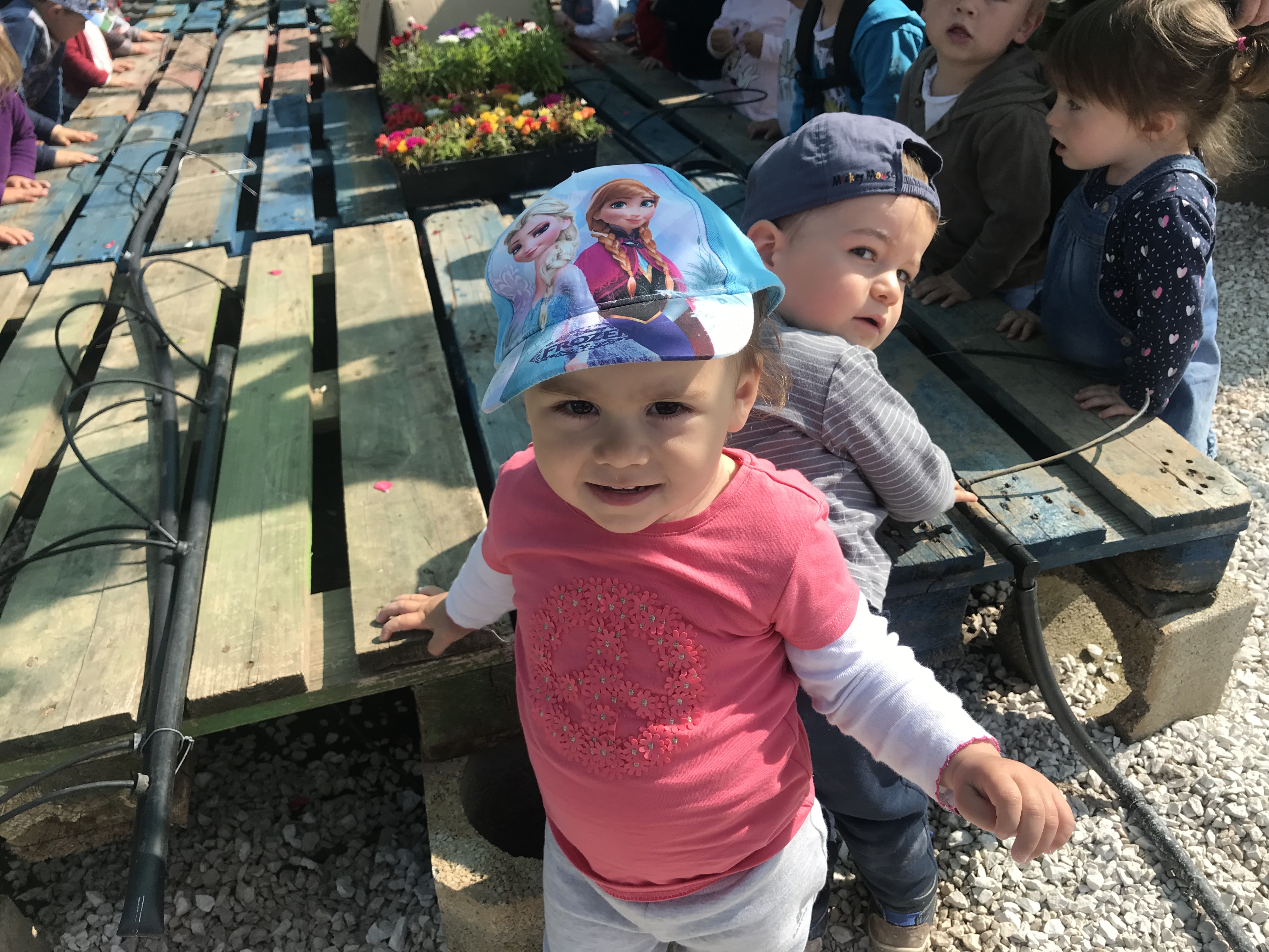 Les enfants pour les plus grands ont mis de la terre au fond du pot, ensuite mis les fleurs avec l’aide de nounou.
