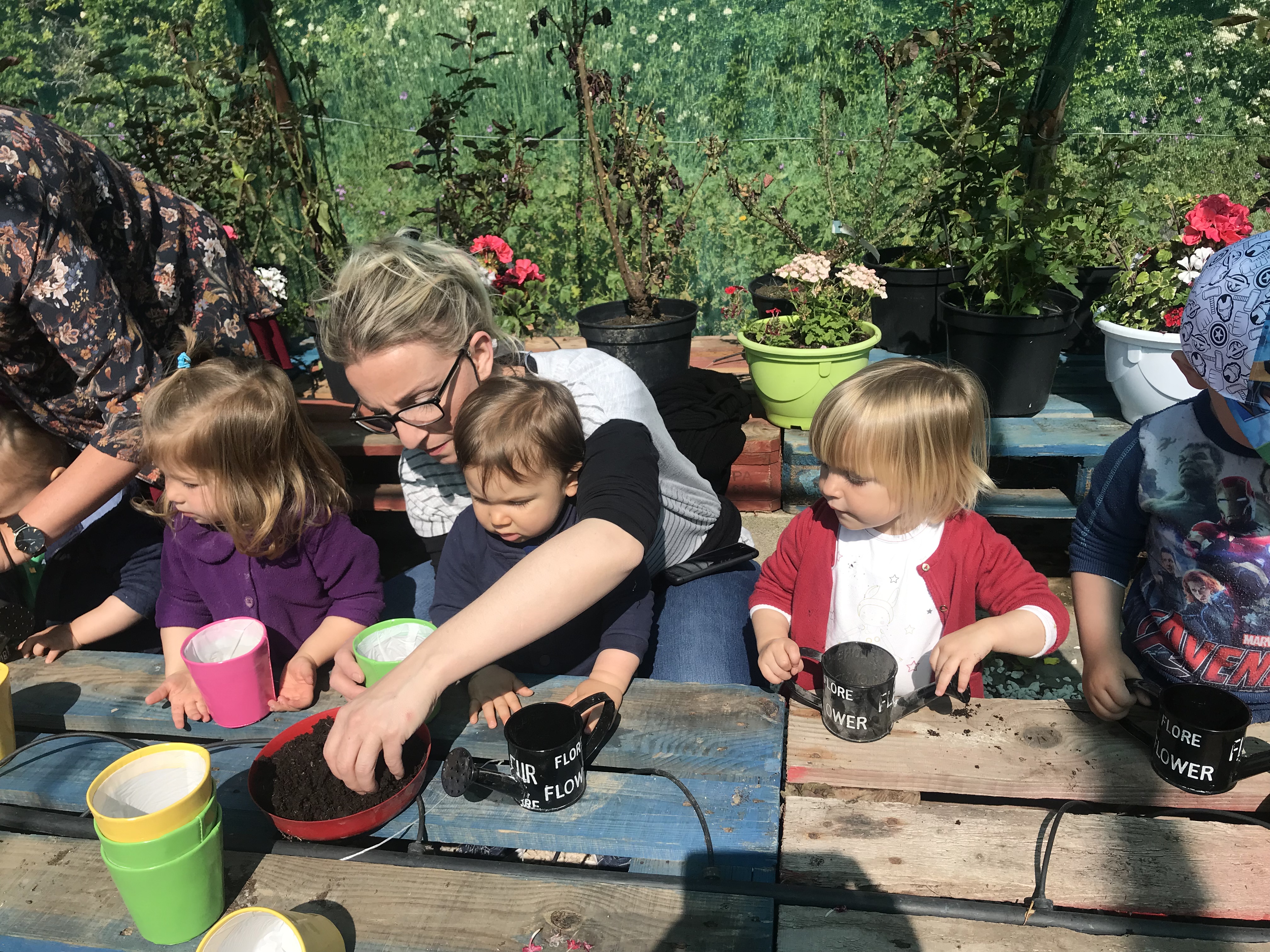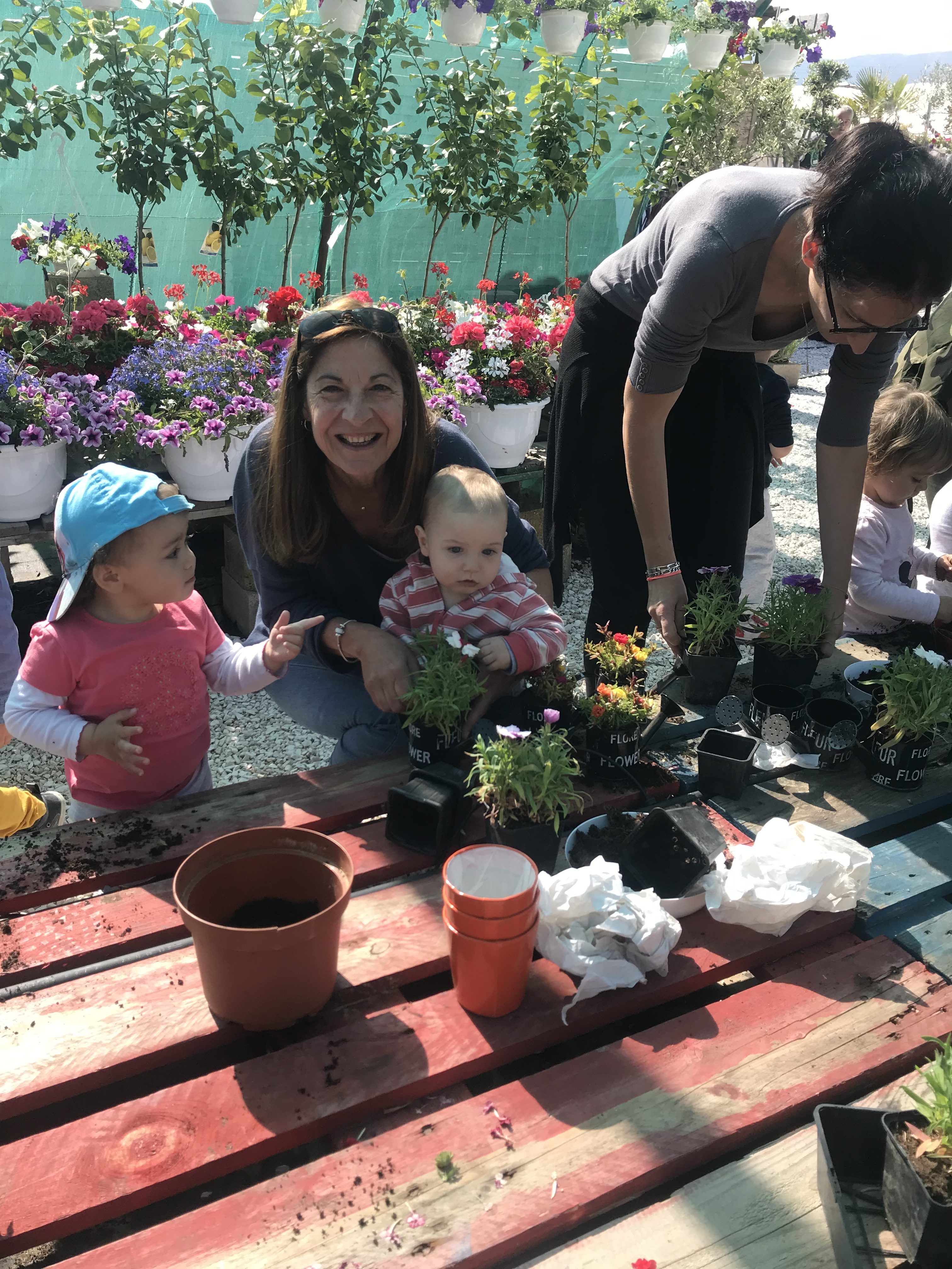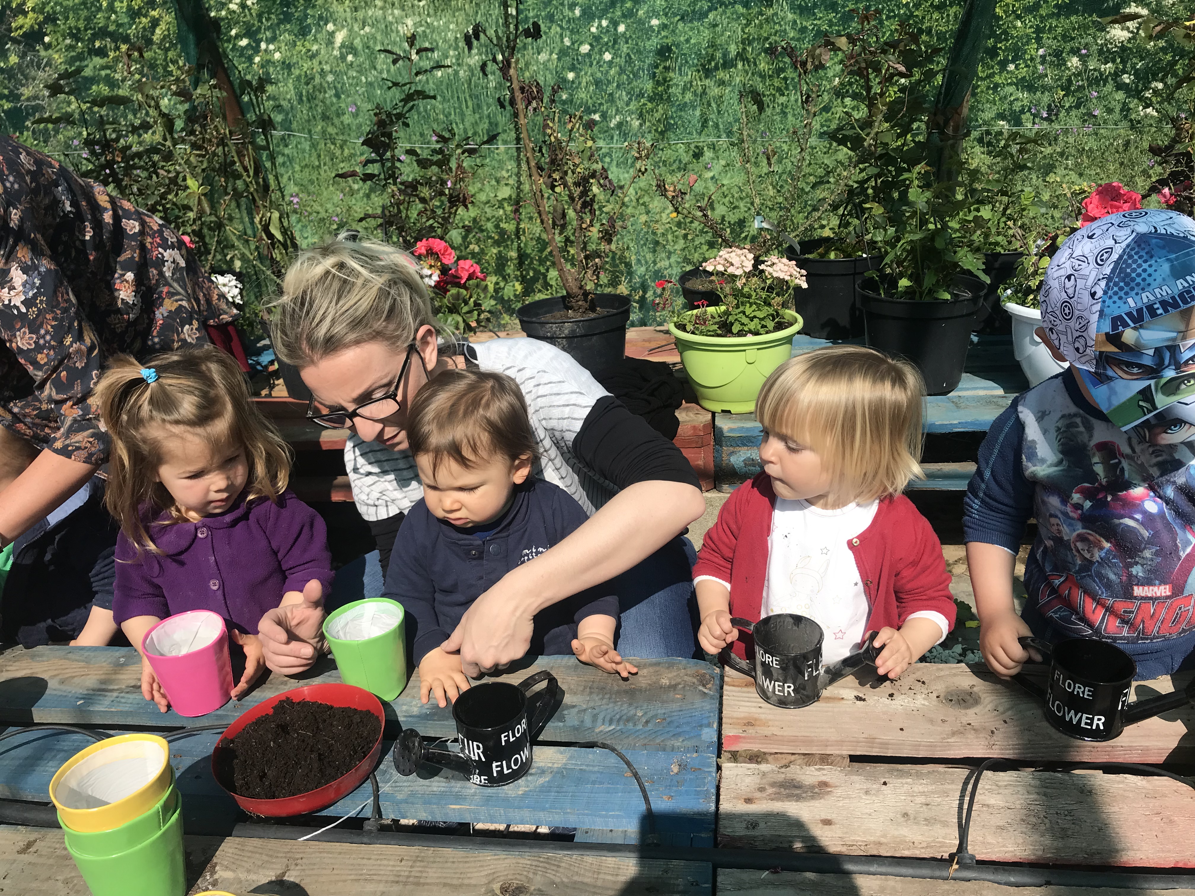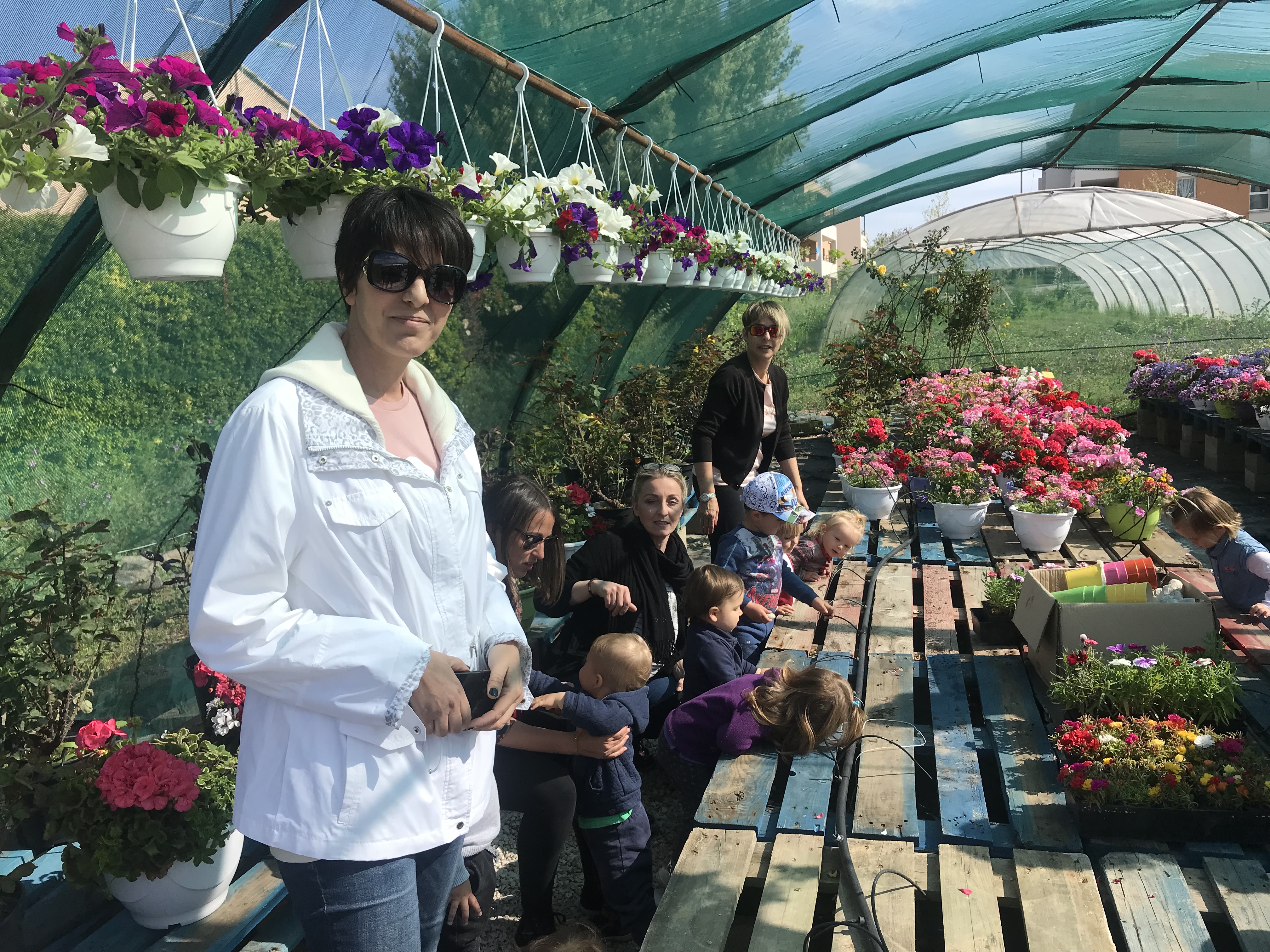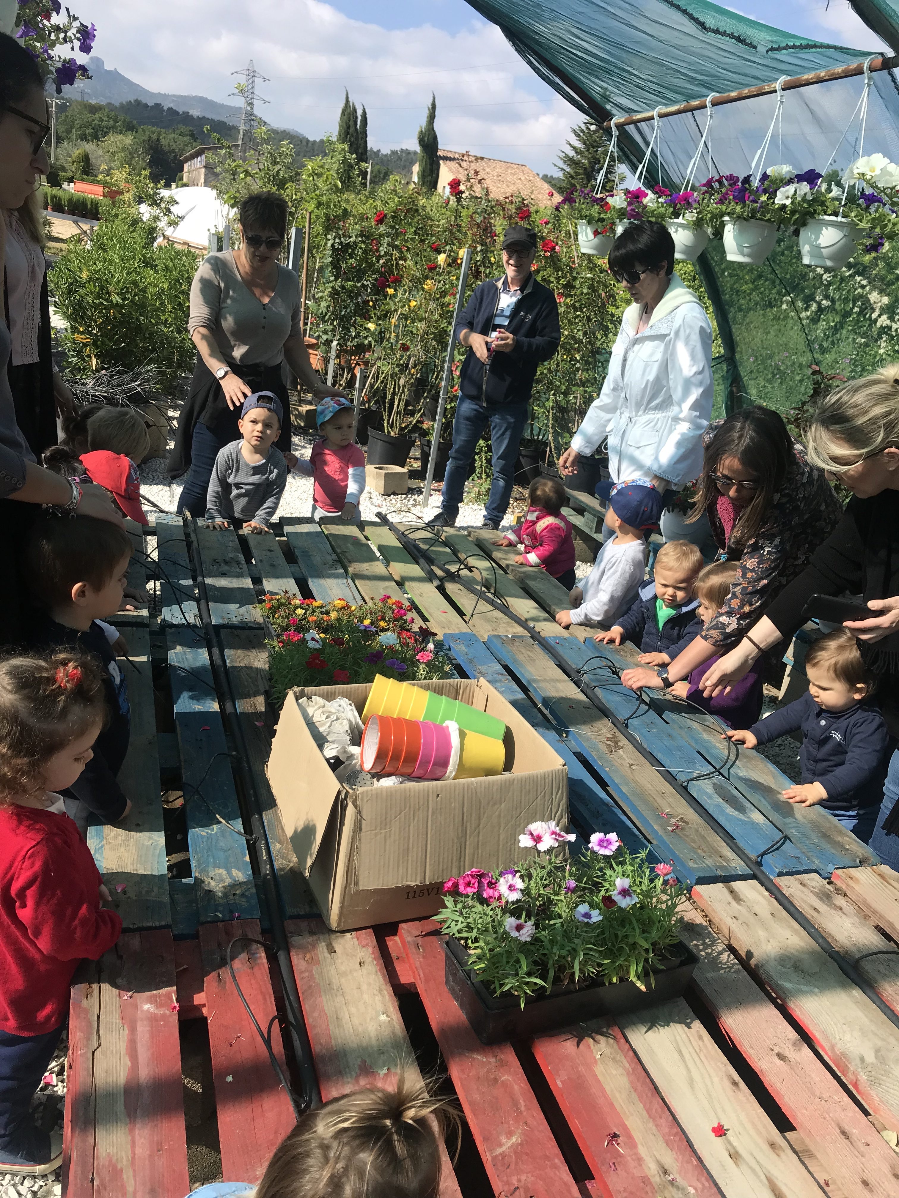 Les enfants pour les plus grands ont mis de la terre au fond du pot, ensuite mis les fleurs avec l’aide de nounou.
