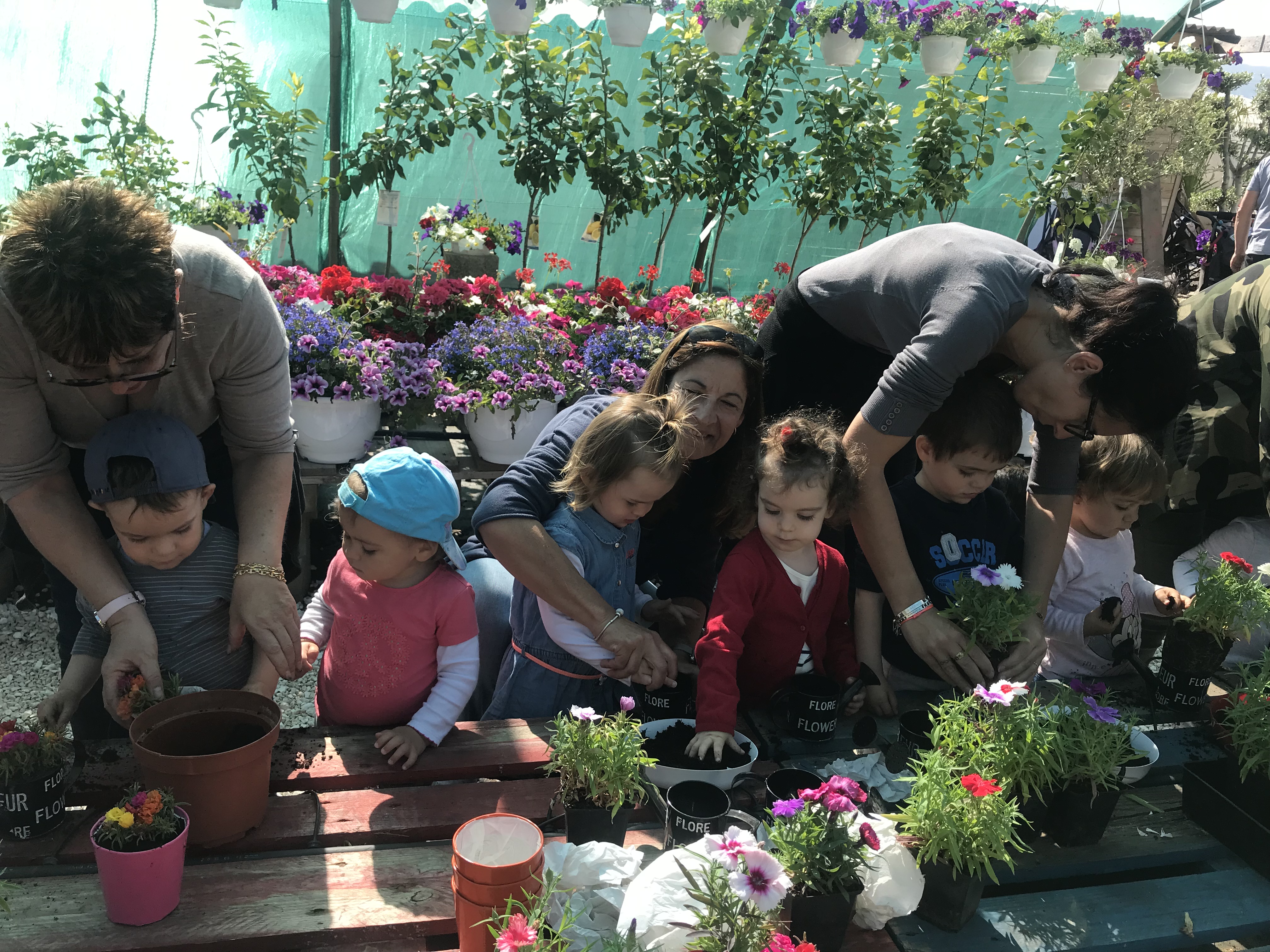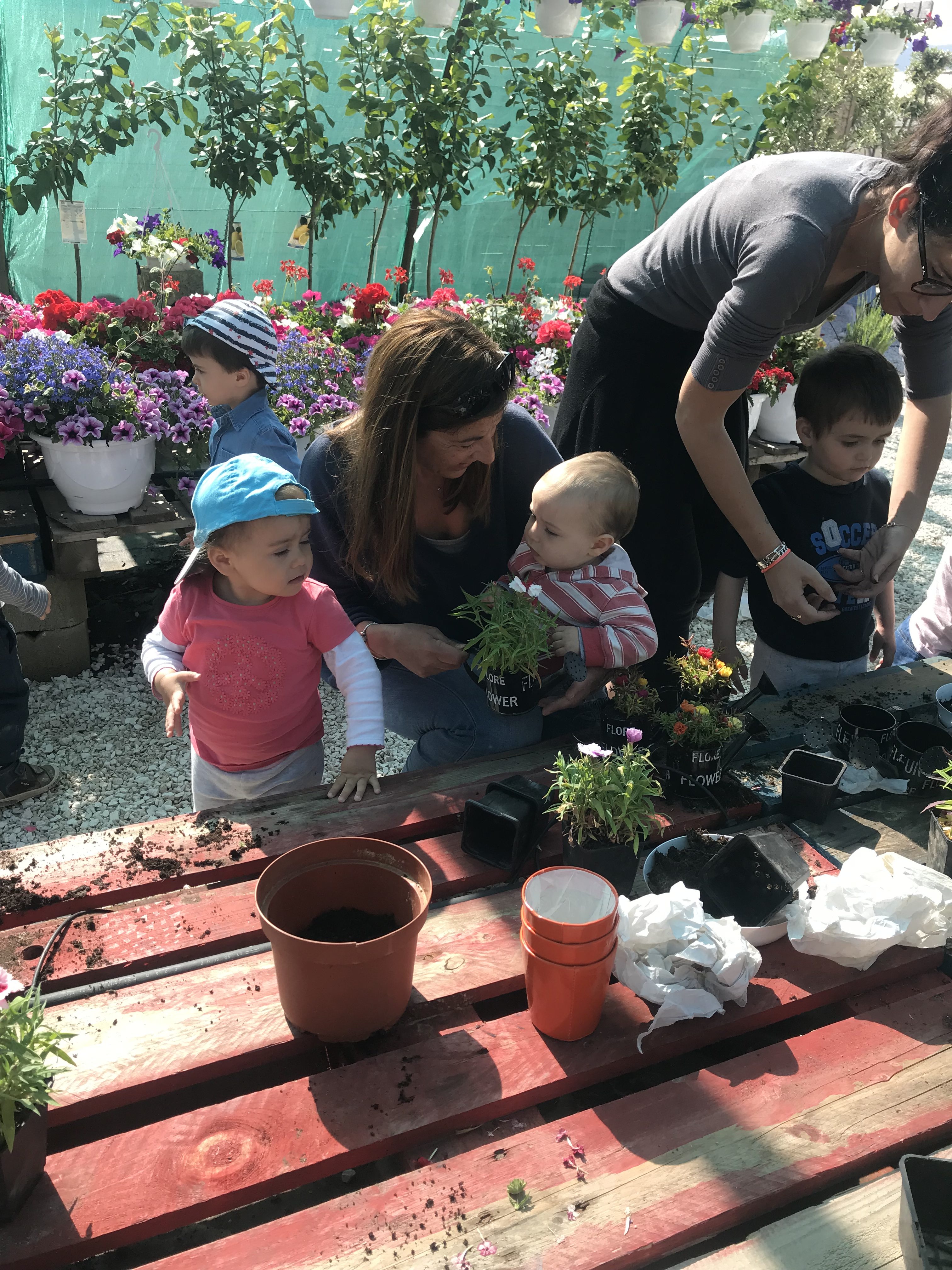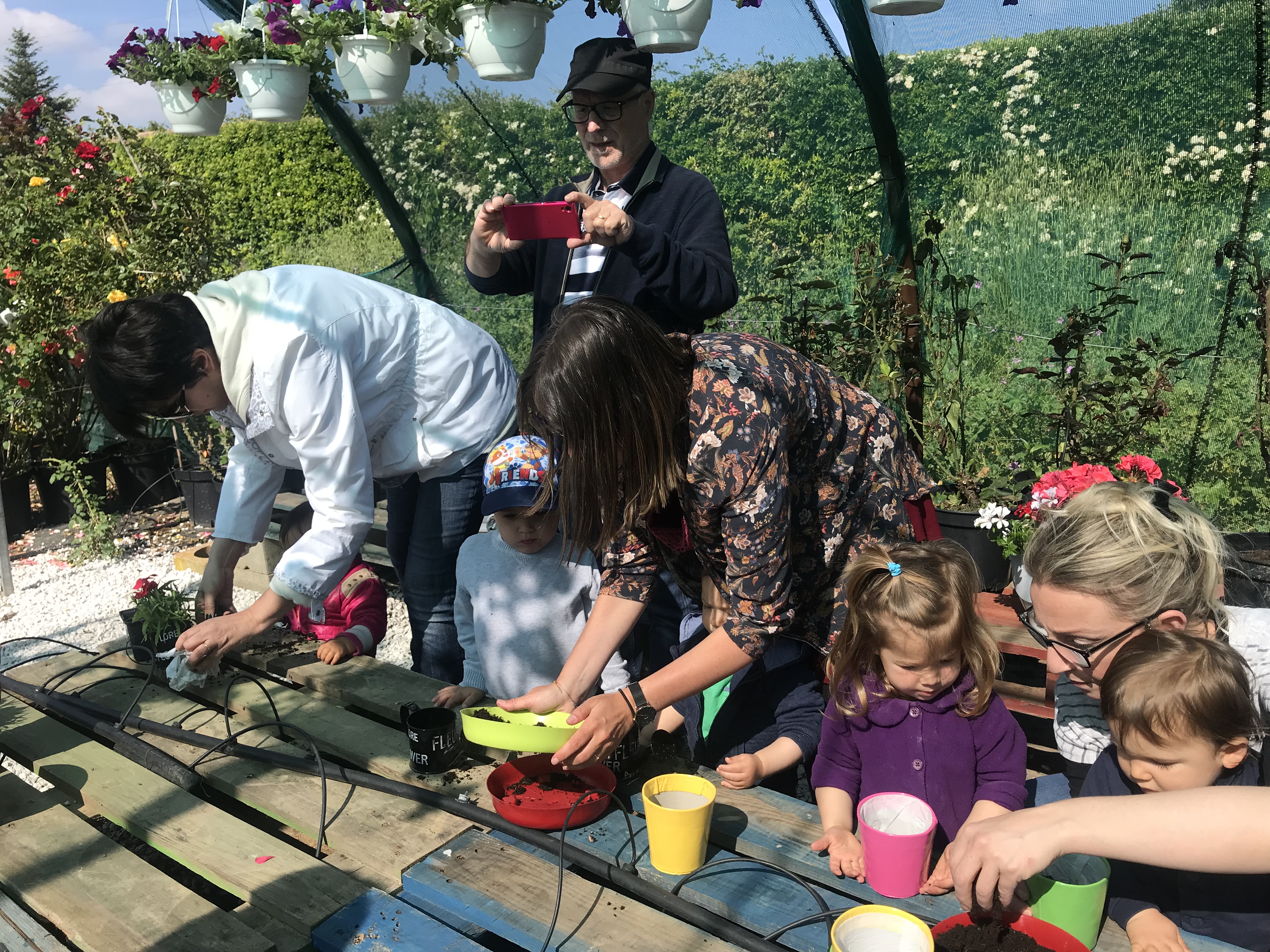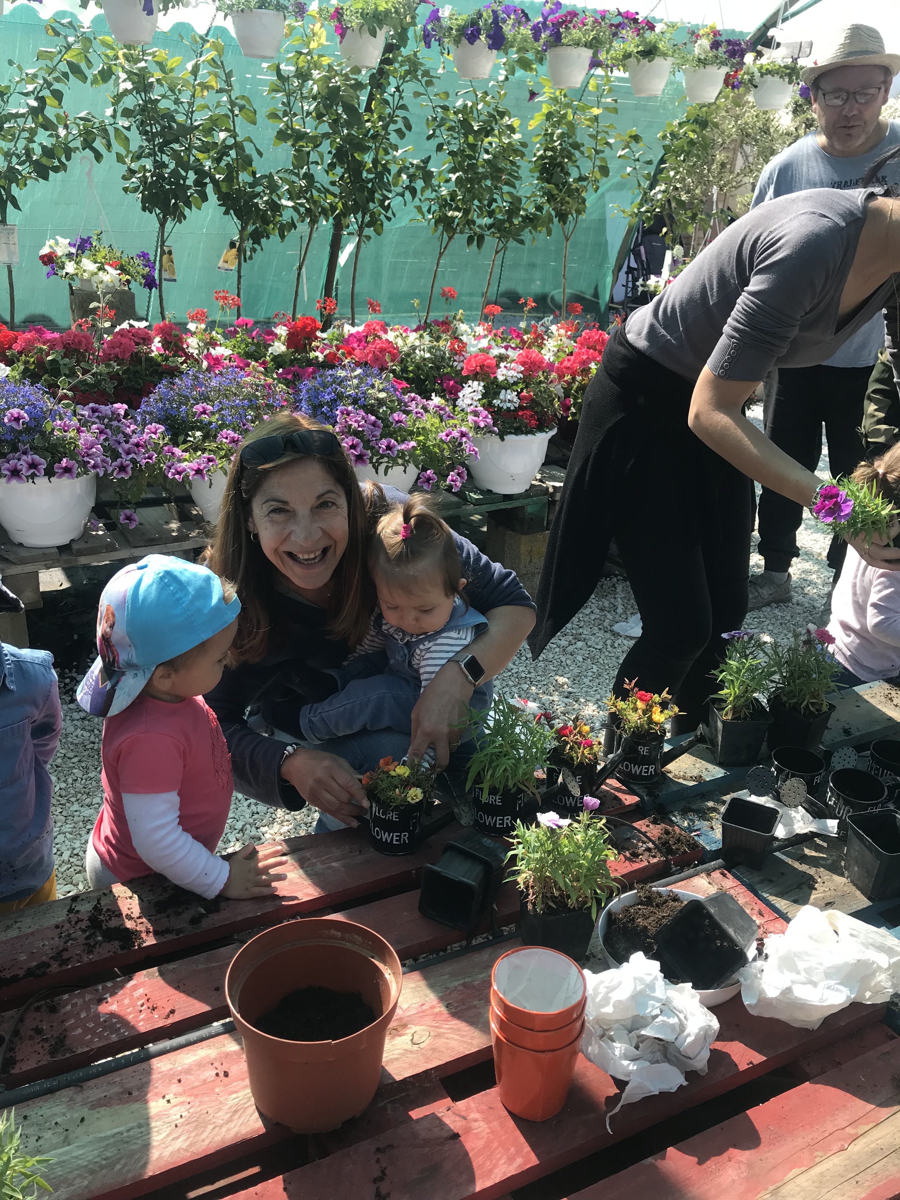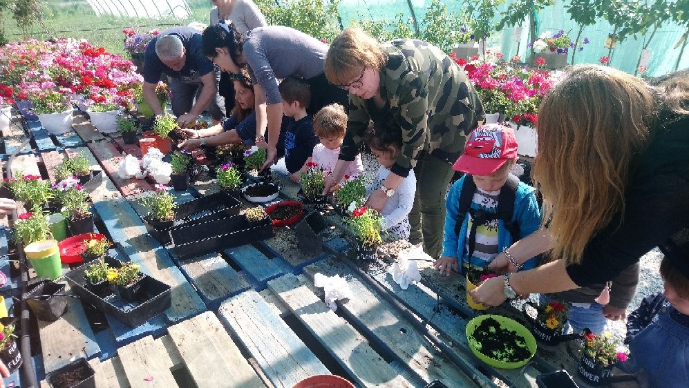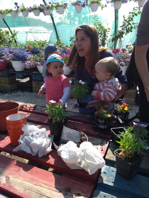 Les enfants pour les plus grands ont mis de la terre au fond du pot, ensuite mis les fleurs avec l’aide de nounou.