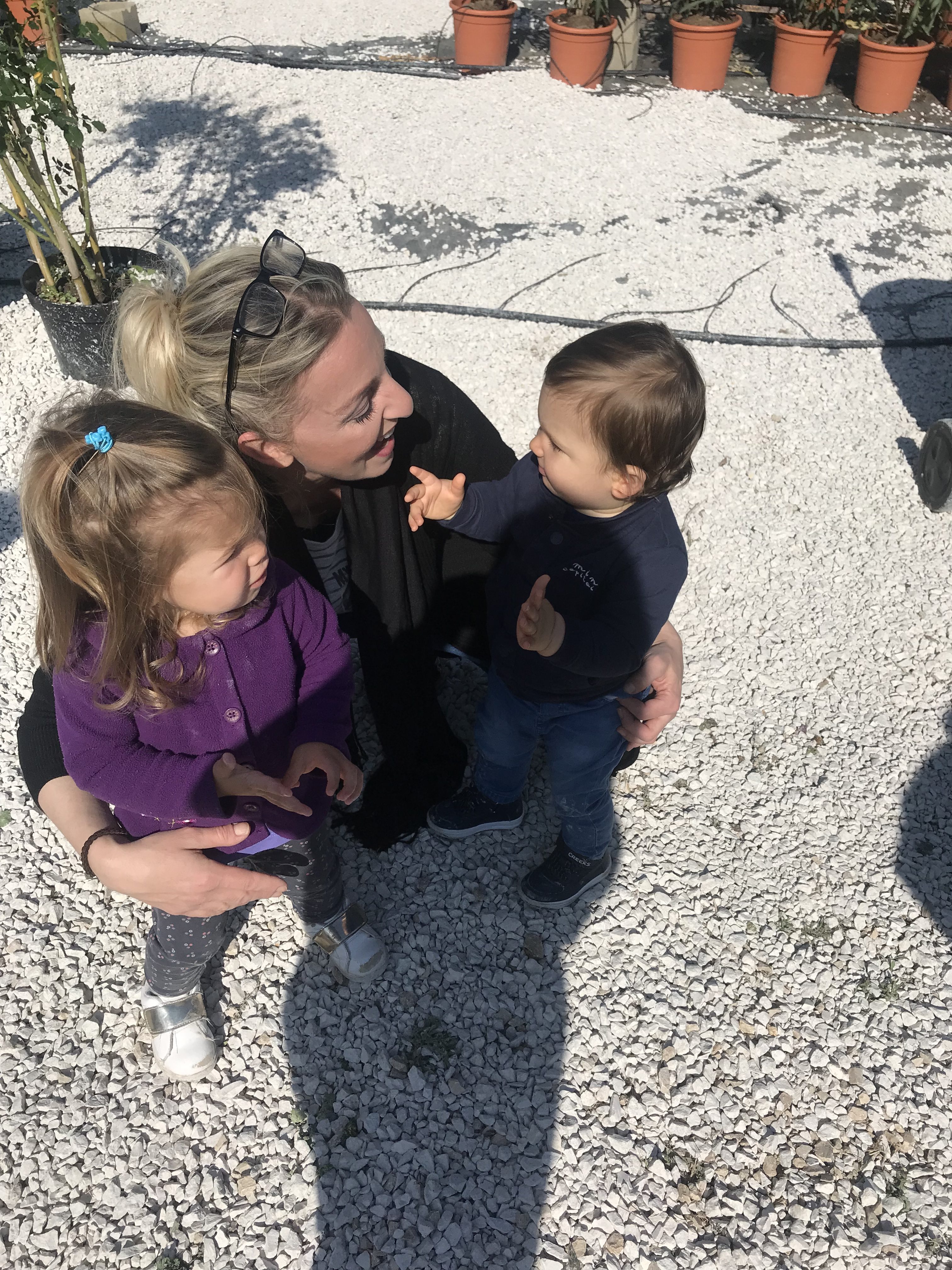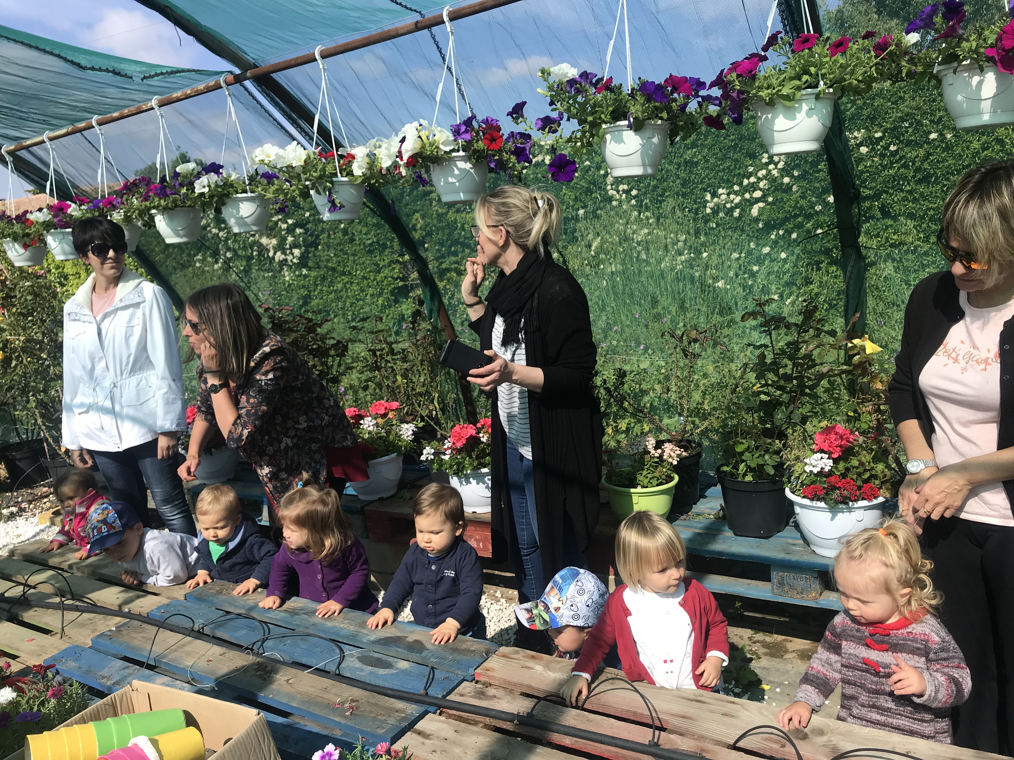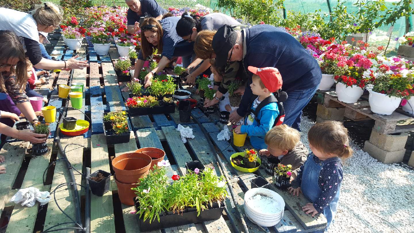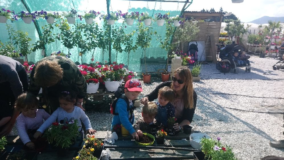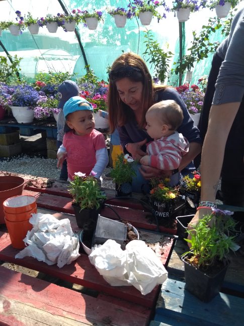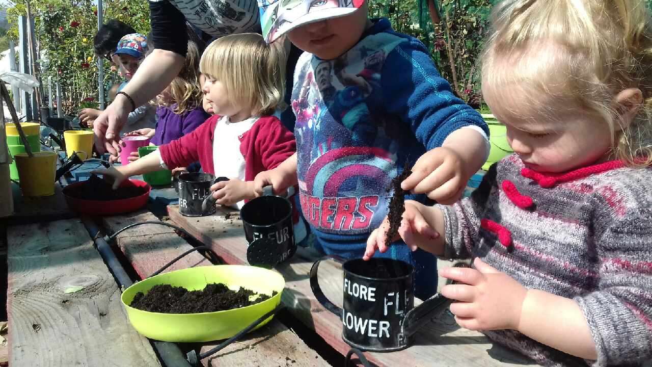 Les enfants pour les plus grands ont mis de la terre au fond du pot, ensuite mis les fleurs avec l’aide de nounou.