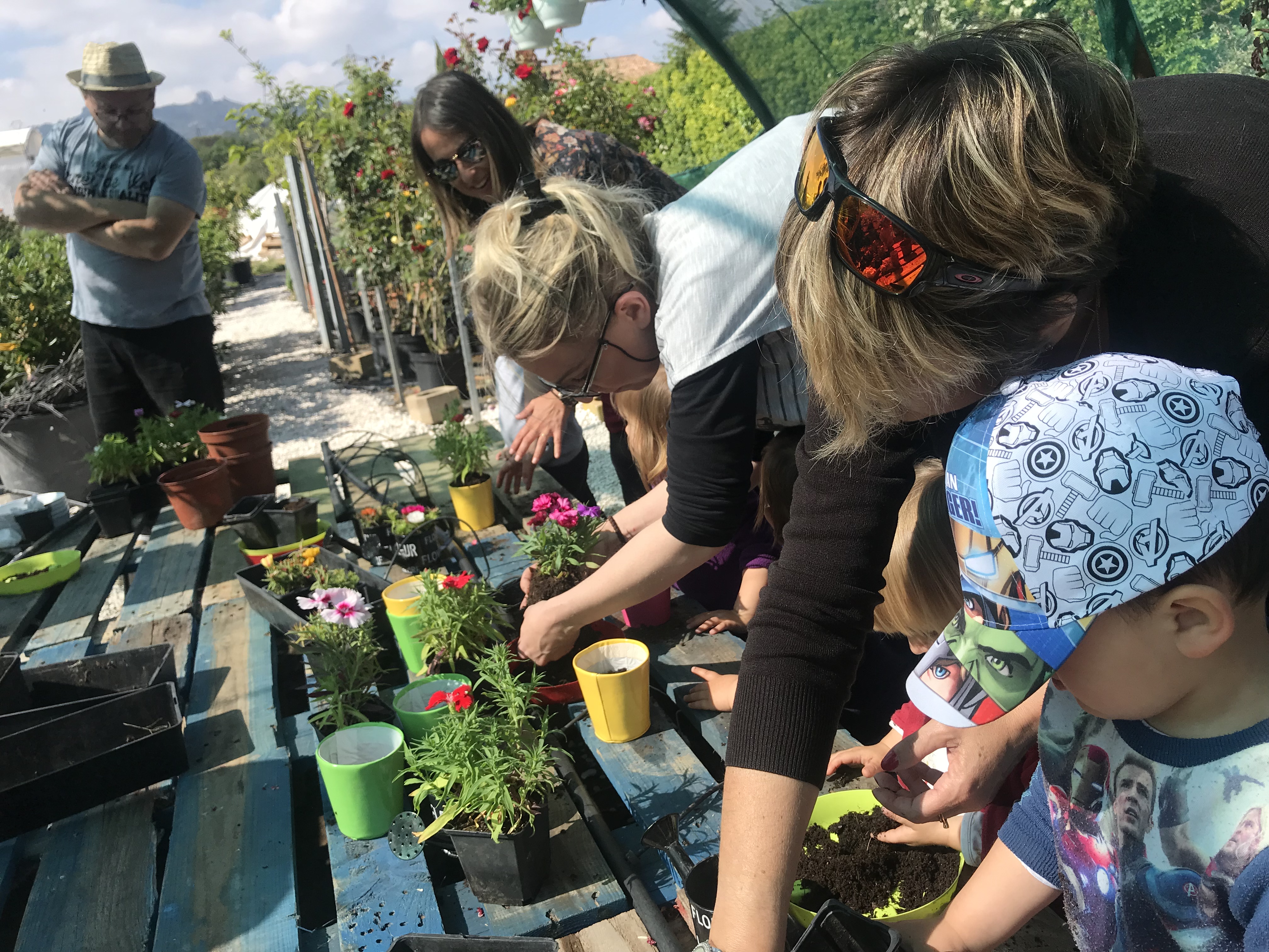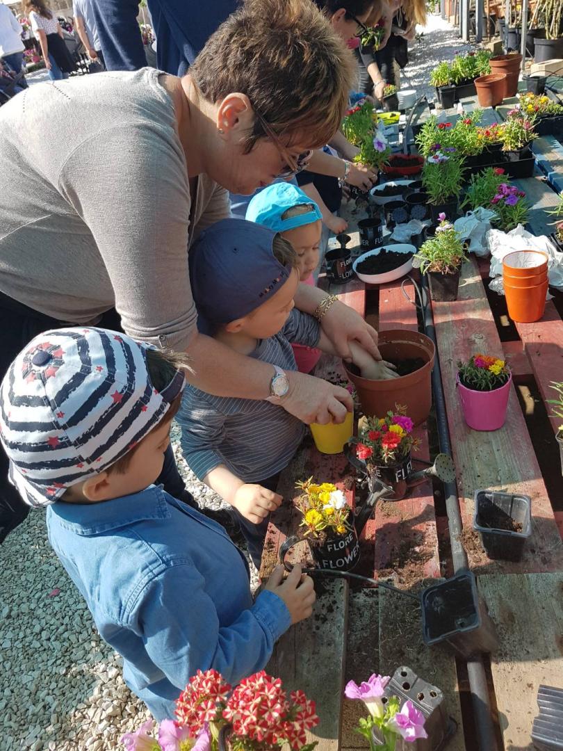 Les enfants pour les plus grands ont mis de la terre au fond du pot, ensuite mis les fleurs avec l’aide de nounou.