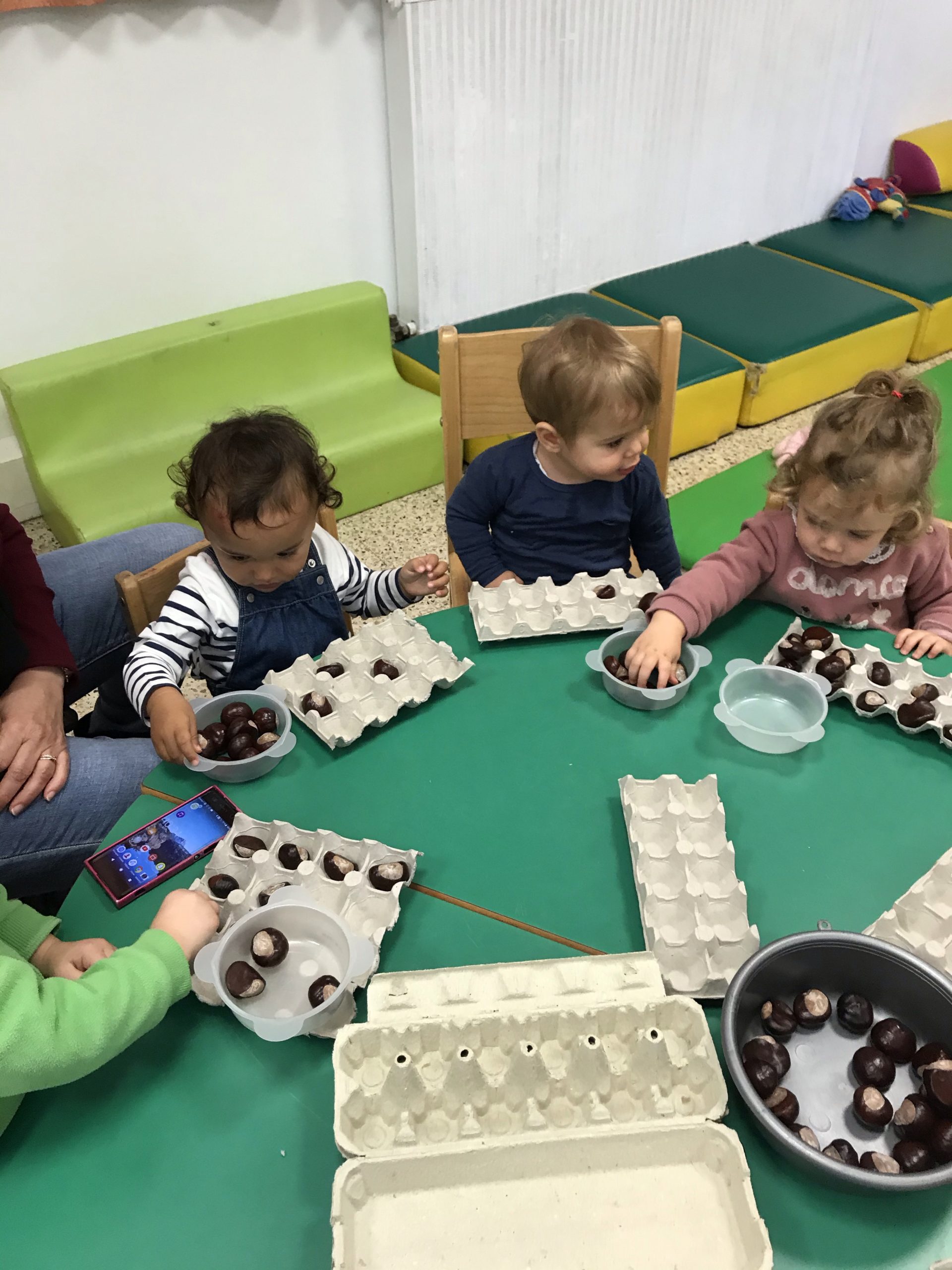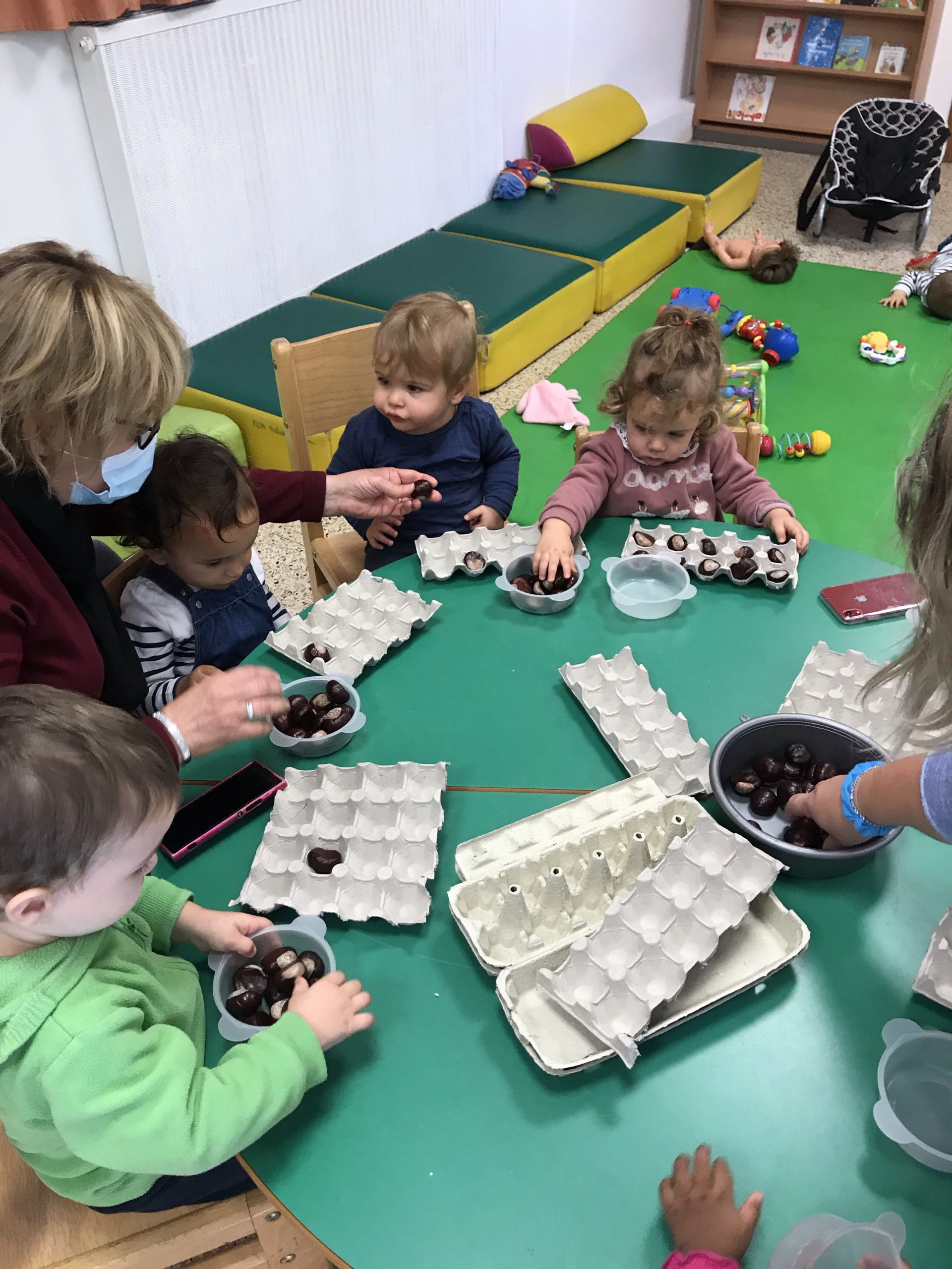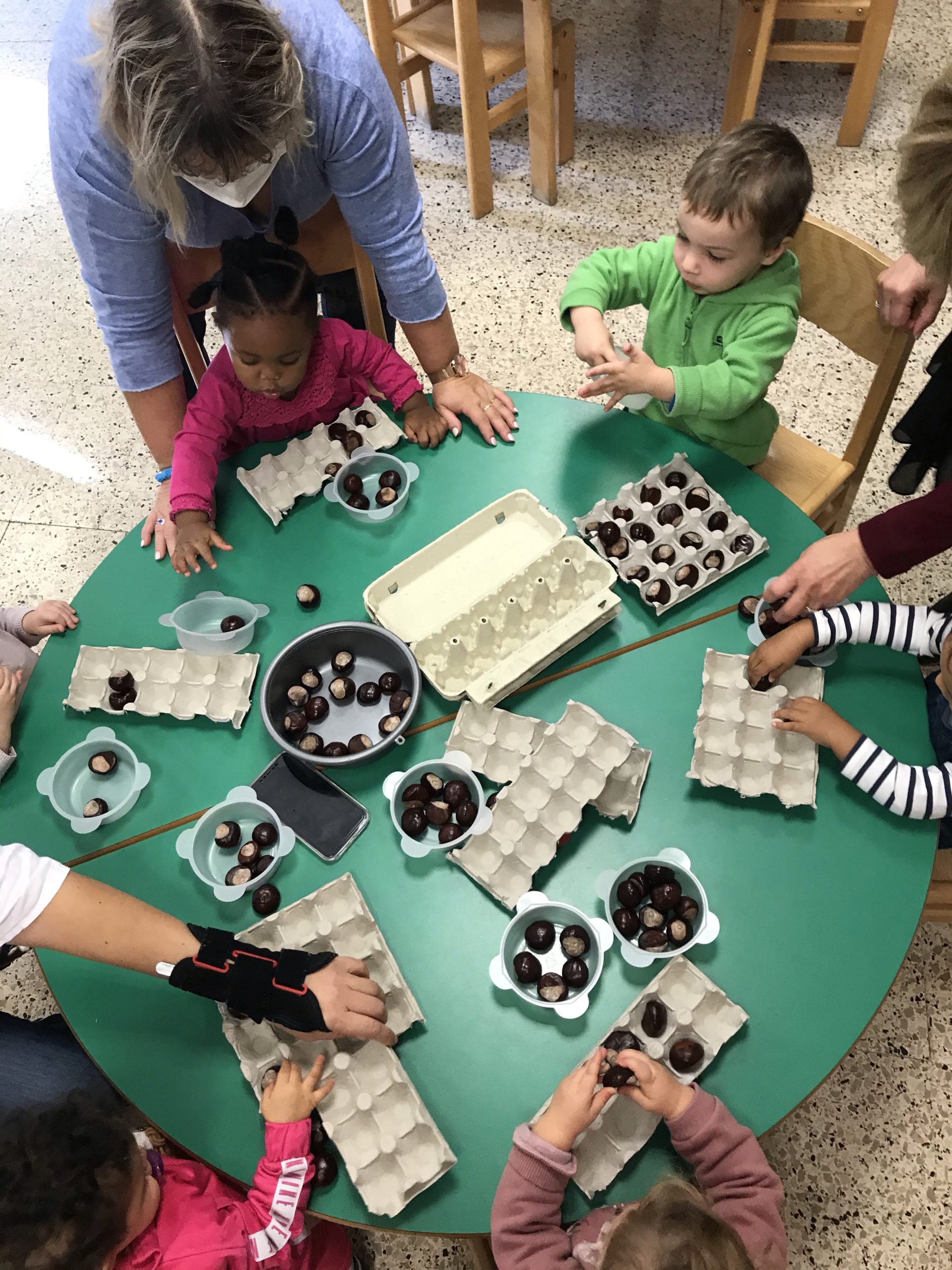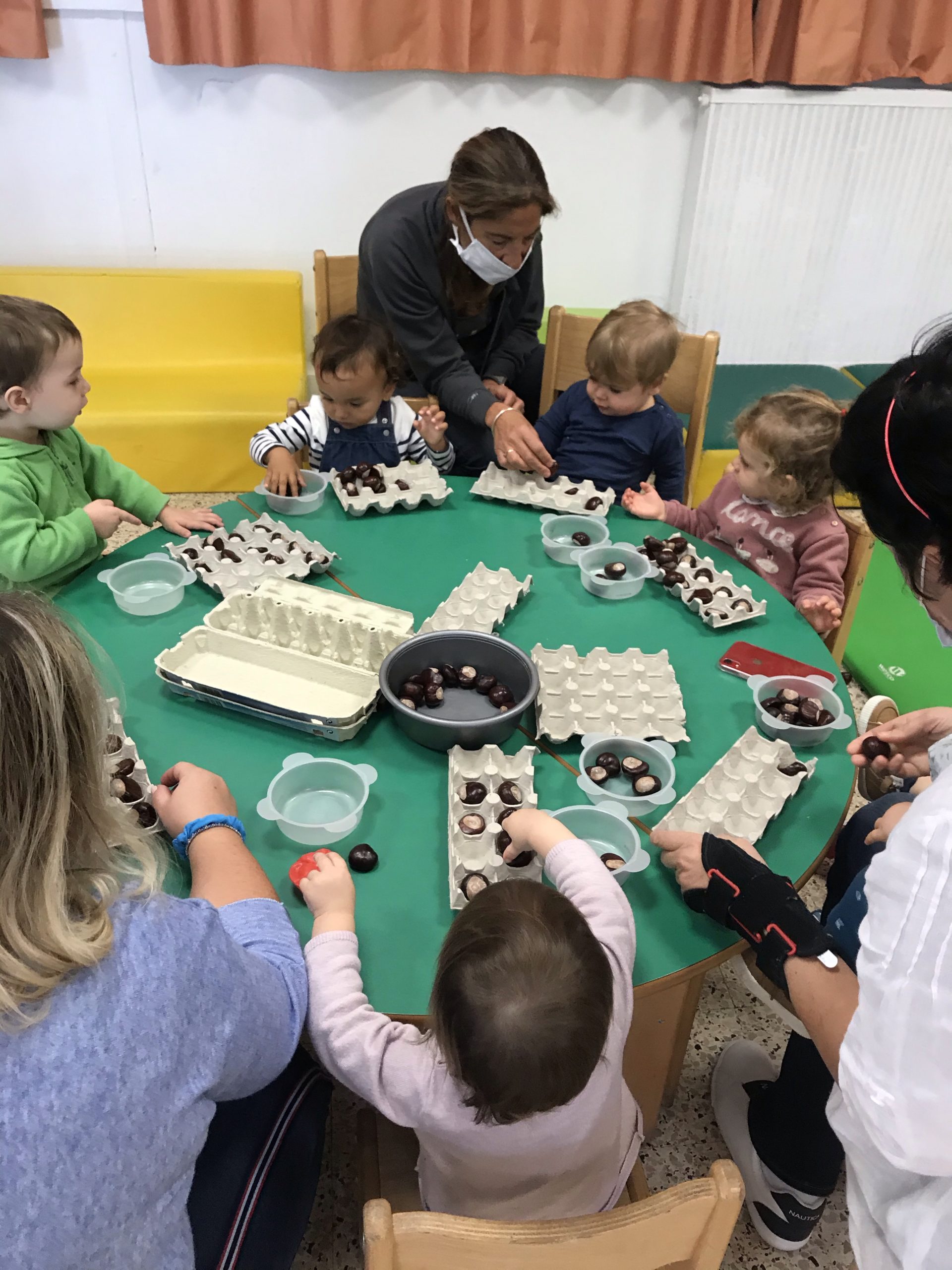 Des boites à œufs, le but du jeu étant de mettre un marron dans chaque trou de la boite. Pas simple suivant l’âge de l’enfant, rigolo pour les plus grands de faire ensemble, un partage plutôt agréable, c’était un chouette moment.