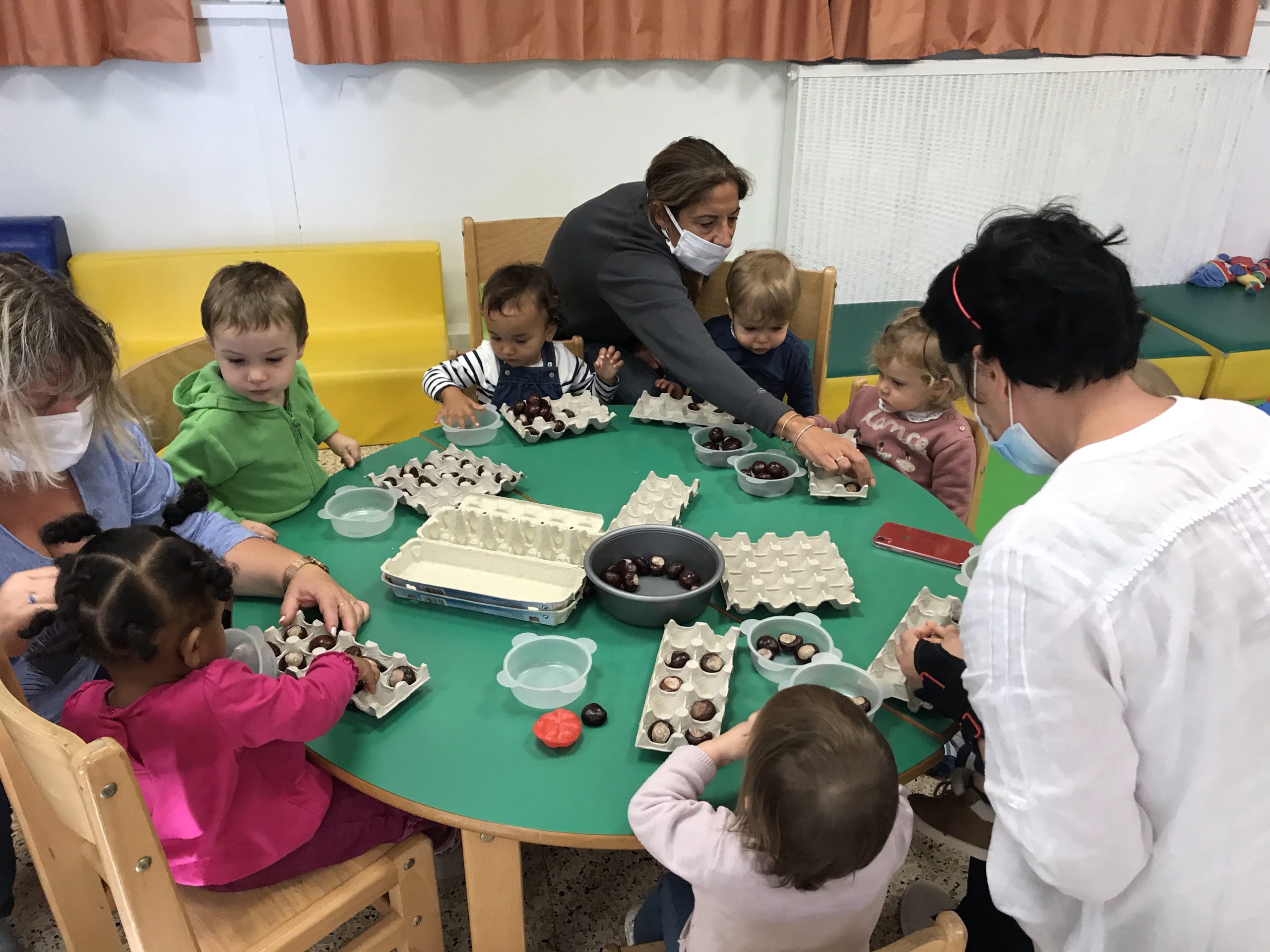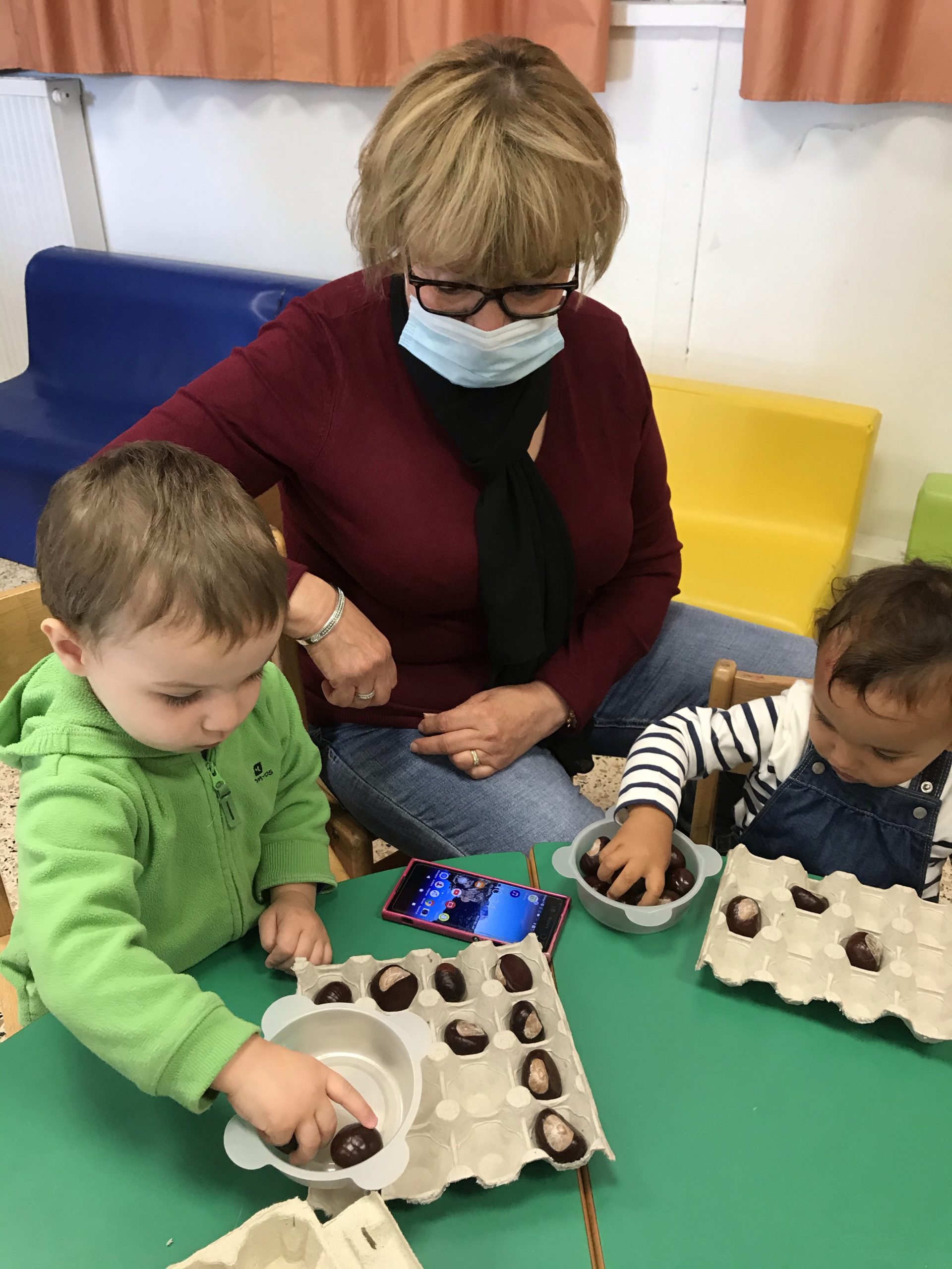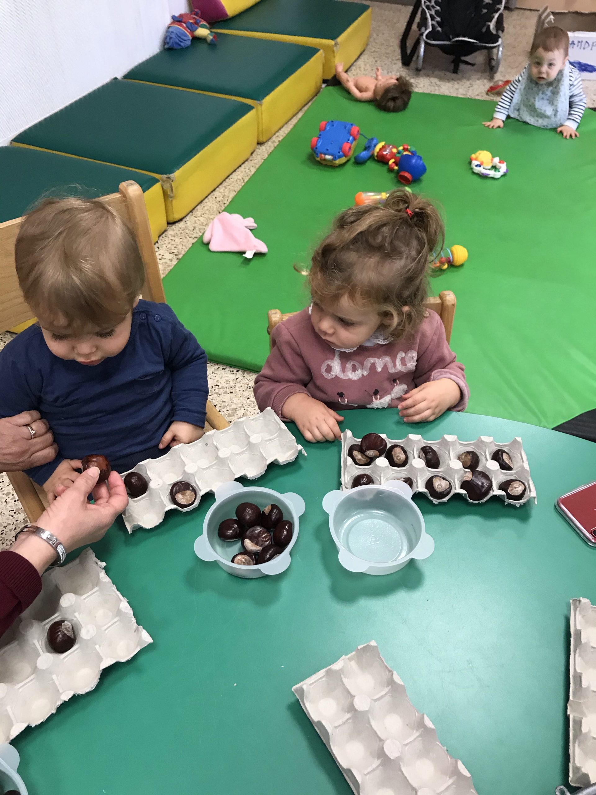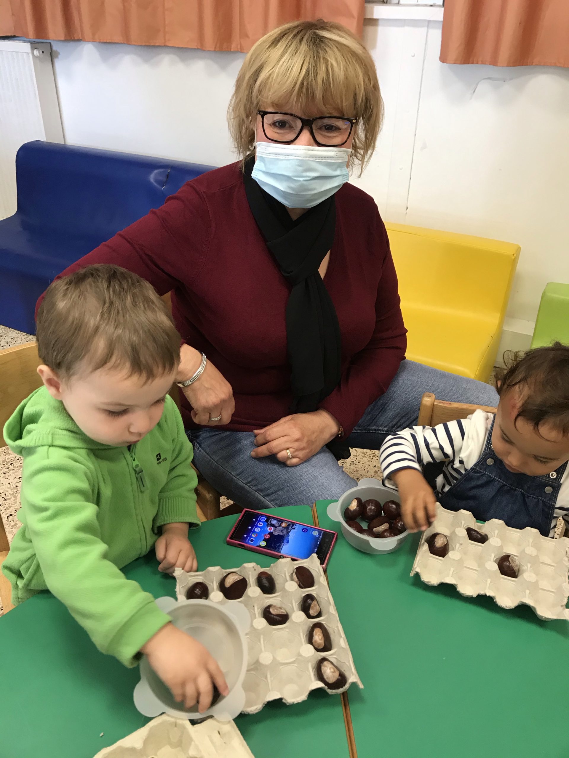 Des boites à œufs, le but du jeu étant de mettre un marron dans chaque trou de la boite. Pas simple suivant l’âge de l’enfant, rigolo pour les plus grands de faire ensemble, un partage plutôt agréable, c’était un chouette moment.