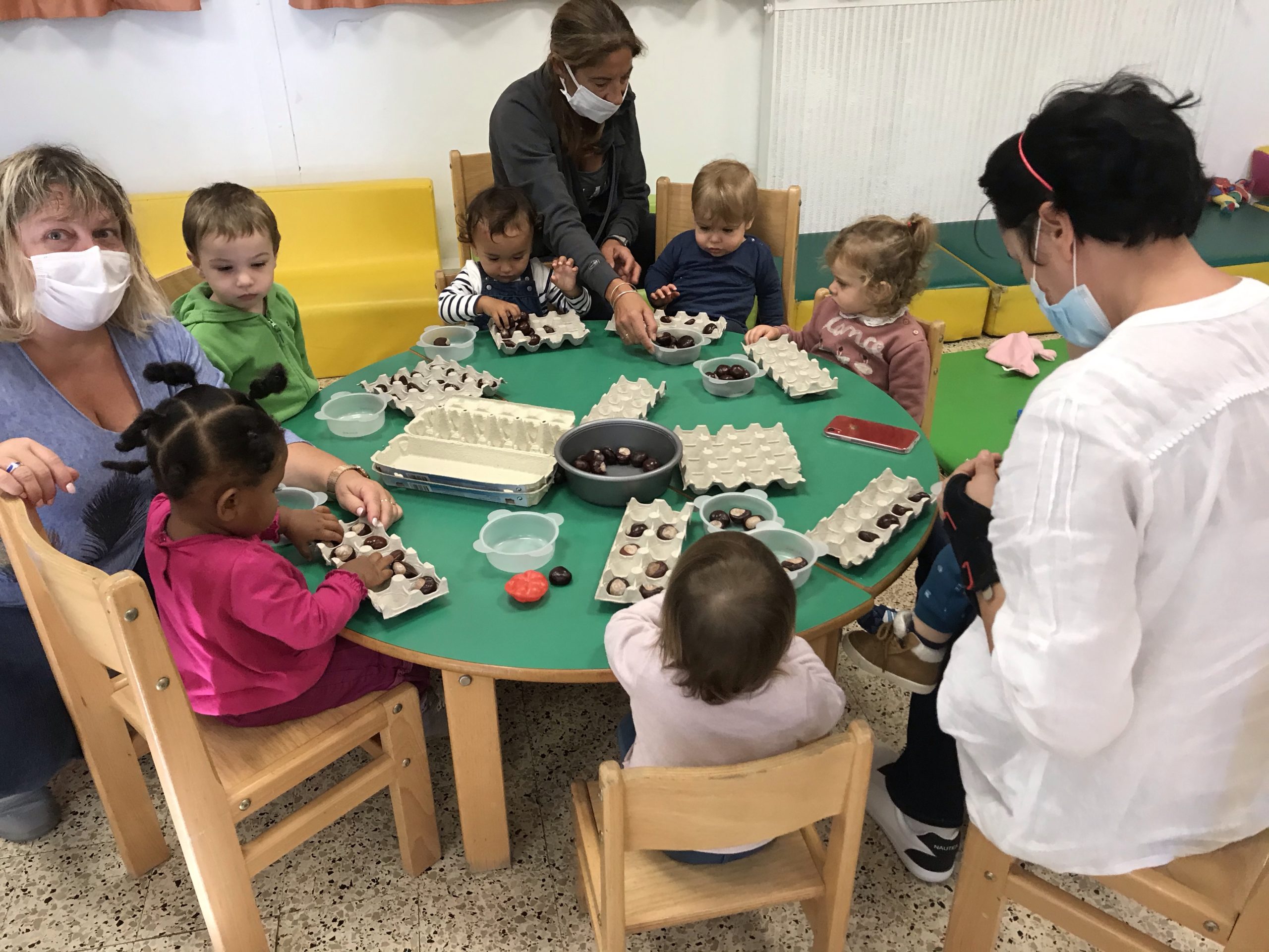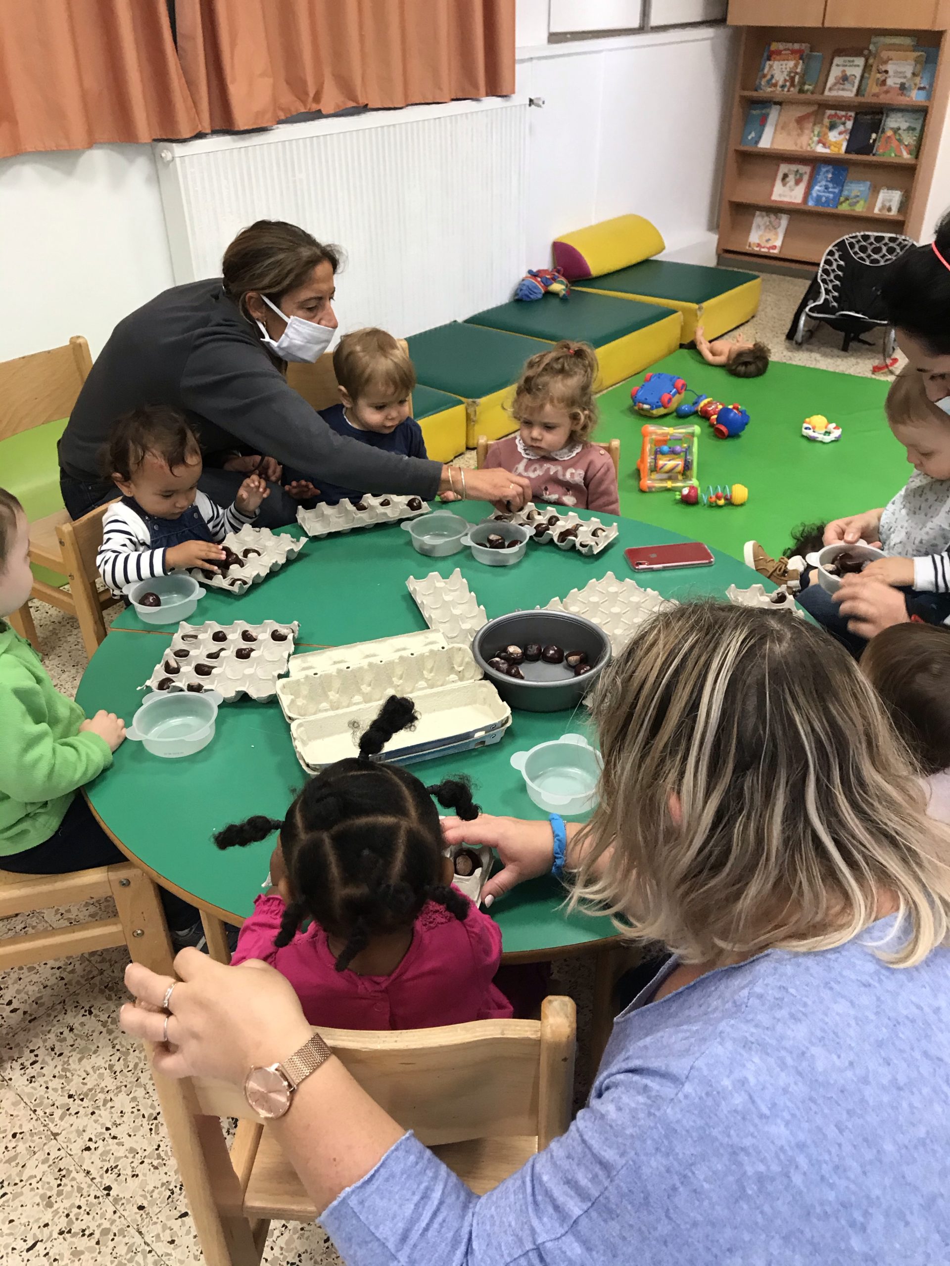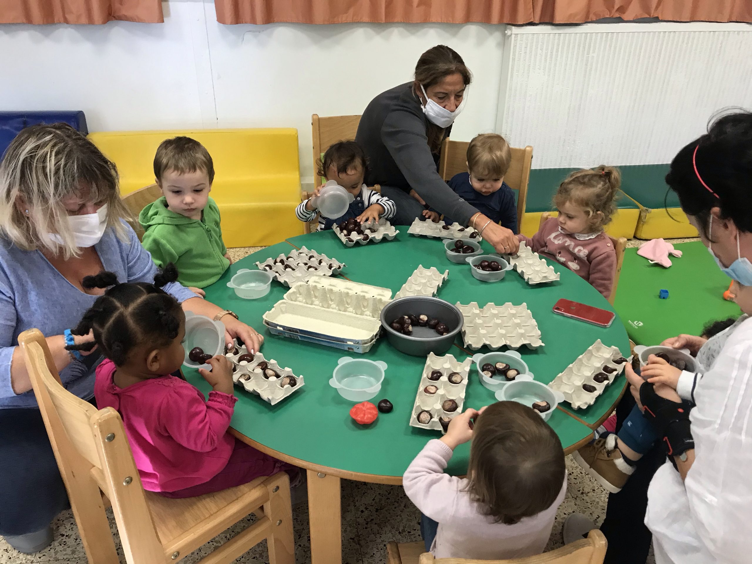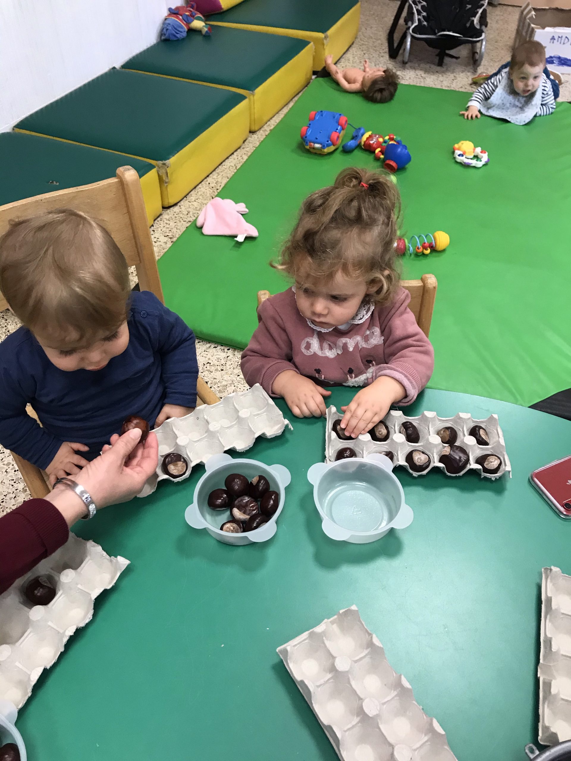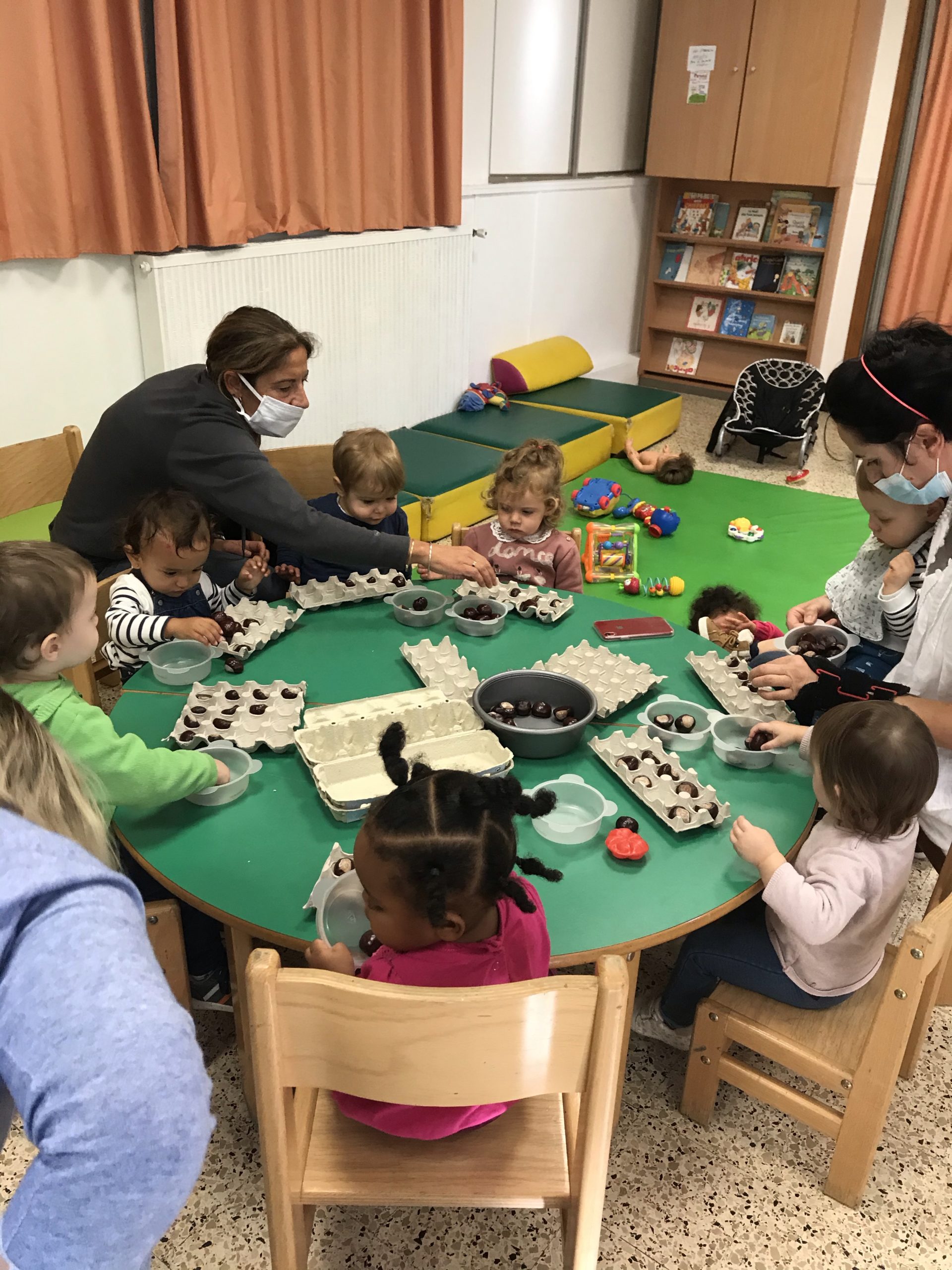 Des boites à œufs, le but du jeu étant de mettre un marron dans chaque trou de la boite. Pas simple suivant l’âge de l’enfant, rigolo pour les plus grands de faire ensemble, un partage plutôt agréable, c’était un chouette moment.