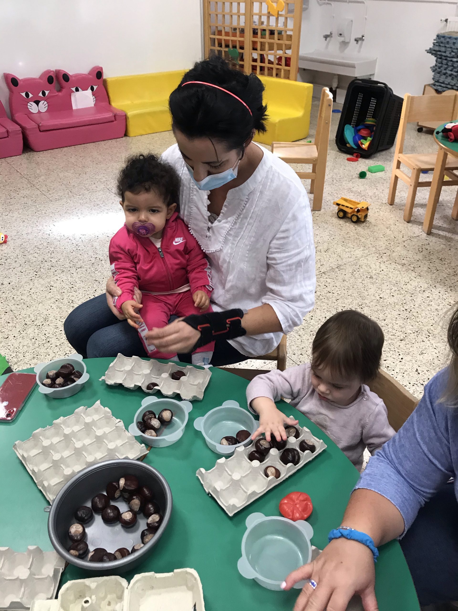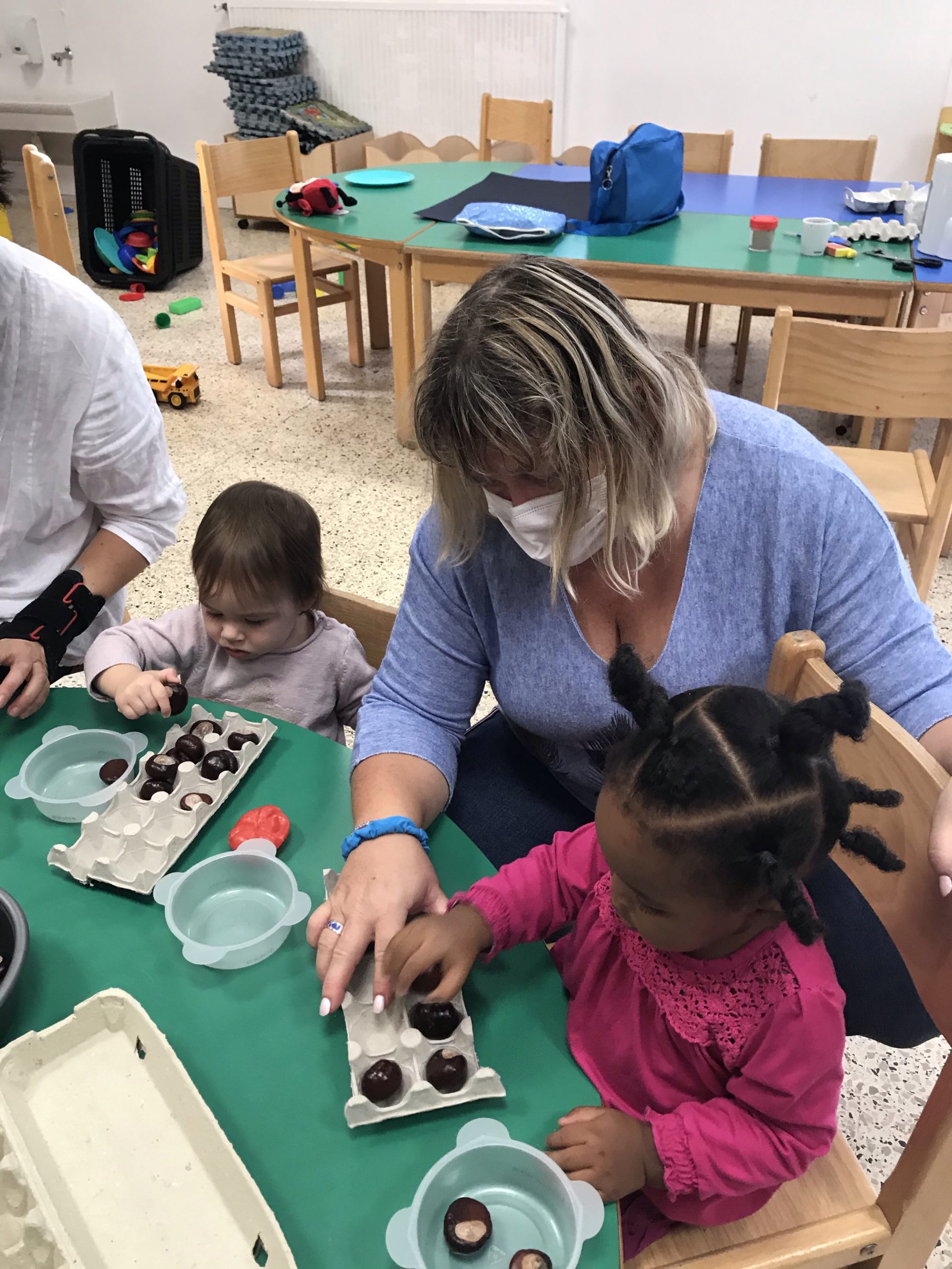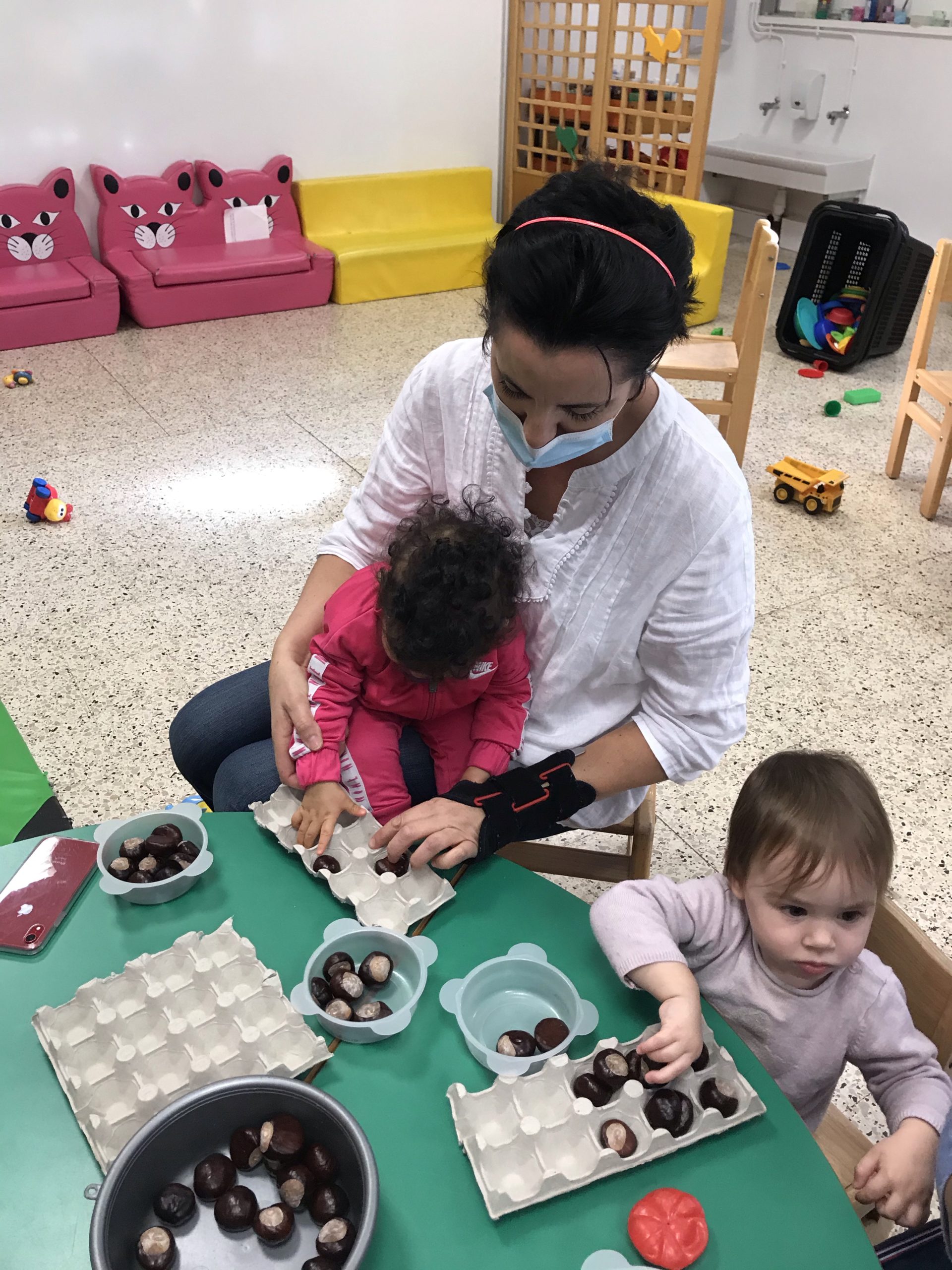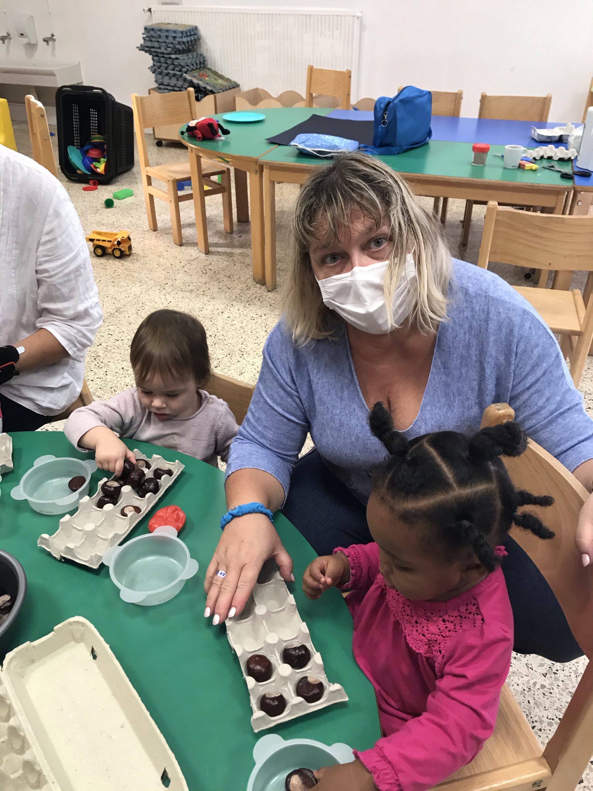 Des boites à œufs, le but du jeu étant de mettre un marron dans chaque trou de la boite. Pas simple suivant l’âge de l’enfant, rigolo pour les plus grands de faire ensemble, un partage plutôt agréable, c’était un chouette moment.