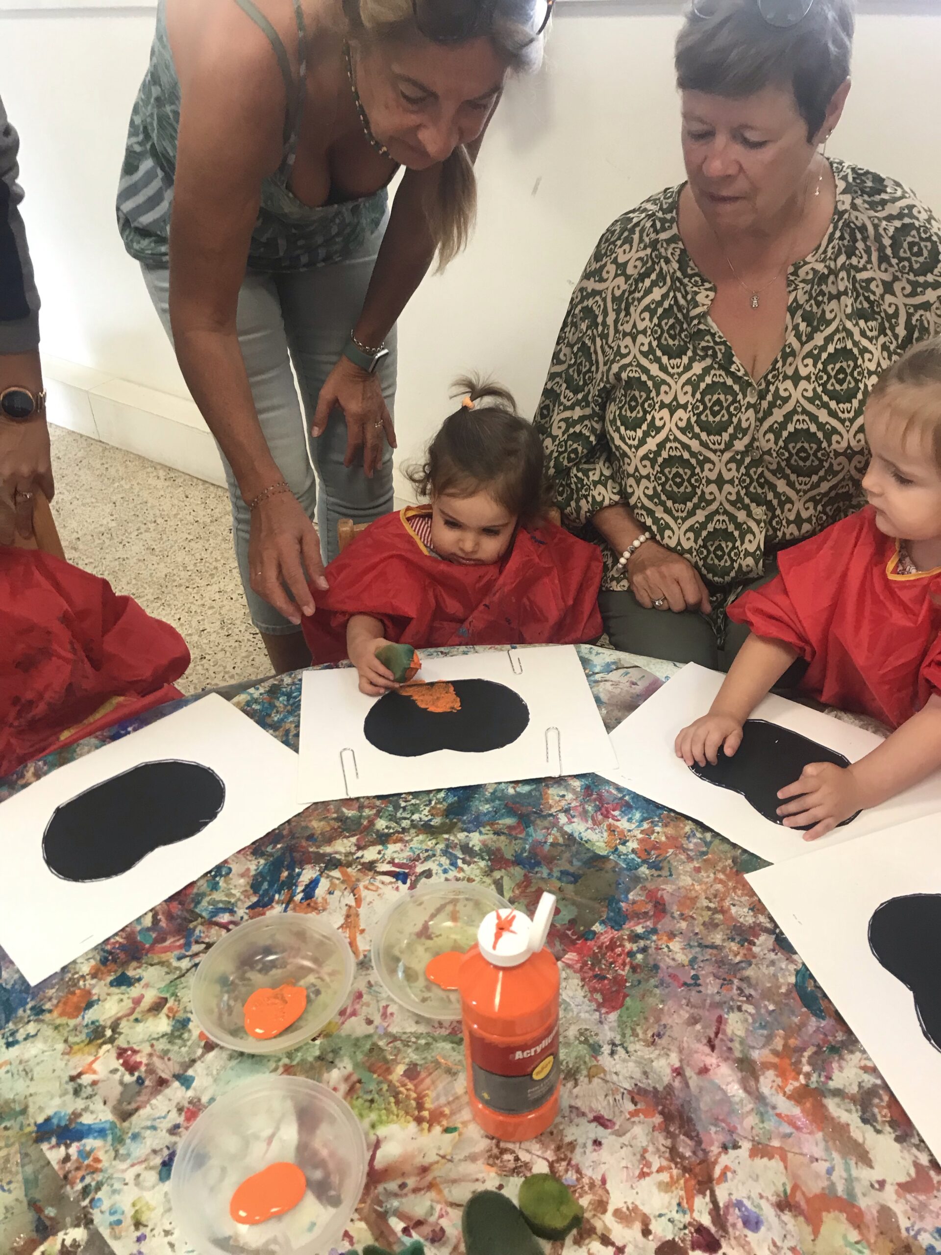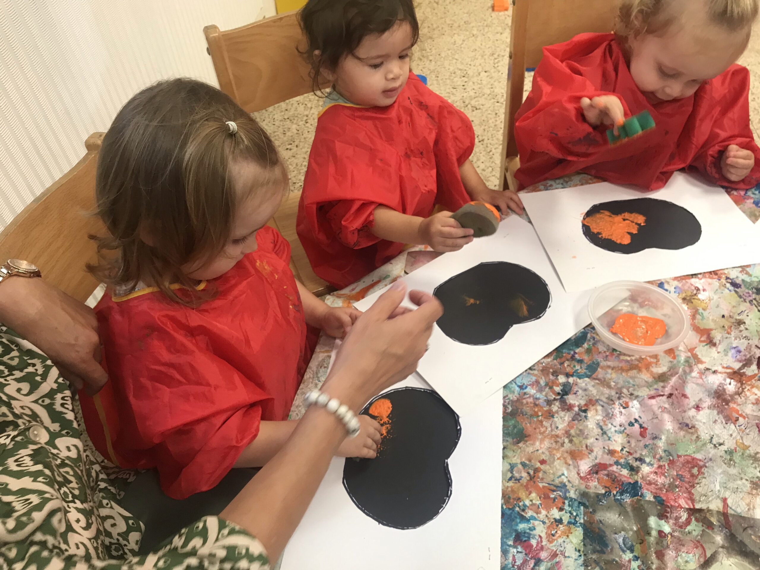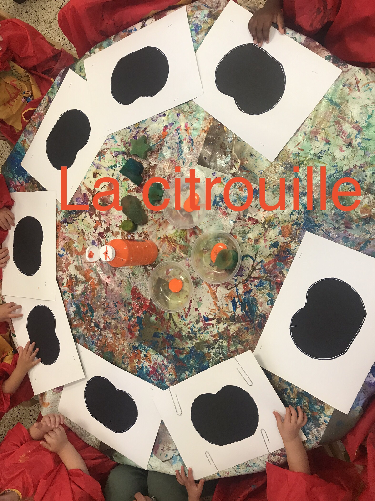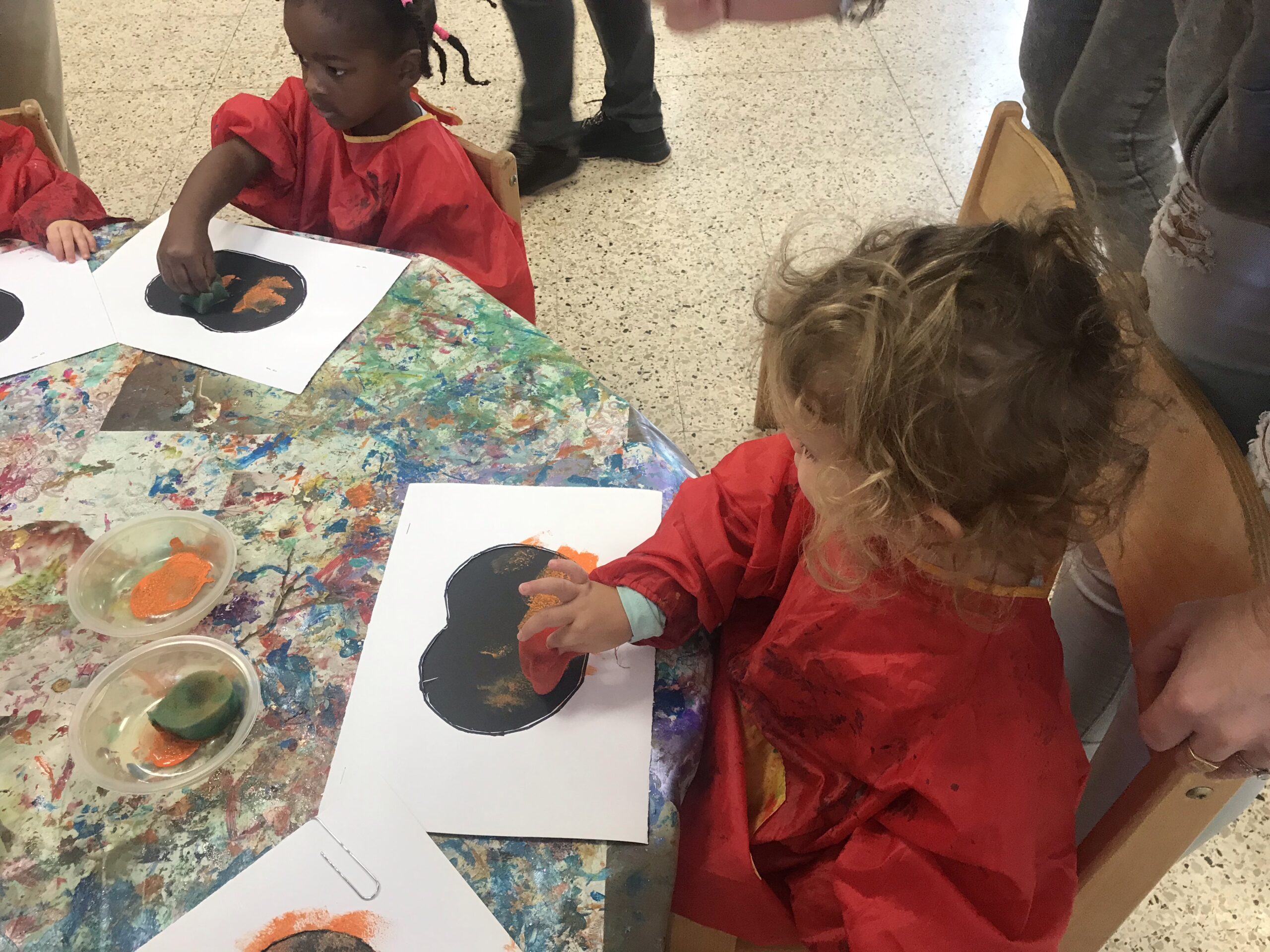 Nous avions confectionné au préalable un pochoir à la forme d’une citrouille pour y faire de la peinture à la éponge.