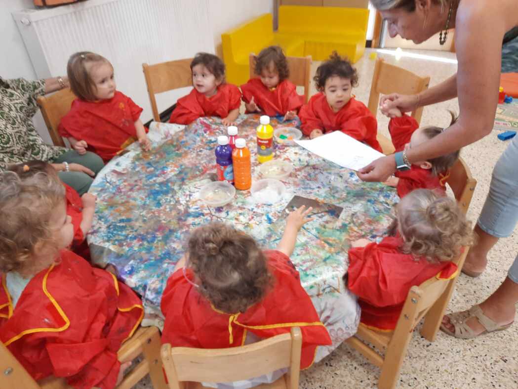 La touche de finition par les nounous avec l’aide des enfants pour le collage.