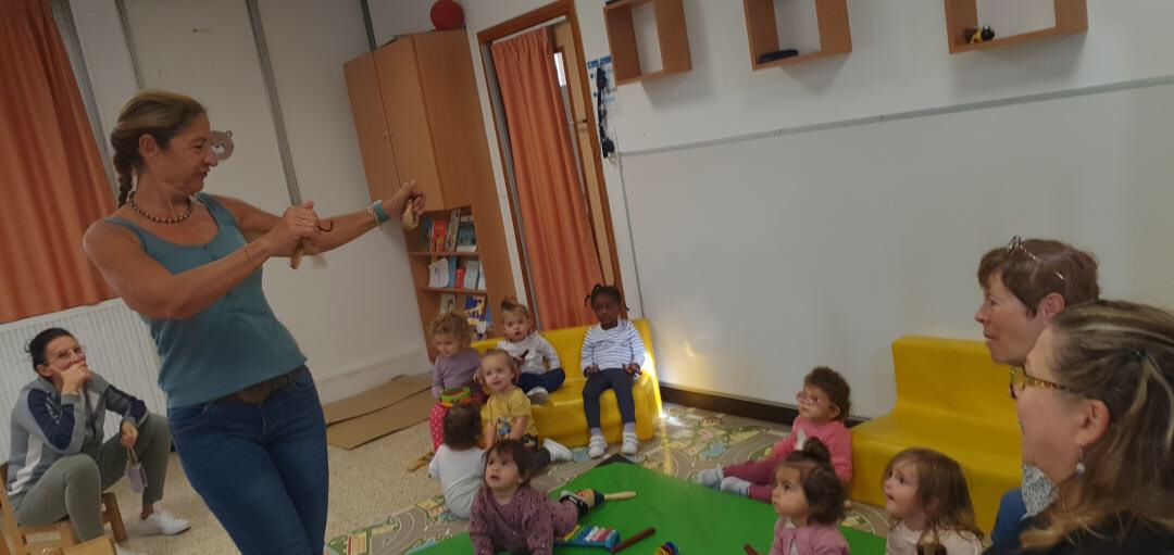 Nous avons continué à découvre d’autres instruments, des sons différents qui les ont bien fait rire comme celui de la grenouille, de l’oiseau, du canard, de la vache et jusqu’au sifflet du train.
