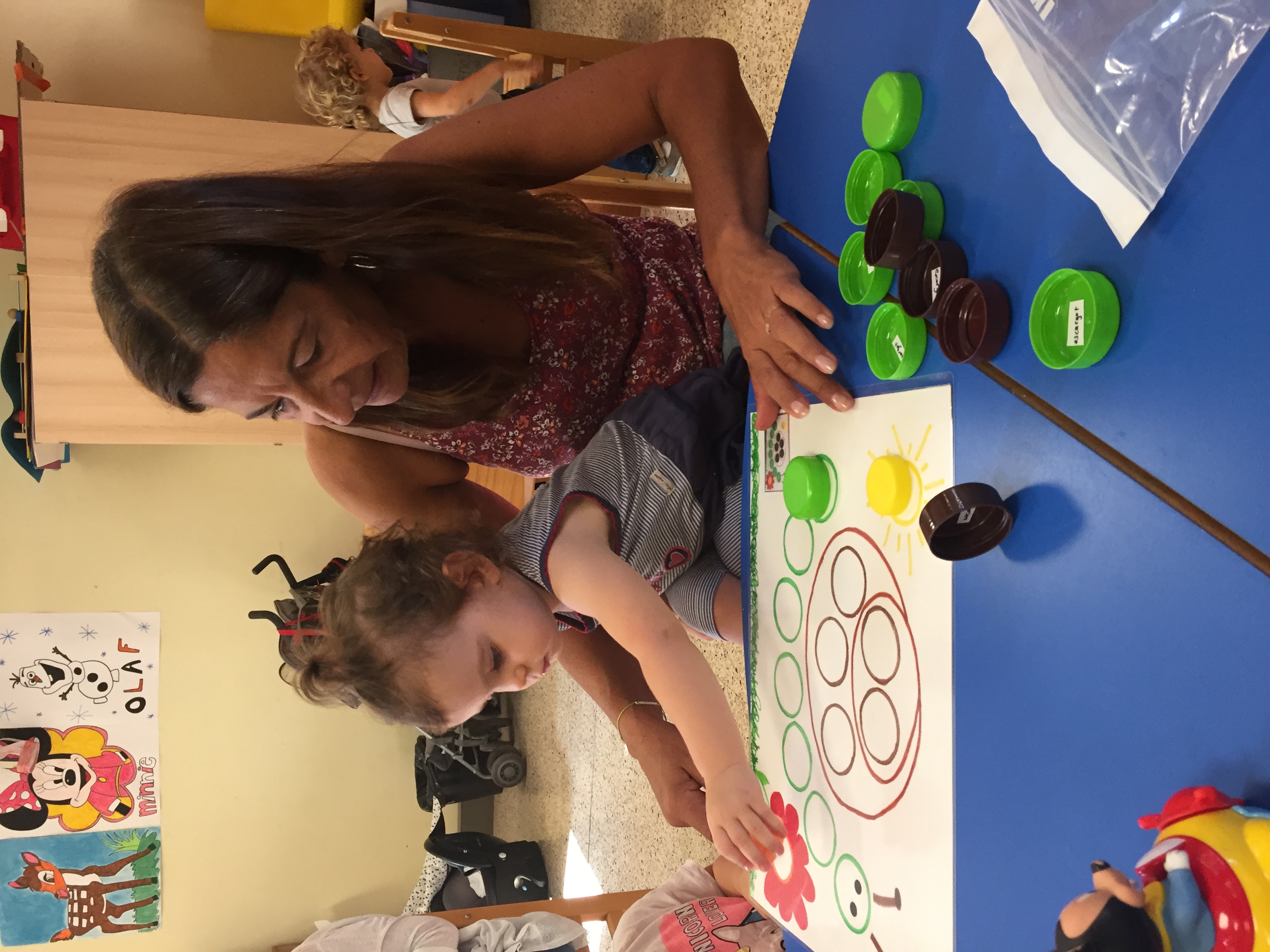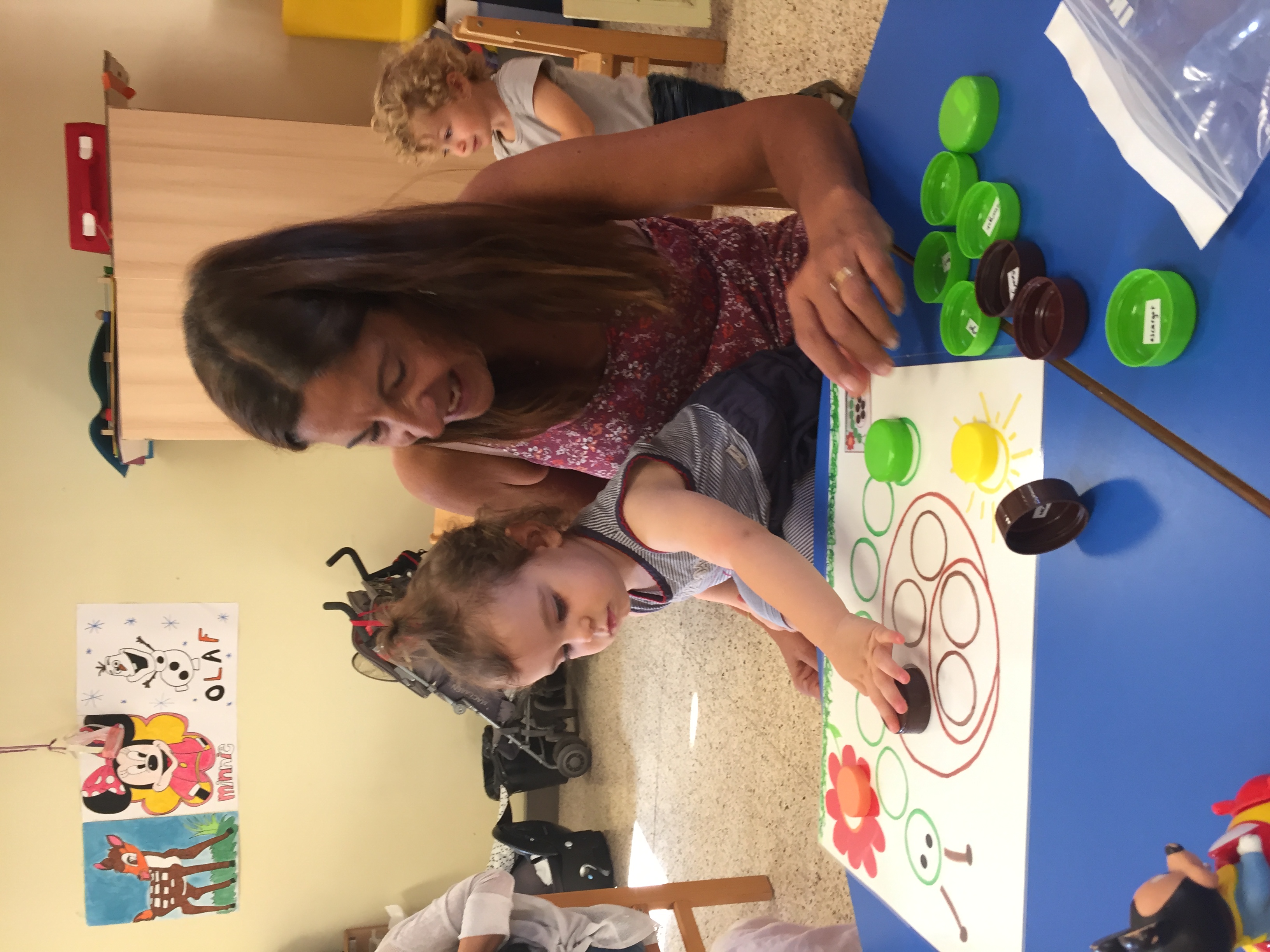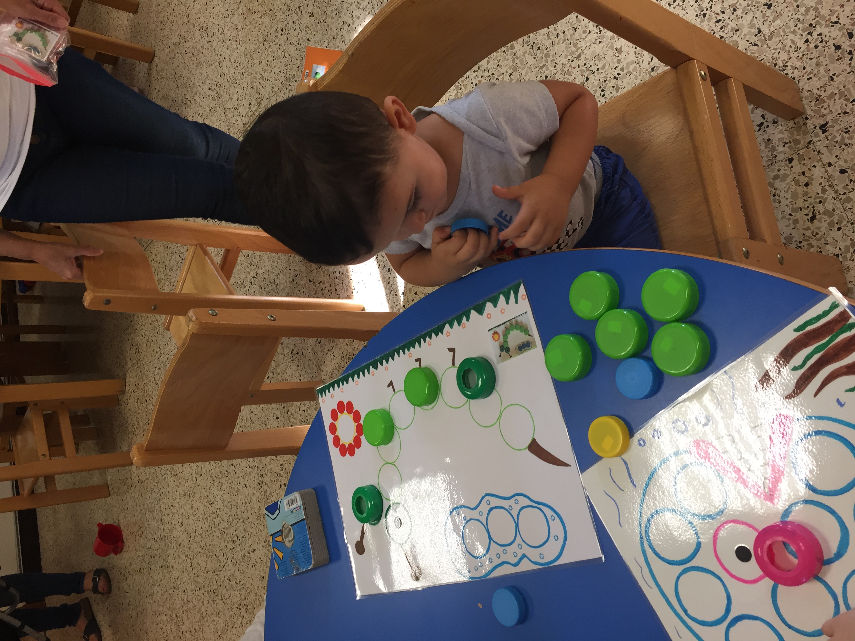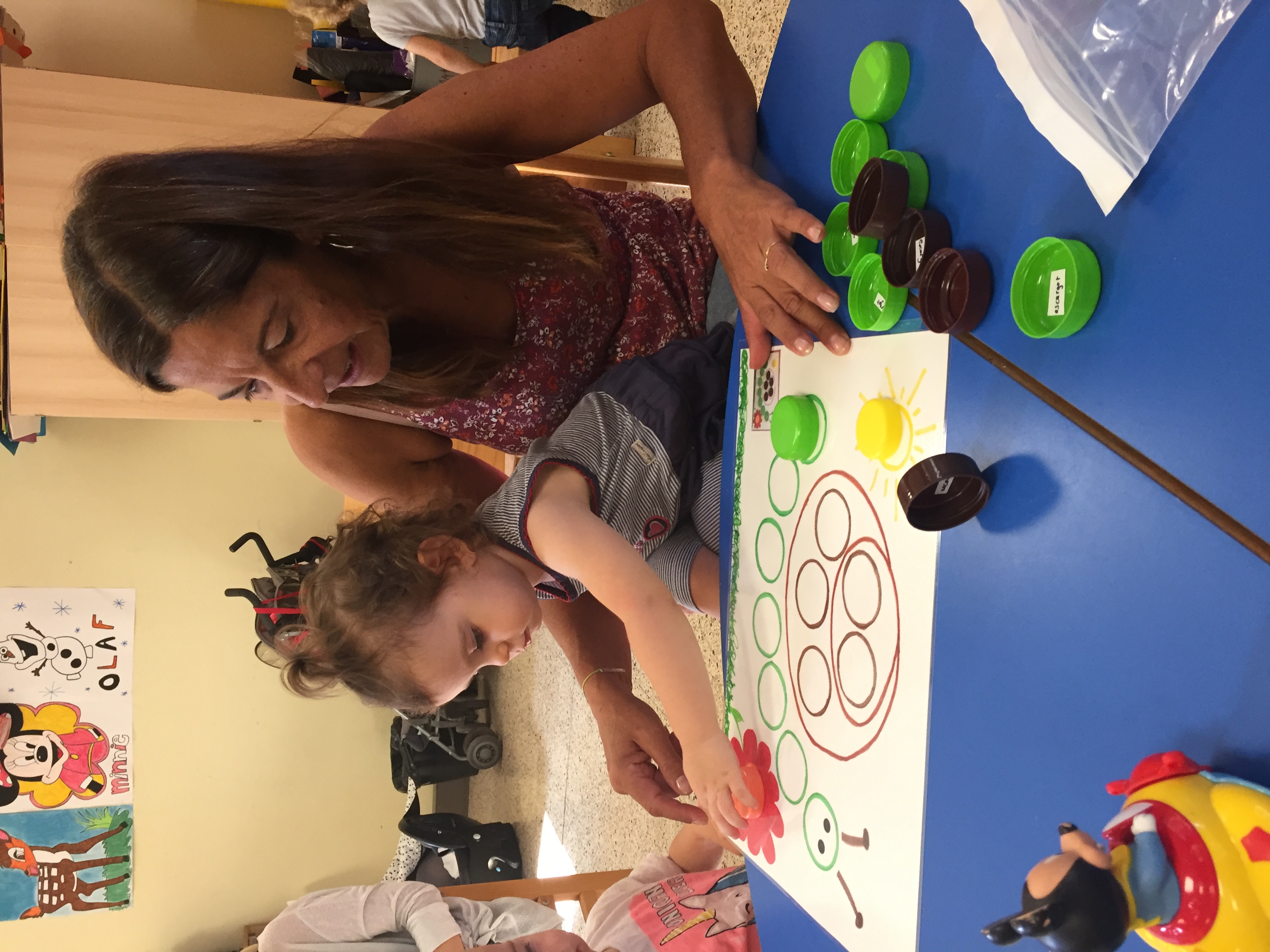 Nous étions ce matin au jardin de la petite enfance et nous avons proposé aux enfants un jeu de bouchon