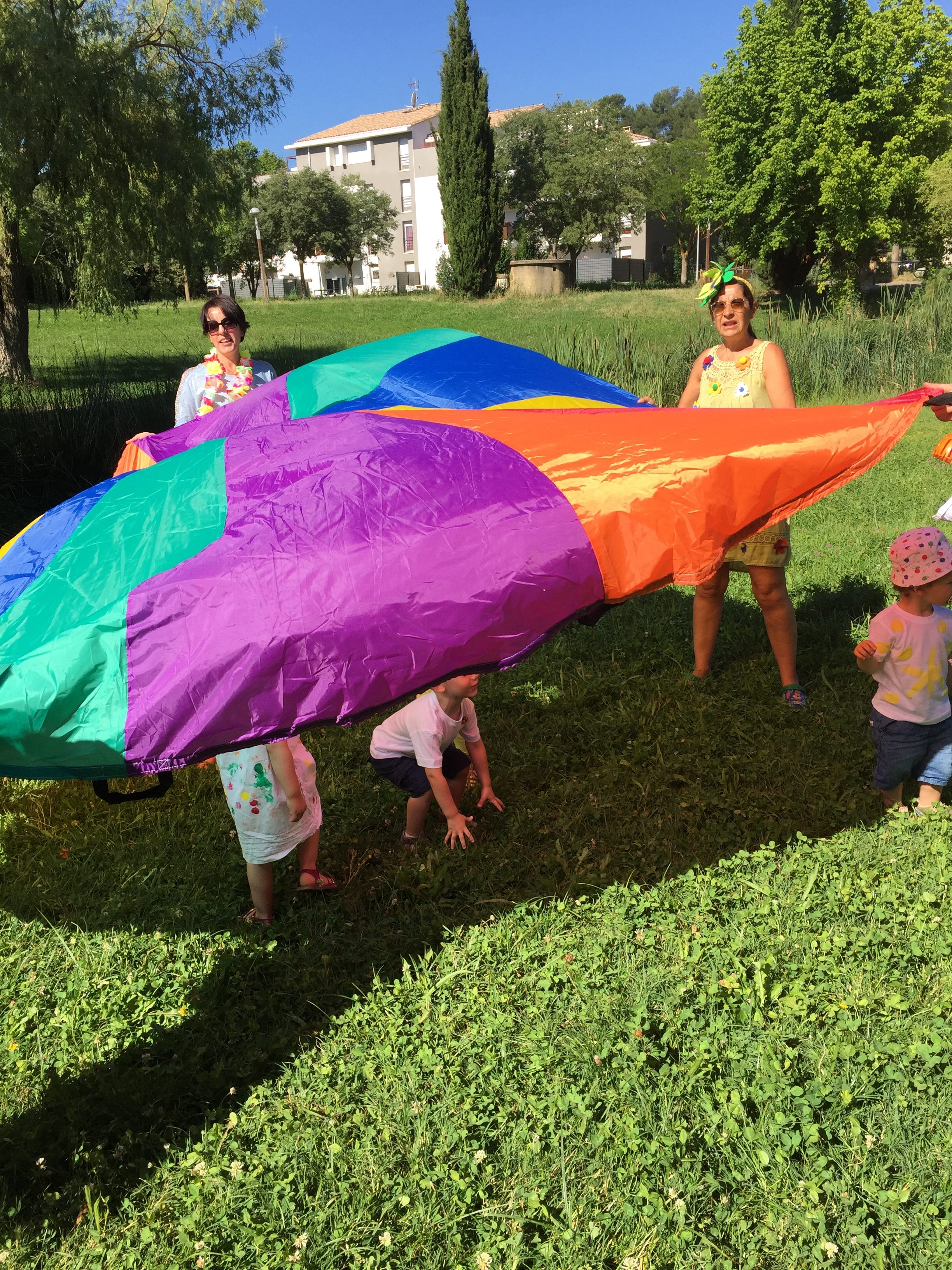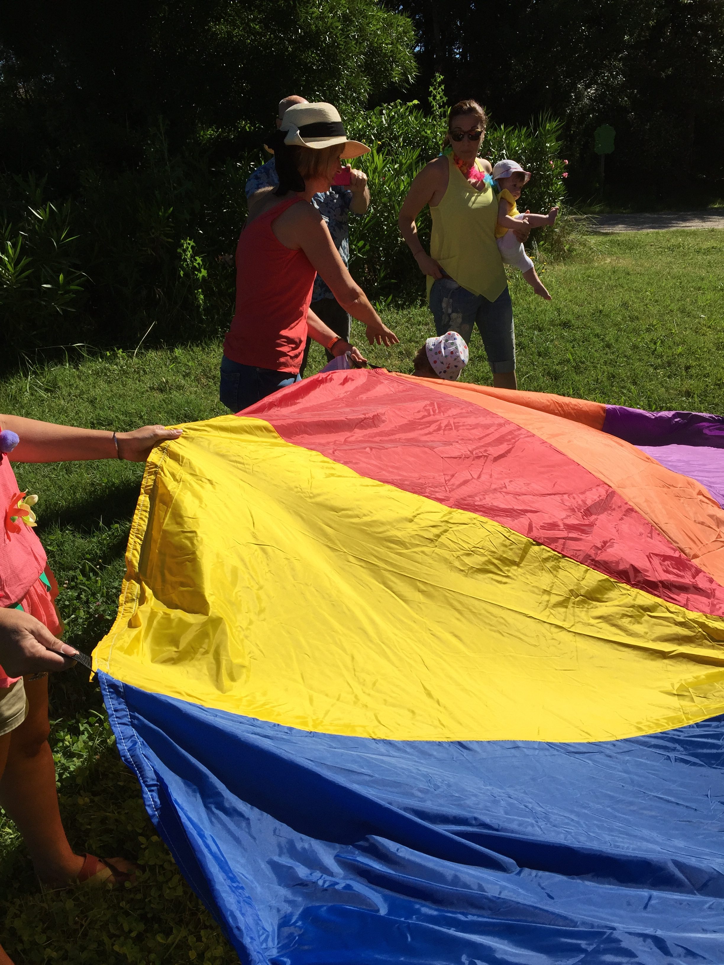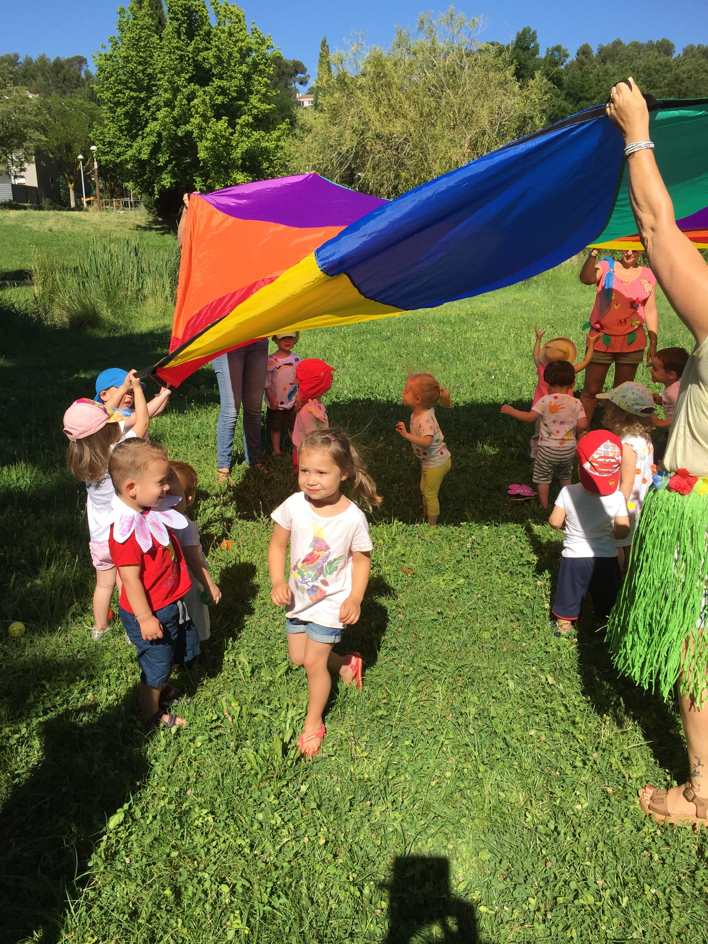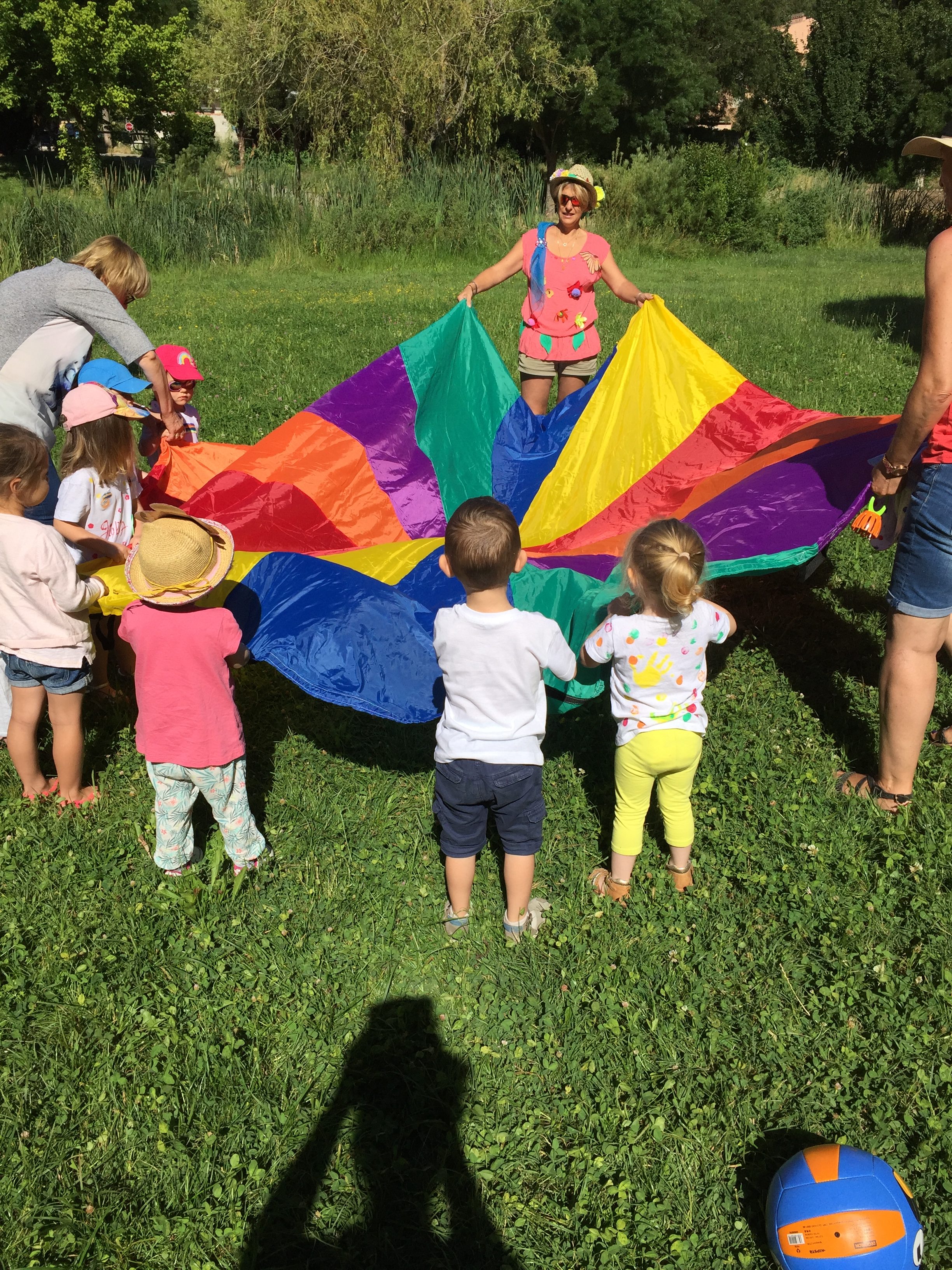 A l’ombre des arbres nous avons pu organiser des moments d’animations, comme le parachute, les piscines a balles, tunnel..