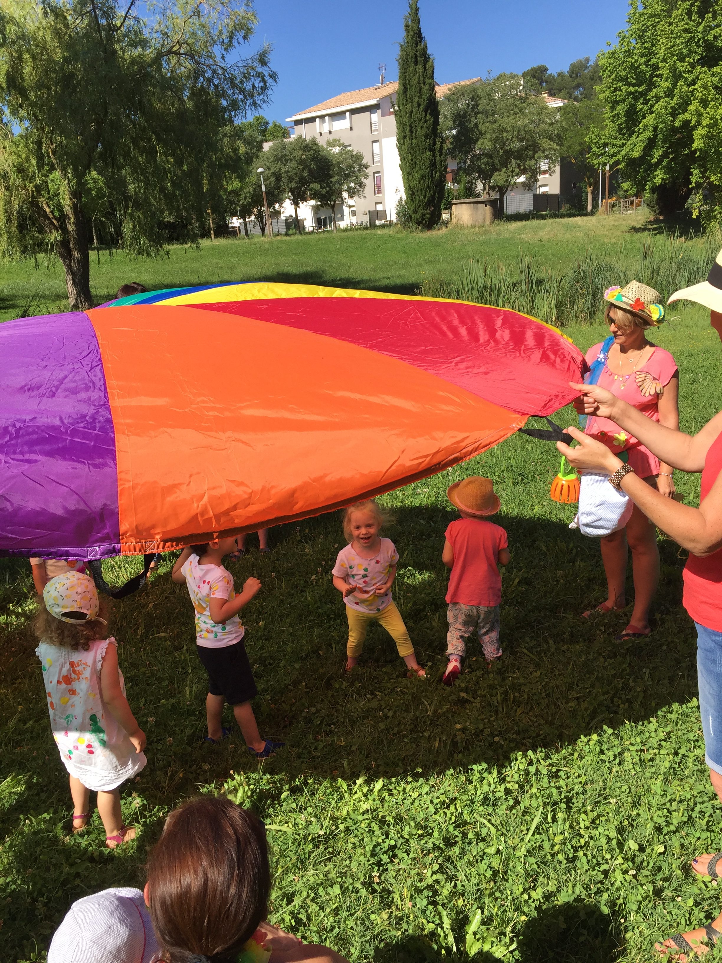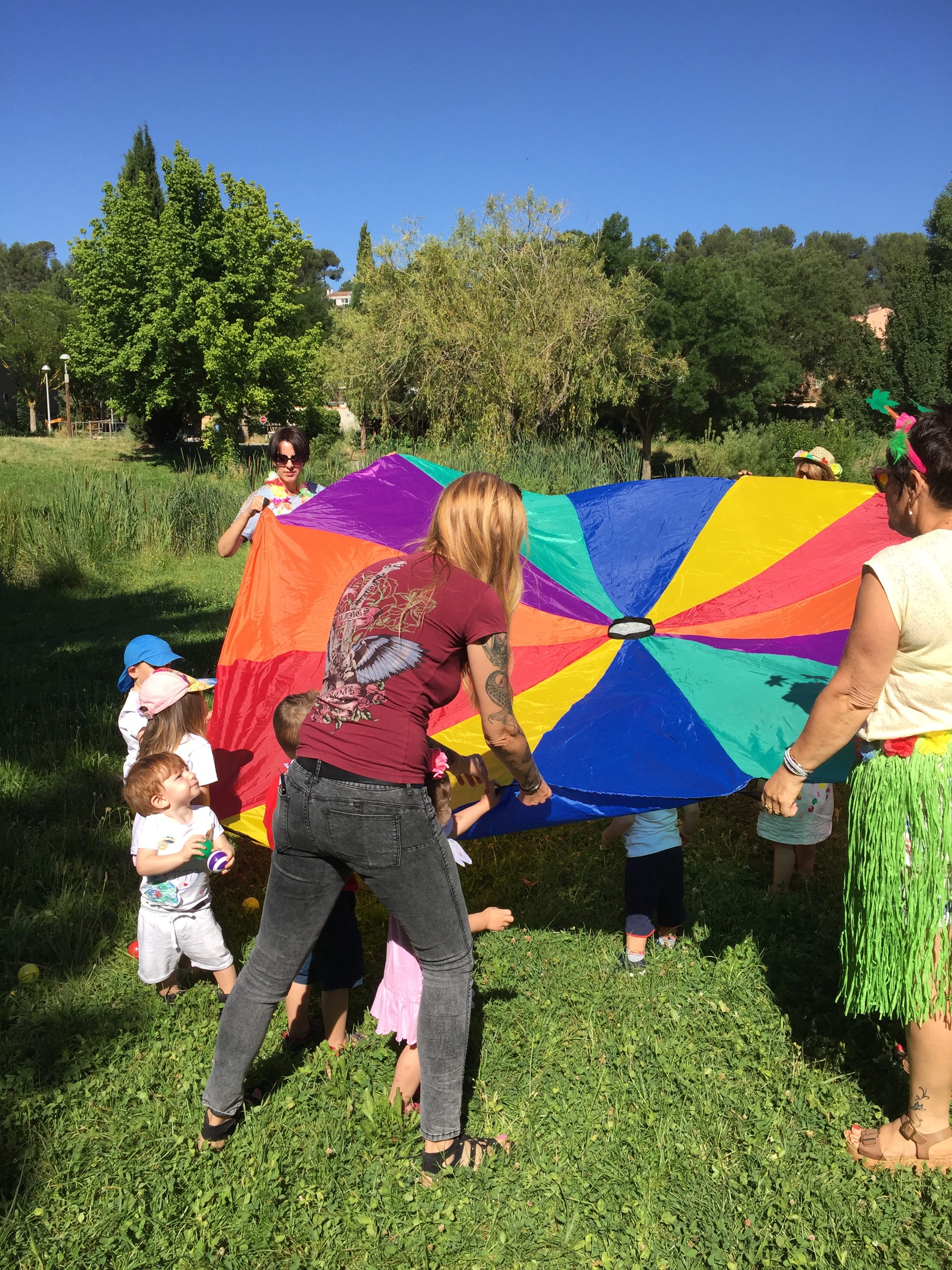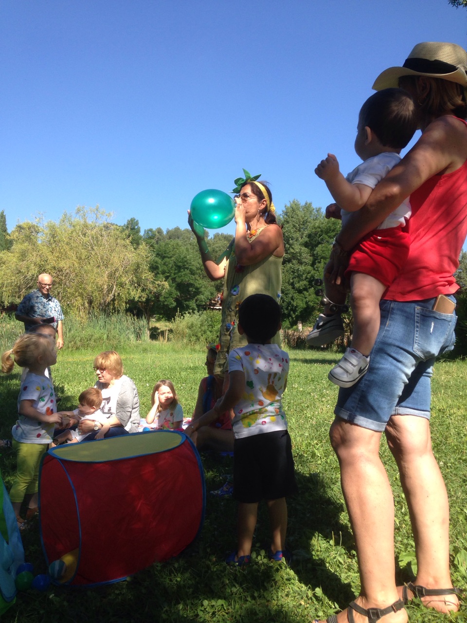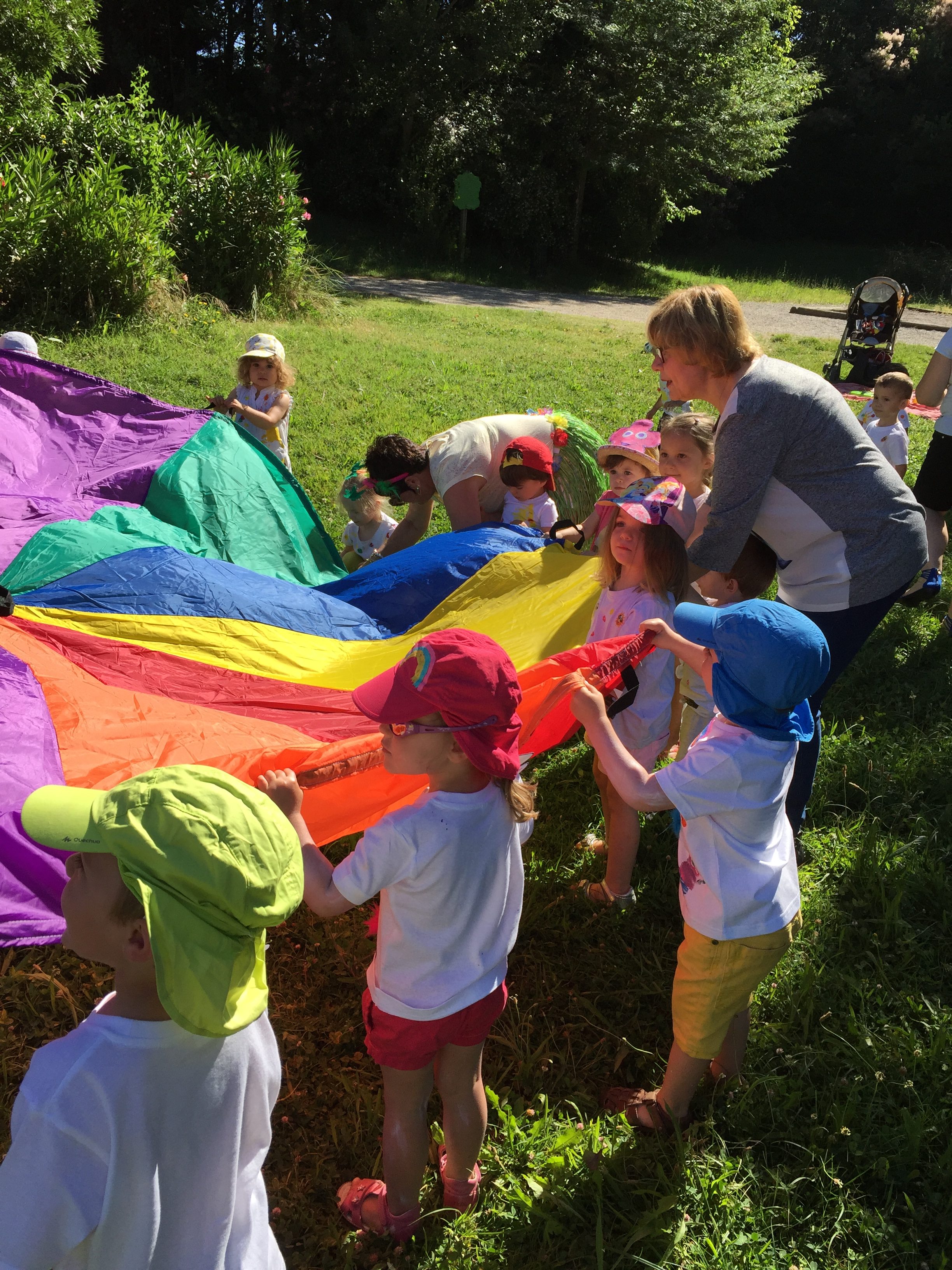 A l’ombre des arbres nous avons pu organiser des moments d’animations, comme le parachute, les piscines a balles, tunnel..