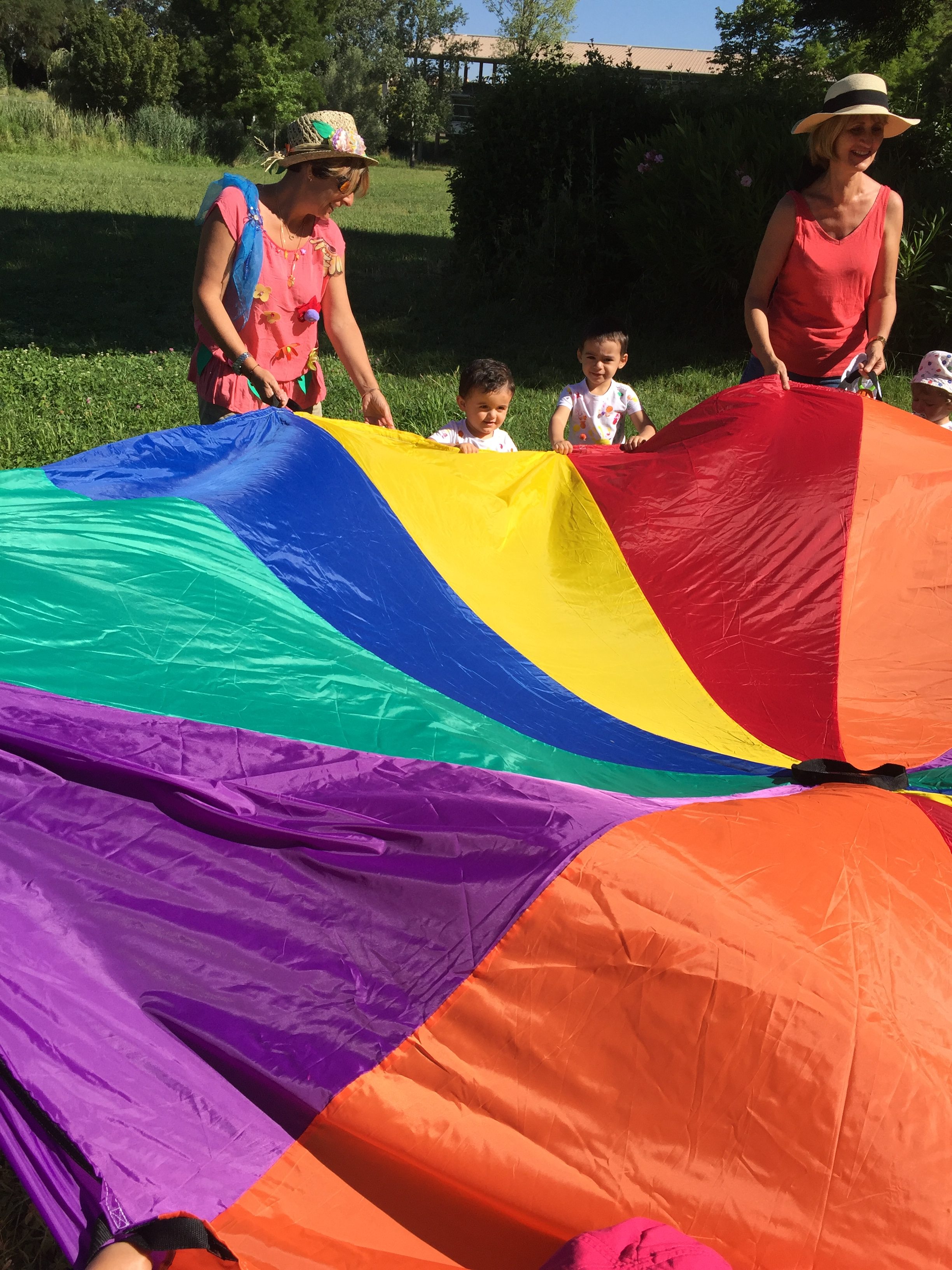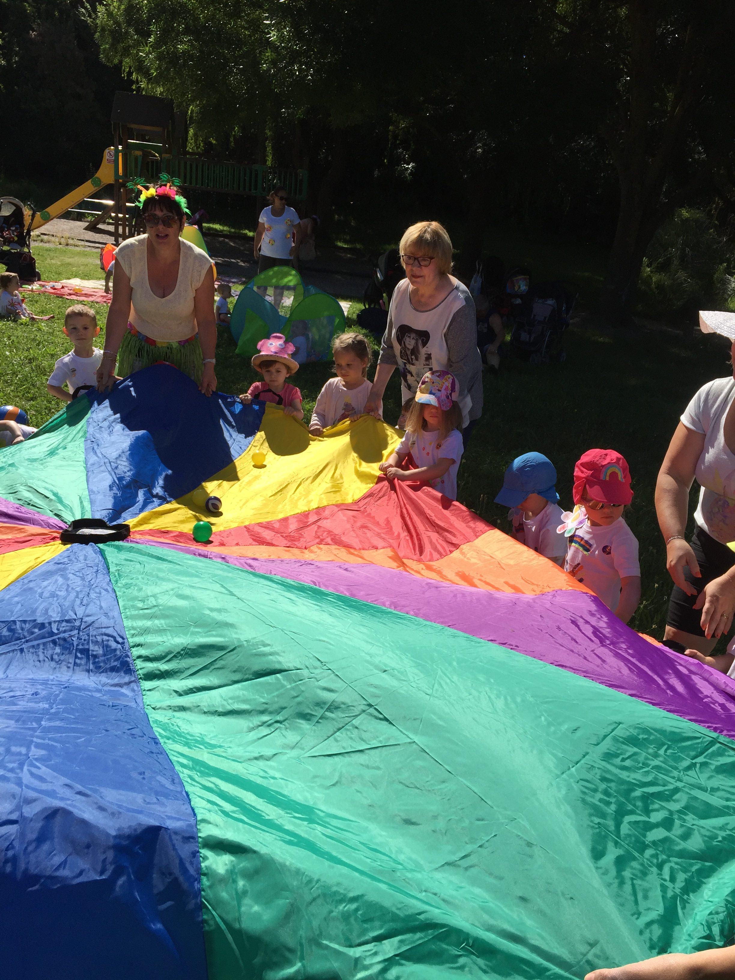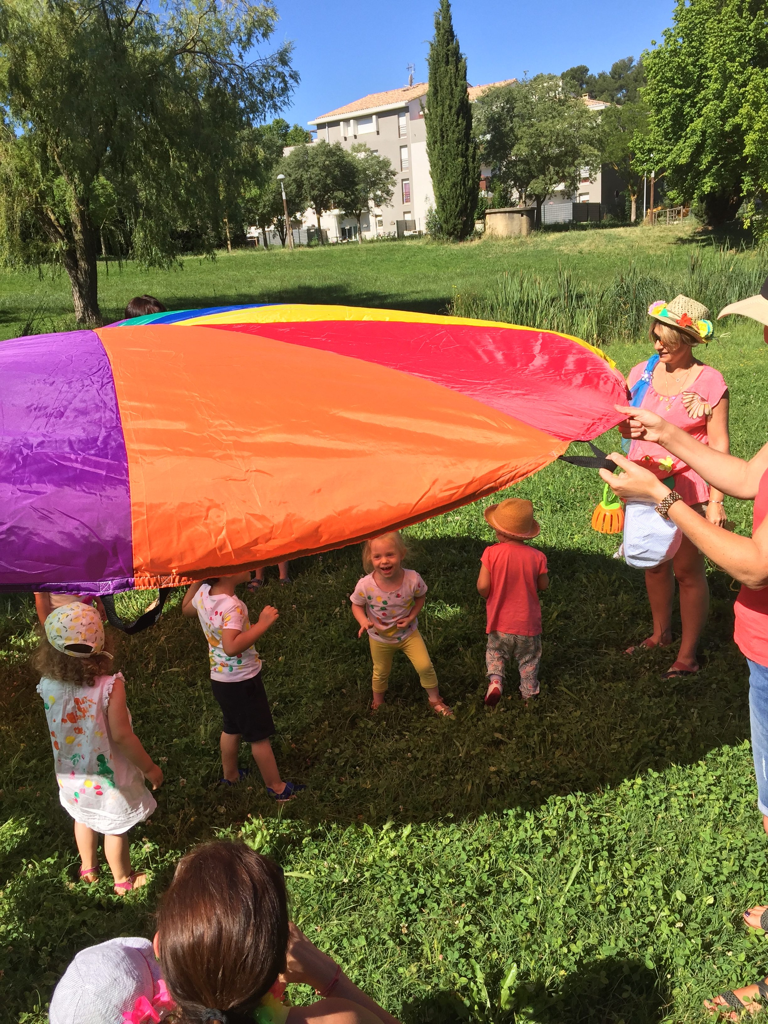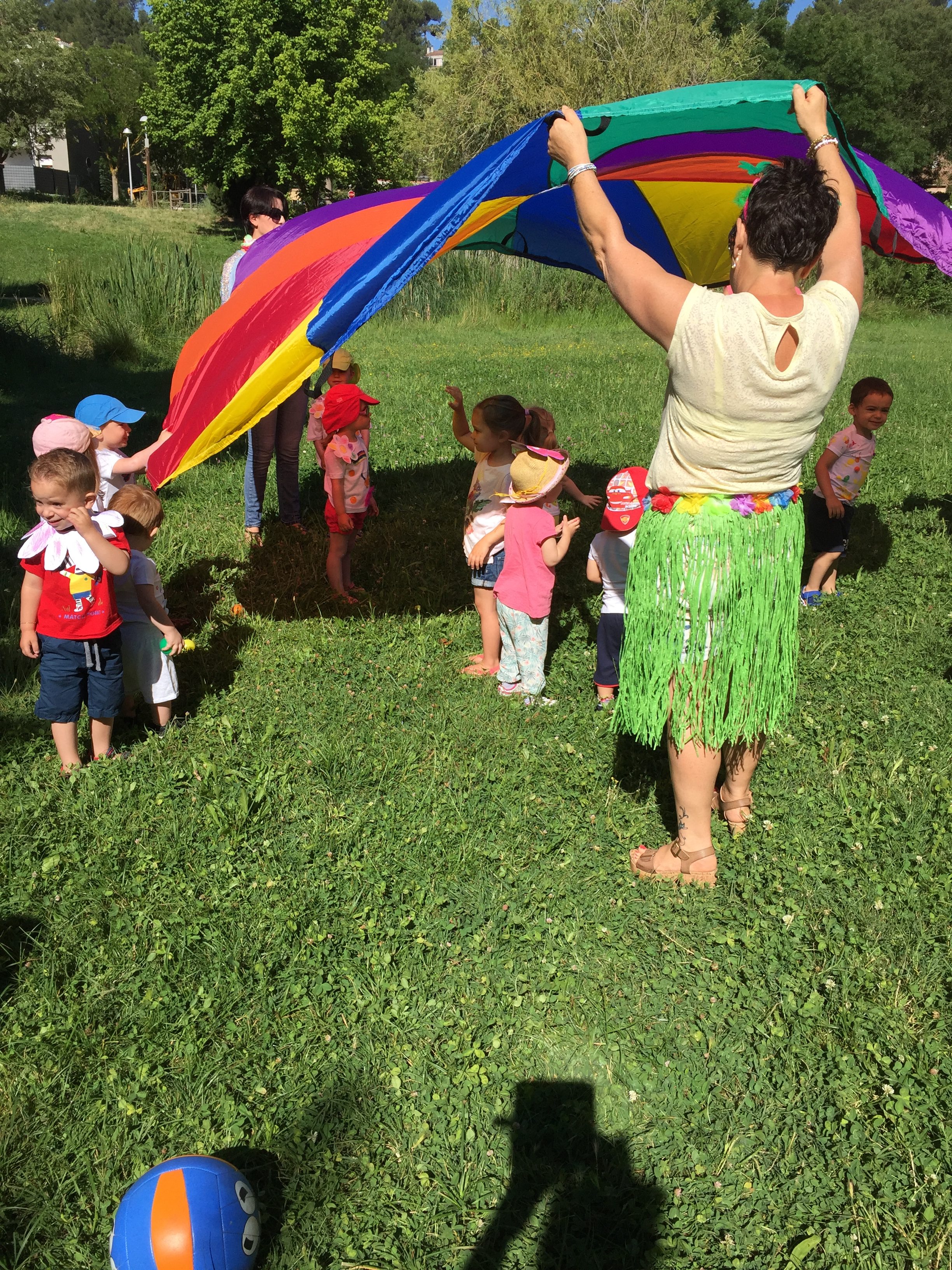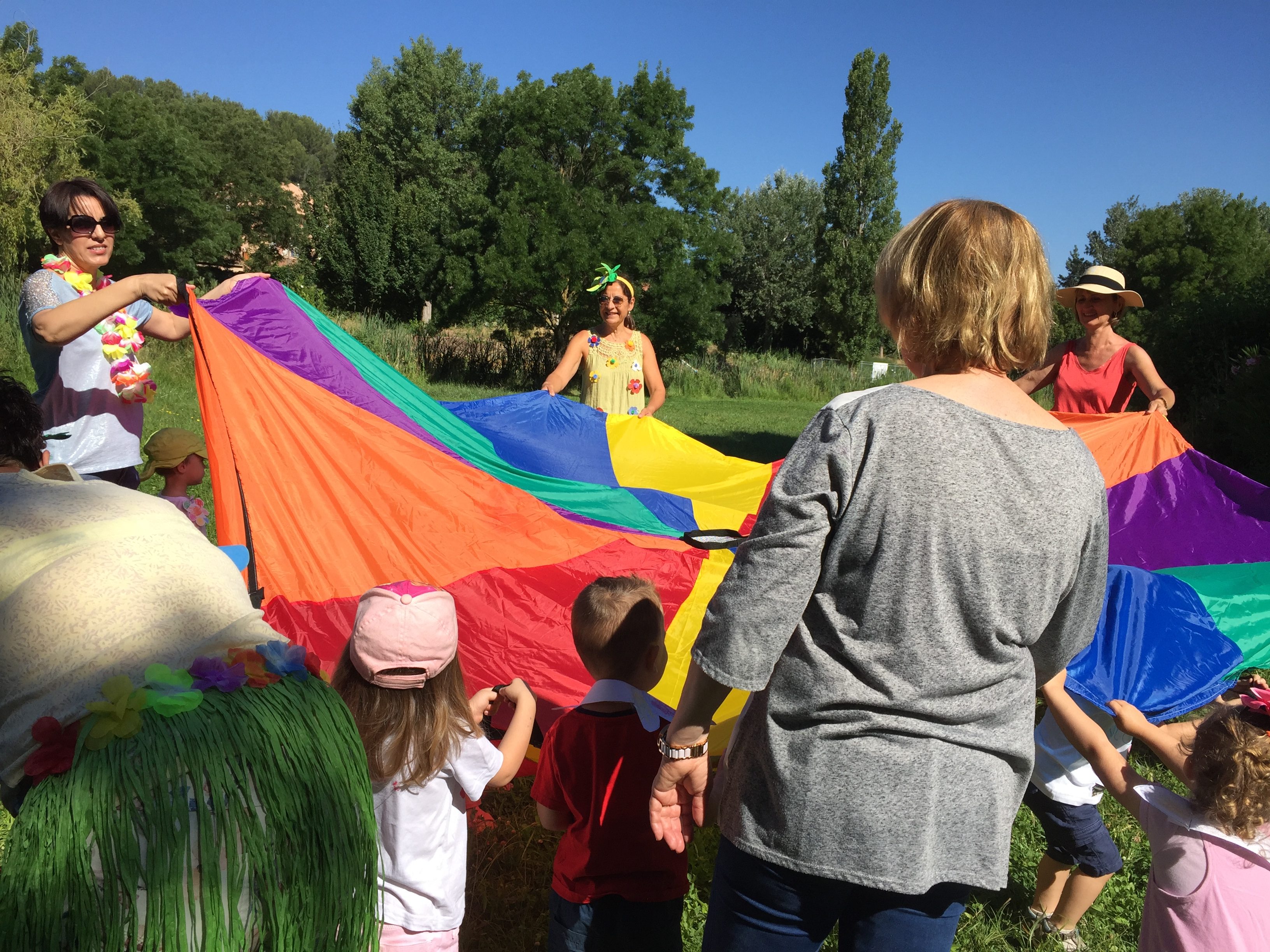 A l’ombre des arbres nous avons pu organiser des moments d’animations, comme le parachute, les piscines a balles, tunnel..