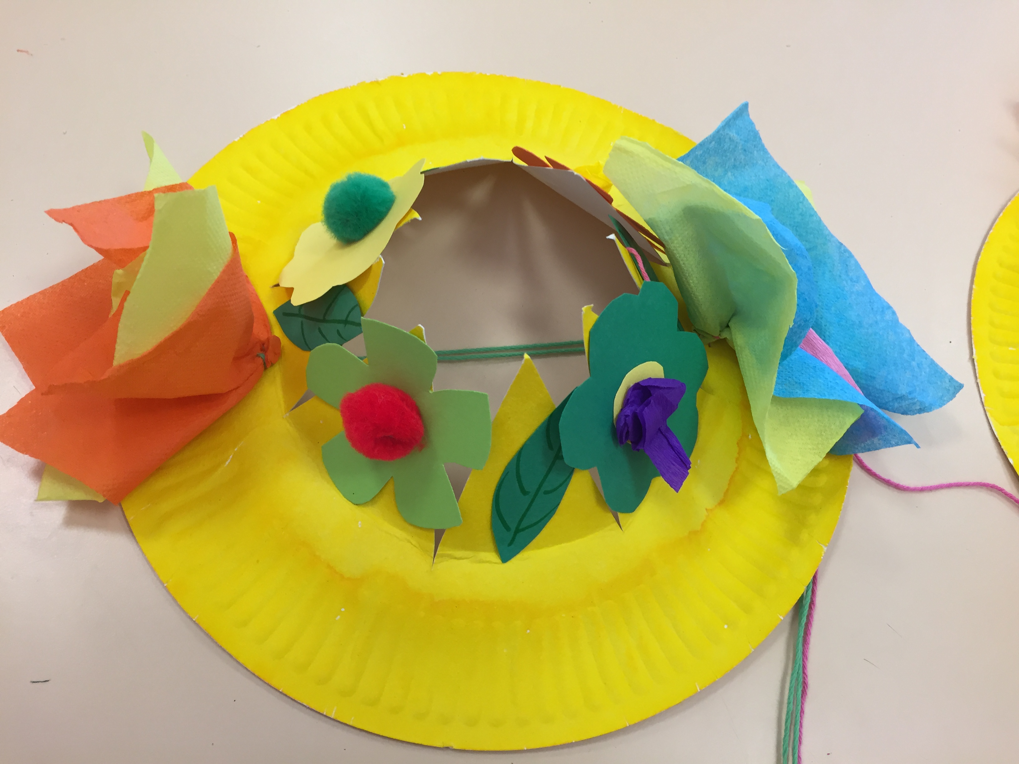 un chapeau fait avec comme base une assiette en carton, peinture, collage